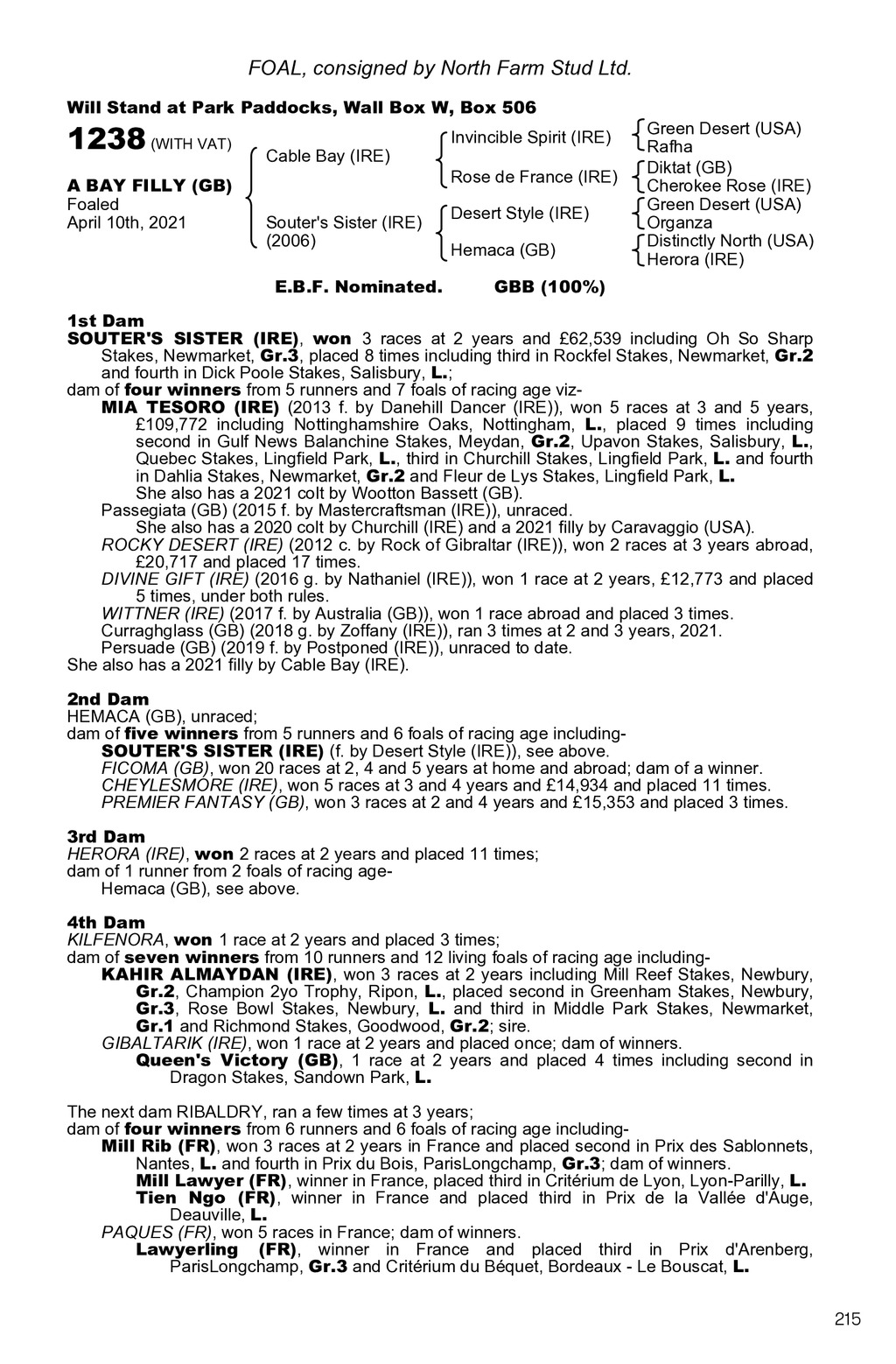 FOAL, consigned by North Farm Stud Ltd. Will Stand at Park Paddocks, Wall Box W, Box 506 1238 (WITH VAT) A BAY FILLY (GB) Foaled April 10th, 2021 Cable Bay (IRE) Souter s Sister (IRE) (2006) E.B.F. Nominated. Invincible Spirit (IRE) Rose de France (IRE) Desert Style (IRE) Hemaca (GB) Green Desert (USA) Rafha Diktat (GB) Cherokee Rose (IRE) Green Desert (USA) Organza Distinctly North (USA) Herora (IRE) GBB (100%) 1st Dam SOUTER S SISTER (IRE), won 3 races at 2 years and 62,539 including Oh So Sharp Stakes, Newmarket, Gr.3, placed 8 times including third in Rockfel Stakes, Newmarket, Gr.2 and fourth in Dick Poole Stakes, Salisbury, L.; dam of four winners from 5 runners and 7 foals of racing age vizMIA TESORO (IRE) (2013 f. by Danehill Dancer (IRE)), won 5 races at 3 and 5 years, 109,772 including Nottinghamshire Oaks, Nottingham, L., placed 9 times including second in Gulf News Balanchine Stakes, Meydan, Gr.2, Upavon Stakes, Salisbury, L., Quebec Stakes, Lingfield Park, L., third in Churchill Stakes, Lingfield Park, L. and fourth in Dahlia Stakes, Newmarket, Gr.2 and Fleur de Lys Stakes, Lingfield Park, L. She also has a 2021 colt by Wootton Bassett (GB). Passegiata (GB) (2015 f. by Mastercraftsman (IRE)), unraced. She also has a 2020 colt by Churchill (IRE) and a 2021 filly by Caravaggio (USA). ROCKY DESERT (IRE) (2012 c. by Rock of Gibraltar (IRE)), won 2 races at 3 years abroad, 20,717 and placed 17 times. DIVINE GIFT (IRE) (2016 g. by Nathaniel (IRE)), won 1 race at 2 years, 12,773 and placed 5 times, under both rules. WITTNER (IRE) (2017 f. by Australia (GB)), won 1 race abroad and placed 3 times. Curraghglass (GB) (2018 g. by Zoffany (IRE)), ran 3 times at 2 and 3 years, 2021. Persuade (GB) (2019 f. by Postponed (IRE)), unraced to date. She also has a 2021 filly by Cable Bay (IRE). 2nd Dam HEMACA (GB), unraced; dam of five winners from 5 runners and 6 foals of racing age includingSOUTER S SISTER (IRE) (f. by Desert Style (IRE)), see above. FICOMA (GB), won 20 races at 2, 4 and 5 years at home and abroad; dam of a winner. CHEYLESMORE (IRE), won 5 races at 3 and 4 years and 14,934 and placed 11 times. PREMIER FANTASY (GB), won 3 races at 2 and 4 years and 15,353 and placed 3 times. 3rd Dam HERORA (IRE), won 2 races at 2 years and placed 11 times; dam of 1 runner from 2 foals of racing ageHemaca (GB), see above. 4th Dam KILFENORA, won 1 race at 2 years and placed 3 times; dam of seven winners from 10 runners and 12 living foals of racing age includingKAHIR ALMAYDAN (IRE), won 3 races at 2 years including Mill Reef Stakes, Newbury, Gr.2, Champion 2yo Trophy, Ripon, L., placed second in Greenham Stakes, Newbury, Gr.3, Rose Bowl Stakes, Newbury, L. and third in Middle Park Stakes, Newmarket, Gr.1 and Richmond Stakes, Goodwood, Gr.2; sire. GIBALTARIK (IRE), won 1 race at 2 years and placed once; dam of winners. Queen s Victory (GB), 1 race at 2 years and placed 4 times including second in Dragon Stakes, Sandown Park, L. The next dam RIBALDRY, ran a few times at 3 years; dam of four winners from 6 runners and 6 foals of racing age includingMill Rib (FR), won 3 races at 2 years in France and placed second in Prix des Sablonnets, Nantes, L. and fourth in Prix du Bois, ParisLongchamp, Gr.3; dam of winners. Mill Lawyer (FR), winner in France, placed third in Critrium de Lyon, Lyon-Parilly, L. Tien Ngo (FR), winner in France and placed third in Prix de la Valle d Auge, Deauville, L. PAQUES (FR), won 5 races in France; dam of winners. Lawyerling (FR), winner in France and placed third in Prix d Arenberg, ParisLongchamp, Gr.3 and Critrium du Bquet, Bordeaux - Le Bouscat, L. 215