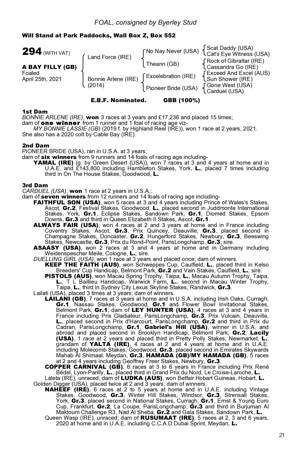 FOAL, consigned by Byerley Stud Will Stand at Park Paddocks, Wall Box Z, Box 552 294 (WITH VAT) A BAY FILLY (GB) Foaled April 25th, 2021 Land Force (IRE) Bonnie Arlene (IRE) (2014) No Nay Never (USA) Theann (GB) Excelebration (IRE) Pioneer Bride (USA) E.B.F. Nominated. Scat Daddy (USA) Cat s Eye Witness (USA) Rock of Gibraltar (IRE) Cassandra Go (IRE) Exceed And Excel (AUS) Sun Shower (IRE) Gone West (USA) Carduel (USA) GBB (100%) 1st Dam BONNIE ARLENE (IRE), won 3 races at 3 years and 17,236 and placed 15 times; dam of o n e w i n n e r from 1 runner and 1 foal of racing age vizMY BONNIE LASSIE (GB) (2019 f. by Highland Reel (IRE)), won 1 race at 2 years, 2021. She also has a 2020 colt by Cable Bay (IRE). 2nd Dam PIONEER BRIDE (USA), ran in U.S.A. at 3 years; dam of six winners from 9 runners and 14 foals of racing age includingYAMAL (IRE) (g. by Green Desert (USA)), won 7 races at 3 and 4 years at home and in U.A.E. and 143,800 including Hambleton Stakes, York, L., placed 7 times including third in On The House Stakes, Goodwood, L. 3rd Dam CARDUEL (USA), won 1 race at 2 years in U.S.A.; dam of seven winners from 12 runners and 14 foals of racing age includingFAITHFUL SON (USA), won 5 races at 3 and 4 years including Prince of Wales s Stakes, Ascot, Gr.2, Festival Stakes, Goodwood, L., placed second in Juddmonte International Stakes, York, Gr.1, Eclipse Stakes, Sandown Park, Gr.1, Diomed Stakes, Epsom Downs, Gr.3 and third in Queen Elizabeth II Stakes, Ascot, Gr.1. ALWAYS FAIR (USA), won 4 races at 2 and 3 years at home and in France including Coventry Stakes, Ascot, Gr.3, Prix Quincey, Deauville, Gr.3, placed second in Champagne Stakes, Doncaster, Gr.2, Hungerford Stakes, Newbury, Gr.3, Beeswing Stakes, Newcastle, Gr.3, Prix du Rond-Point, ParisLongchamp, Gr.3; sire. ASAASY (USA), won 2 races at 3 and 4 years at home and in Germany including Weidenspescher Meile, Cologne, L.; sire. DUELLING GIRL (USA), won 1 race at 3 years and placed once; dam of winners. KEEP THE FAITH (AUS), won Schweppes Cup, Caulfield, L., placed third in Kelso Breeders Cup Handicap, Belmont Park, Gr.2 and Vain Stakes, Caulfield, L.; sire. PISTOLS (AUS), won Macau Spring Trophy, Taipa, L., Macau Autumn Trophy, Taipa, L., T L Baillieu Handicap, Warwick Farm, L., second in Macau Winter Trophy, Taipa, L., third in Sydney City Lexus Skyline Stakes, Randwick, Gr.3. Lailati (USA), placed 3 times at 3 years; dam of winners. LAILANI (GB), 7 races at 3 years at home and in U.S.A. including Irish Oaks, Curragh, Gr.1, Nassau Stakes, Goodwood, Gr.1 and Flower Bowl Invitational Stakes, Belmont Park, Gr.1; dam of LEY HUNTER (USA), 4 races at 3 and 4 years in France including Prix Gladiateur, ParisLongchamp, Gr.3, Prix Vulcain, Deauville, L., placed second in Prix d Harcourt, ParisLongchamp, Gr.2 and third in Prix du Cadran, ParisLongchamp, Gr.1, Gabriel s Hill (USA), winner in U.S.A. and abroad and placed second in Brooklyn Handicap, Belmont Park, Gr.2, Lacily (USA), 1 race at 2 years and placed third in Pretty Polly Stakes, Newmarket, L.; grandam of YALTA (IRE), 4 races at 2 and 4 years at home and in U.A.E. including Molecomb Stakes, Goodwood, Gr.3, placed second in Emirates Skywards Mahab Al Shimaal, Meydan, Gr.3, HAMADA (GB)/MY HAMADA (GB), 5 races at 2 and 4 years including Geoffrey Freer Stakes, Newbury, Gr.3. COPPER CARNIVAL (GB), 6 races at 3 to 6 years in France including Prix Ren Bdel, Lyon-Parilly, L., placed third in Grand Prix du Nord, Le Croise-Laroche, L. Laleta (IRE), unraced; dam of LUDKA (AUS), won Betfair Hobart Guineas, Hobart, L. Golden Digger (USA), placed twice at 2 and 3 years; dam of winners. NAHEEF (IRE), 6 races at 2 to 5 years at home and in U.A.E. including Vintage Stakes, Goodwood, Gr.3, Winter Hill Stakes, Windsor, Gr.3, Strensall Stakes, York, Gr.3, placed second in National Stakes, Curragh, Gr.1, Ernst & Young Euro Cup, Frankfurt, Gr.2, La Coupe, ParisLongchamp, Gr.3 and third in Burjuman Al Maktoum Challenge R3, Nad Al Sheba, Gr.2 and Gala Stakes, Sandown Park, L. Queen Wasp (IRE), unraced; dam of RUSUMAAT (IRE), 5 races at 2, 3 and 6 years, 2020 at home and in U.A.E. including C.C.A.D.Dubai Sprint, Meydan, L. 21