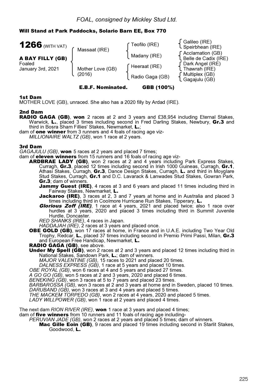 FOAL, consigned by Mickley Stud Ltd. Will Stand at Park Paddocks, Solario Barn EE, Box 770 1266 (WITH VAT) A BAY FILLY (GB) Foaled January 3rd, 2021 Massaat (IRE) Mother Love (GB) (2016) E.B.F. Nominated. Teofilo (IRE) Madany (IRE) Heeraat (IRE) Radio Gaga (GB) Galileo (IRE) Speirbhean (IRE) Acclamation (GB) Belle de Cadix (IRE) Dark Angel (IRE) Thawrah (IRE) Multiplex (GB) Gagajulu (GB) GBB (100%) 1st Dam MOTHER LOVE (GB), unraced. She also has a 2020 filly by Ardad (IRE). 2nd Dam RADIO GAGA (GB), won 2 races at 2 and 3 years and 38,954 including Eternal Stakes, Warwick, L., placed 3 times including second in Fred Darling Stakes, Newbury, Gr.3 and third in Bosra Sham Fillies Stakes, Newmarket, L.; dam of one winner from 3 runners and 4 foals of racing age vizMILLIONAIRE WALTZ (GB), won 1 race at 2 years. 3rd Dam GAGAJULU (GB), won 5 races at 2 years and placed 7 times; dam of eleven winners from 15 runners and 16 foals of racing age vizARDBRAE LADY (GB), won 2 races at 2 and 4 years including Park Express Stakes, Curragh, Gr.3, placed 12 times including second in Irish 1000 Guineas, Curragh, Gr.1, Athasi Stakes, Curragh, Gr.3, Dance Design Stakes, Curragh, L. and third in Moyglare Stud Stakes, Curragh, Gr.1 and D.C. Lavarack & Lanwades Stud Stakes, Gowran Park, Gr.3; dam of winners. Jammy Guest (IRE), 4 races at 3 and 6 years and placed 11 times including third in Fairway Stakes, Newmarket, L. Jackaroo (IRE), 3 races at 2, 3 and 7 years at home and in Australia and placed 3 times including third in Coolmore Hurricane Run Stakes, Tipperary, L. Glorious Zoff (IRE), 1 race at 4 years, 2021 and placed twice; also 1 race over hurdles at 3 years, 2020 and placed 3 times including third in Summit Juvenile Hurdle, Doncaster. RED SHANKS (IRE), 4 races in Japan. HADDAJAH (IRE), 2 races at 3 years and placed once. OBE GOLD (GB), won 17 races at home, in France and in U.A.E. including Two Year Old Trophy, Redcar, L., placed 37 times including second in Premio Primi Passi, Milan, Gr.3 and European Free Handicap, Newmarket, L. RADIO GAGA (GB), see above. Under My Spell (GB), won 2 races at 2 and 3 years and placed 12 times including third in National Stakes, Sandown Park, L.; dam of winners. MAJOR VALENTINE (GB), 15 races to 2021 and placed 20 times. DALNESS EXPRESS (GB), 1 race at 5 years and placed 10 times. OBE ROYAL (GB), won 6 races at 4 and 5 years and placed 27 times. A GO GO (GB), won 5 races at 2 and 3 years, 2020 and placed 6 times. BENEKING (GB), won 3 races at 5 to 7 years and placed 23 times. BARBAROSSA (GB), won 3 races at 2 and 3 years at home and in Sweden, placed 10 times. DARUBAND (GB), won 3 races at 3 and 4 years and placed 5 times. THE MACKEM TORPEDO (GB), won 2 races at 4 years, 2020 and placed 5 times. LADY WILLPOWER (GB), won 1 race at 2 years and placed 4 times. The next dam RION RIVER (IRE), won 1 race at 3 years and placed 4 times; dam of five winners from 10 runners and 11 foals of racing age includingPERUVIAN JADE (GB), won 2 races at 2 years and placed 5 times; dam of winners. Mac Gille Eoin (GB), 9 races and placed 19 times including second in Starlit Stakes, Goodwood, L. 225