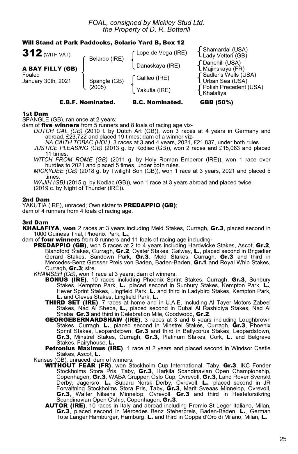 FOAL, consigned by Mickley Stud Ltd. the Property of D. R. Botterill Will Stand at Park Paddocks, Solario Yard B, Box 12 312 (WITH VAT) A BAY FILLY (GB) Foaled January 30th, 2021 Belardo (IRE) Spangle (GB) (2005) E.B.F. Nominated. Lope de Vega (IRE) Danaskaya (IRE) Galileo (IRE) Yakutia (IRE) B.C. Nominated. Shamardal (USA) Lady Vettori (GB) Danehill (USA) Majinskaya (FR) Sadler s Wells (USA) Urban Sea (USA) Polish Precedent (USA) Khalafiya GBB (50%) 1st Dam SPANGLE (GB), ran once at 2 years; dam of five winners from 5 runners and 8 foals of racing age vizDUTCH GAL (GB) (2010 f. by Dutch Art (GB)), won 3 races at 4 years in Germany and abroad, 23,722 and placed 19 times; dam of a winner vizNA CAITH TOBAC (HOL), 3 races at 3 and 4 years, 2021, 21,837, under both rules. JUSTICE PLEASING (GB) (2013 g. by Kodiac (GB)), won 2 races and 15,063 and placed 11 times. WITCH FROM ROME (GB) (2011 g. by Holy Roman Emperor (IRE)), won 1 race over hurdles to 2021 and placed 5 times, under both rules. MICKYDEE (GB) (2018 g. by Twilight Son (GB)), won 1 race at 3 years, 2021 and placed 5 times. WAJIH (GB) (2015 g. by Kodiac (GB)), won 1 race at 3 years abroad and placed twice. (2019 c. by Night of Thunder (IRE)). 2nd Dam YAKUTIA (IRE), unraced; Own sister to PREDAPPIO (GB); dam of 4 runners from 4 foals of racing age. 3rd Dam KHALAFIYA, won 2 races at 3 years including Meld Stakes, Curragh, Gr.3, placed second in 1000 Guineas Trial, Phoenix Park, L.; dam of four winners from 8 runners and 11 foals of racing age includingPREDAPPIO (GB), won 5 races at 2 to 4 years including Hardwicke Stakes, Ascot, Gr.2, Blandford Stakes, Curragh, Gr.2, Oyster Stakes, Galway, L., placed second in Brigadier Gerard Stakes, Sandown Park, Gr.3, Meld Stakes, Curragh, Gr.3 and third in Mercedes-Benz Grosser Preis von Baden, Baden-Baden, Gr.1 and Royal Whip Stakes, Curragh, Gr.3; sire. KHAMSEH (GB), won 1 race at 3 years; dam of winners. BONUS (IRE), 10 races including Phoenix Sprint Stakes, Curragh, Gr.3, Sunbury Stakes, Kempton Park, L., placed second in Sunbury Stakes, Kempton Park, L., Hever Sprint Stakes, Lingfield Park, L. and third in Ladybird Stakes, Kempton Park, L. and Cleves Stakes, Lingfield Park, L. THIRD SET (IRE), 7 races at home and in U.A.E. including Al Tayer Motors Zabeel Stakes, Nad Al Sheba, L., placed second in Dubal Al Rashidiya Stakes, Nad Al Sheba, Gr.3 and third in Celebration Mile, Goodwood, Gr.2. GEORGEBERNARDSHAW (IRE), 3 races at 3 and 6 years including Loughbrown Stakes, Curragh, L., placed second in Minstrel Stakes, Curragh, Gr.3, Phoenix Sprint Stakes, Leopardstown, Gr.3 and third in Ballycorus Stakes, Leopardstown, Gr.3, Minstrel Stakes, Curragh, Gr.3, Platinum Stakes, Cork, L. and Belgrave Stakes, Fairyhouse, L. Petronius Maximus (IRE), 1 race at 2 years and placed second in Windsor Castle Stakes, Ascot, L. Kansas (GB), unraced; dam of winners. WITHOUT FEAR (FR), won Stockholm Cup International, Taby, Gr.3, IKC Fonder Stockholms Stora Pris, Taby, Gr.3, Harkila Scandinavian Open Championship, Copenhagen, Gr.3, WABA Gruppen Oslo Cup, Ovrevoll, Gr.3, Land Rover Svenskt Derby, Jagersro, L., Subaru Norsk Derby, Ovrevoll, L., placed second in JR Forvaltning Stockholms Stora Pris, Taby, Gr.3, Marit Sveaas Minnelop, Ovrevoll, Gr.3, Walter Nilsens Minnelop, Ovrevoll, Gr.3 and third in Hesteforsikring Scandinavian Open C ship, Copenhagen, Gr.3. AUTOR (IRE), 10 races in Italy and abroad including Premio St Leger Italiano, Milan, Gr.3, placed second in Mercedes Benz Steherpreis, Baden-Baden, L., German Tote Langer Hamburger, Hamburg, L. and third in Coppa d Oro di Milano, Milan, L. 25