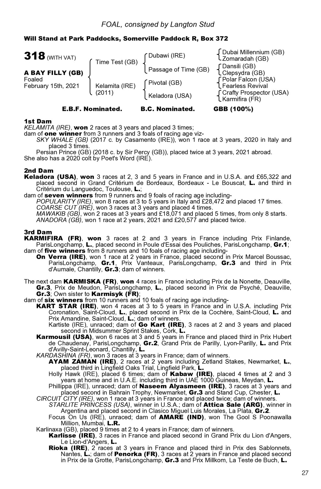 FOAL, consigned by Langton Stud Will Stand at Park Paddocks, Somerville Paddock R, Box 372 318 (WITH VAT) A BAY FILLY (GB) Foaled February 15th, 2021 Time Test (GB) Kelamita (IRE) (2011) E.B.F. Nominated. Dubawi (IRE) Passage of Time (GB) Pivotal (GB) Keladora (USA) B.C. Nominated. Dubai Millennium (GB) Zomaradah (GB) Dansili (GB) Clepsydra (GB) Polar Falcon (USA) Fearless Revival Crafty Prospector (USA) Karmifira (FR) GBB (100%) 1st Dam KELAMITA (IRE), won 2 races at 3 years and placed 3 times; dam of one winner from 3 runners and 3 foals of racing age vizSKY WHALE (GB) (2017 c. by Casamento (IRE)), won 1 race at 3 years, 2020 in Italy and placed 3 times. Persian Prince (GB) (2018 c. by Sir Percy (GB)), placed twice at 3 years, 2021 abroad. She also has a 2020 colt by Poet s Word (IRE). 2nd Dam Keladora (USA), won 3 races at 2, 3 and 5 years in France and in U.S.A. and 65,322 and placed second in Grand Critrium de Bordeaux, Bordeaux - Le Bouscat, L. and third in Critrium du Languedoc, Toulouse, L.; dam of seven winners from 9 runners and 9 foals of racing age includingPOPULARITY (IRE), won 8 races at 3 to 5 years in Italy and 28,472 and placed 17 times. COARSE CUT (IRE), won 3 races at 3 years and placed 4 times. MAWAKIB (GB), won 2 races at 3 years and 18,071 and placed 5 times, from only 8 starts. ANADORA (GB), won 1 race at 2 years, 2021 and 20,577 and placed twice. 3rd Dam KARMIFIRA (FR), won 3 races at 2 and 3 years in France including Prix Finlande, ParisLongchamp, L., placed second in Poule d Essai des Pouliches, ParisLongchamp, Gr.1; dam of five winners from 8 runners and 10 foals of racing age includingOn Verra (IRE), won 1 race at 2 years in France, placed second in Prix Marcel Boussac, ParisLongchamp, Gr.1, Prix Vanteaux, ParisLongchamp, Gr.3 and third in Prix d Aumale, Chantilly, Gr.3; dam of winners. The next dam KARMISKA (FR), won 4 races in France including Prix de la Nonette, Deauville, Gr.3, Prix de Meudon, ParisLongchamp, L., placed second in Prix de Psych, Deauville, Gr.3; Own sister to Karmisyk (FR); dam of six winners from 10 runners and 10 foals of racing age includingKART STAR (IRE), won 4 races at 3 to 5 years in France and in U.S.A. including Prix Coronation, Saint-Cloud, L., placed second in Prix de la Cochre, Saint-Cloud, L. and Prix Amandine, Saint-Cloud, L.; dam of winners. Kartiste (IRE), unraced; dam of Go Kart (IRE), 3 races at 2 and 3 years and placed second in Midsummer Sprint Stakes, Cork, L. Karmousil (USA), won 6 races at 3 and 5 years in France and placed third in Prix Hubert de Chaudenay, ParisLongchamp, Gr.2, Grand Prix de Parilly, Lyon-Parilly, L. and Prix d Avilly-Saint-Leonard, Chantilly, L. KARDASHINA (FR), won 3 races at 3 years in France; dam of winners. AYAM ZAMAN (IRE), 2 races at 2 years including Zetland Stakes, Newmarket, L., placed third in Lingfield Oaks Trial, Lingfield Park, L. Holly Hawk (IRE), placed 6 times; dam of Kabaw (IRE), placed 4 times at 2 and 3 years at home and in U.A.E. including third in UAE 1000 Guineas, Meydan, L. Phillippa (IRE), unraced; dam of Naseem Alyasmeen (IRE), 3 races at 3 years and placed second in Bahrain Trophy, Newmarket, Gr.3 and Stand Cup, Chester, L. CIRCUIT CITY (IRE), won 1 race at 3 years in France and placed twice; dam of winners. STARLITE PRINCESS (USA), winner in U.S.A.; dam of Attica Sale (ARG), winner in Argentina and placed second in Clasico Miguel Luis Morales, La Plata, Gr.2. Focus On Us (IRE), unraced; dam of AMARE (IND), won The Gool S Poonawalla Million, Mumbai, L.R. Karlinaxa (GB), placed 9 times at 2 to 4 years in France; dam of winners. Karlisse (IRE), 3 races in France and placed second in Grand Prix du Lion d Angers, Le Lion-d Angers, L. Rioka (IRE), 2 races at 3 years in France and placed third in Prix des Sablonnets, Nantes, L.; dam of Penorka (FR), 3 races at 2 years in France and placed second in Prix de la Grotte, ParisLongchamp, Gr.3 and Prix Millkom, La Teste de Buch, L. 27