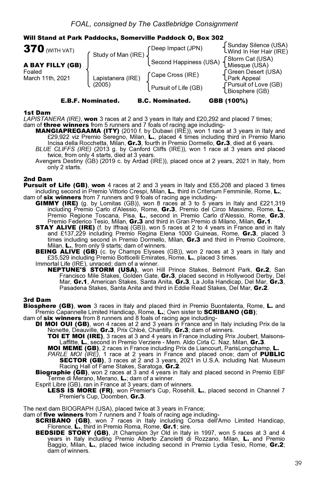 FOAL, consigned by The Castlebridge Consignment Will Stand at Park Paddocks, Somerville Paddock O, Box 302 370 (WITH VAT) A BAY FILLY (GB) Foaled March 11th, 2021 Study of Man (IRE) Lapistanera (IRE) (2005) E.B.F. Nominated. Deep Impact (JPN) Second Happiness (USA) Cape Cross (IRE) Pursuit of Life (GB) B.C. Nominated. Sunday Silence (USA) Wind In Her Hair (IRE) Storm Cat (USA) Miesque (USA) Green Desert (USA) Park Appeal Pursuit of Love (GB) Biosphere (GB) GBB (100%) 1st Dam LAPISTANERA (IRE), won 3 races at 2 and 3 years in Italy and 20,292 and placed 7 times; dam of three winners from 5 runners and 7 foals of racing age includingMANGIAPREGAAMA (ITY) (2010 f. by Dubawi (IRE)), won 1 race at 3 years in Italy and 29,922 viz Premio Seregno, Milan, L., placed 4 times including third in Premio Mario Incisa della Rocchetta, Milan, Gr.3, fourth in Premio Dormello, Gr.3, died at 6 years. BLUE CLIFFS (IRE) (2013 g. by Canford Cliffs (IRE)), won 1 race at 3 years and placed twice, from only 4 starts, died at 3 years. Avengers Destiny (GB) (2019 c. by Ardad (IRE)), placed once at 2 years, 2021 in Italy, from only 2 starts. 2nd Dam Pursuit of Life (GB), won 4 races at 2 and 3 years in Italy and 55,208 and placed 3 times including second in Premio Vittorio Crespi, Milan, L., third in Criterium Femminile, Rome, L.; dam of six winners from 7 runners and 9 foals of racing age includingGIMMY (IRE) (g. by Lomitas (GB)), won 8 races at 3 to 5 years in Italy and 221,319 including Premio Carlo d Alessio, Rome, Gr.3, Premio del Circo Massimo, Rome, L., Premio Regione Toscana, Pisa, L., second in Premio Carlo d Alessio, Rome, Gr.3, Premio Federico Tesio, Milan, Gr.3 and third in Gran Premio di Milano, Milan, Gr.1. STAY ALIVE (IRE) (f. by Iffraaj (GB)), won 5 races at 2 to 4 years in France and in Italy and 137,229 including Premio Regina Elena 1000 Guineas, Rome, Gr.3, placed 3 times including second in Premio Dormello, Milan, Gr.3 and third in Premio Coolmore, Milan, L., from only 9 starts; dam of winners. BEING ALIVE (GB) (c. by Champs Elysees (GB)), won 2 races at 3 years in Italy and 35,529 including Premio Botticelli Emirates, Rome, L., placed 3 times. Immortal Life (IRE), unraced; dam of a winner. NEPTUNE S STORM (USA), won Hill Prince Stakes, Belmont Park, Gr.2, San Francisco Mile Stakes, Golden Gate, Gr.3, placed second in Hollywood Derby, Del Mar, Gr.1, American Stakes, Santa Anita, Gr.3, La Jolla Handicap, Del Mar, Gr.3, Pasadena Stakes, Santa Anita and third in Eddie Read Stakes, Del Mar, Gr.2. 3rd Dam Biosphere (GB), won 3 races in Italy and placed third in Premio Buontalenta, Rome, L. and Premio Capannelle Limited Handicap, Rome, L.; Own sister to SCRIBANO (GB); dam of six winners from 8 runners and 8 foals of racing age includingDI MOI OUI (GB), won 4 races at 2 and 3 years in France and in Italy including Prix de la Nonette, Deauville, Gr.3, Prix Chlo, Chantilly, Gr.3; dam of winners. TOI ET MOI (IRE), 3 races at 3 and 4 years in France including Prix Joubert, MaisonsLaffitte, L., second in Premio Verziere - Mem. Aldo Cirla C. Naz, Milan, Gr.3. MOI MEME (GB), 2 races in France including Prix de Liancourt, ParisLongchamp, L. PARLE MOI (IRE), 1 race at 2 years in France and placed once; dam of PUBLIC SECTOR (GB), 3 races at 2 and 3 years, 2021 in U.S.A. including Nat. Museum Racing Hall of Fame Stakes, Saratoga, Gr.2. Biographie (GB), won 2 races at 3 and 4 years in Italy and placed second in Premio EBF Terme di Merano, Merano, L.; dam of a winner. Esprit Libre (GB), ran in France at 3 years; dam of winners. LESS IS MORE (FR), won Premier s Cup, Rosehill, L., placed second in Channel 7 Premier s Cup, Doomben, Gr.3. The next dam BIOGRAPH (USA), placed twice at 3 years in France; dam of five winners from 7 runners and 7 foals of racing age includingSCRIBANO (GB), won 7 races in Italy including Corsa dell Arno Limited Handicap, Florence, L., third in Premio Roma, Rome, Gr.1; sire. BEDSIDE STORY (GB), Jt Champion 3yr Old in Italy in 1997, won 5 races at 3 and 4 years in Italy including Premio Alberto Zanoletti di Rozzano, Milan, L. and Premio Baggio, Milan, L., placed twice including second in Premio Lydia Tesio, Rome, Gr.2; dam of winners. 39