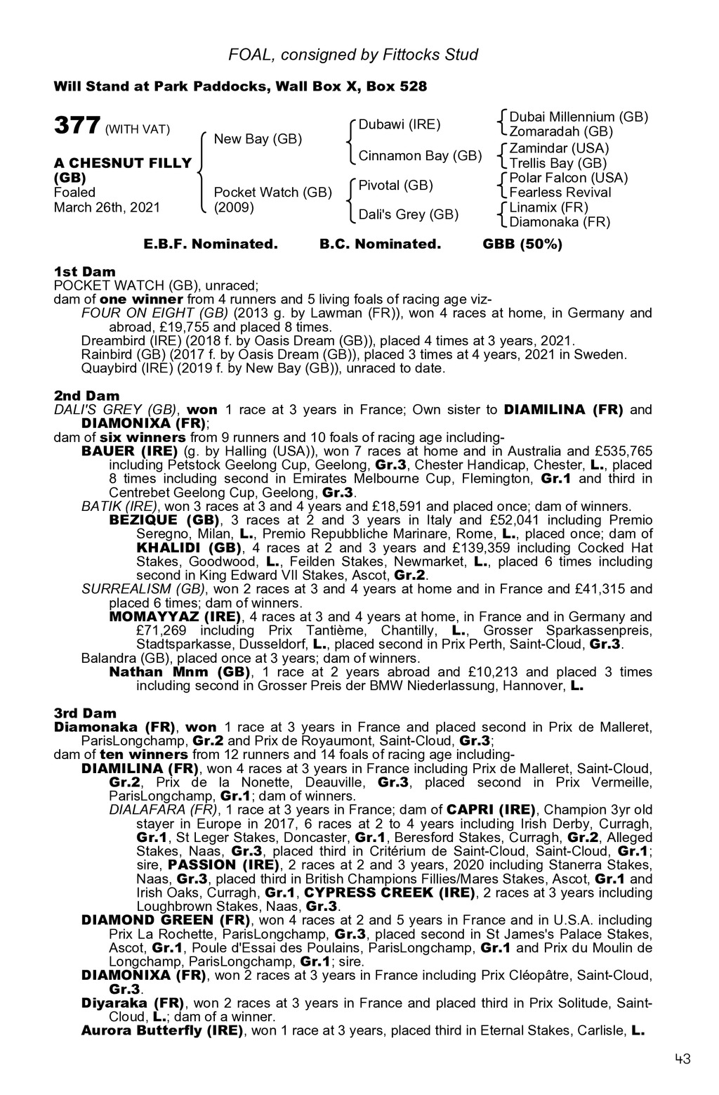 FOAL, consigned by Fittocks Stud Will Stand at Park Paddocks, Wall Box X, Box 528 377 (WITH VAT) A CHESNUT FILLY (GB) Foaled March 26th, 2021 Dubawi (IRE) New Bay (GB) Cinnamon Bay (GB) Pocket Watch (GB) (2009) E.B.F. Nominated. Pivotal (GB) Dali s Grey (GB) B.C. Nominated. Dubai Millennium (GB) Zomaradah (GB) Zamindar (USA) Trellis Bay (GB) Polar Falcon (USA) Fearless Revival Linamix (FR) Diamonaka (FR) GBB (50%) 1st Dam POCKET WATCH (GB), unraced; dam of one winner from 4 runners and 5 living foals of racing age vizFOUR ON EIGHT (GB) (2013 g. by Lawman (FR)), won 4 races at home, in Germany and abroad, 19,755 and placed 8 times. Dreambird (IRE) (2018 f. by Oasis Dream (GB)), placed 4 times at 3 years, 2021. Rainbird (GB) (2017 f. by Oasis Dream (GB)), placed 3 times at 4 years, 2021 in Sweden. Quaybird (IRE) (2019 f. by New Bay (GB)), unraced to date. 2nd Dam DALI S GREY (GB), won 1 race at 3 years in France; Own sister to DIAMILINA (FR) and DIAMONIXA (FR); dam of six winners from 9 runners and 10 foals of racing age includingBAUER (IRE) (g. by Halling (USA)), won 7 races at home and in Australia and 535,765 including Petstock Geelong Cup, Geelong, Gr.3, Chester Handicap, Chester, L., placed 8 times including second in Emirates Melbourne Cup, Flemington, Gr.1 and third in Centrebet Geelong Cup, Geelong, Gr.3. BATIK (IRE), won 3 races at 3 and 4 years and 18,591 and placed once; dam of winners. BEZIQUE (GB), 3 races at 2 and 3 years in Italy and 52,041 including Premio Seregno, Milan, L., Premio Repubbliche Marinare, Rome, L., placed once; dam of KHALIDI (GB), 4 races at 2 and 3 years and 139,359 including Cocked Hat Stakes, Goodwood, L., Feilden Stakes, Newmarket, L., placed 6 times including second in King Edward VII Stakes, Ascot, Gr.2. SURREALISM (GB), won 2 races at 3 and 4 years at home and in France and 41,315 and placed 6 times; dam of winners. MOMAYYAZ (IRE), 4 races at 3 and 4 years at home, in France and in Germany and 71,269 including Prix Tantime, Chantilly, L., Grosser Sparkassenpreis, Stadtsparkasse, Dusseldorf, L., placed second in Prix Perth, Saint-Cloud, Gr.3. Balandra (GB), placed once at 3 years; dam of winners. Nathan Mnm (GB), 1 race at 2 years abroad and 10,213 and placed 3 times including second in Grosser Preis der BMW Niederlassung, Hannover, L. 3rd Dam Diamonaka (FR), won 1 race at 3 years in France and placed second in Prix de Malleret, ParisLongchamp, Gr.2 and Prix de Royaumont, Saint-Cloud, Gr.3; dam of ten winners from 12 runners and 14 foals of racing age includingDIAMILINA (FR), won 4 races at 3 years in France including Prix de Malleret, Saint-Cloud, Gr.2, Prix de la Nonette, Deauville, Gr.3, placed second in Prix Vermeille, ParisLongchamp, Gr.1; dam of winners. DIALAFARA (FR), 1 race at 3 years in France; dam of CAPRI (IRE), Champion 3yr old stayer in Europe in 2017, 6 races at 2 to 4 years including Irish Derby, Curragh, Gr.1, St Leger Stakes, Doncaster, Gr.1, Beresford Stakes, Curragh, Gr.2, Alleged Stakes, Naas, Gr.3, placed third in Critrium de Saint-Cloud, Saint-Cloud, Gr.1; sire, PASSION (IRE), 2 races at 2 and 3 years, 2020 including Stanerra Stakes, Naas, Gr.3, placed third in British Champions Fillies/Mares Stakes, Ascot, Gr.1 and Irish Oaks, Curragh, Gr.1, CYPRESS CREEK (IRE), 2 races at 3 years including Loughbrown Stakes, Naas, Gr.3. DIAMOND GREEN (FR), won 4 races at 2 and 5 years in France and in U.S.A. including Prix La Rochette, ParisLongchamp, Gr.3, placed second in St James s Palace Stakes, Ascot, Gr.1, Poule d Essai des Poulains, ParisLongchamp, Gr.1 and Prix du Moulin de Longchamp, ParisLongchamp, Gr.1; sire. DIAMONIXA (FR), won 2 races at 3 years in France including Prix Cloptre, Saint-Cloud, Gr.3. Diyaraka (FR), won 2 races at 3 years in France and placed third in Prix Solitude, SaintCloud, L.; dam of a winner. Aurora Butterfly (IRE), won 1 race at 3 years, placed third in Eternal Stakes, Carlisle, L. 43