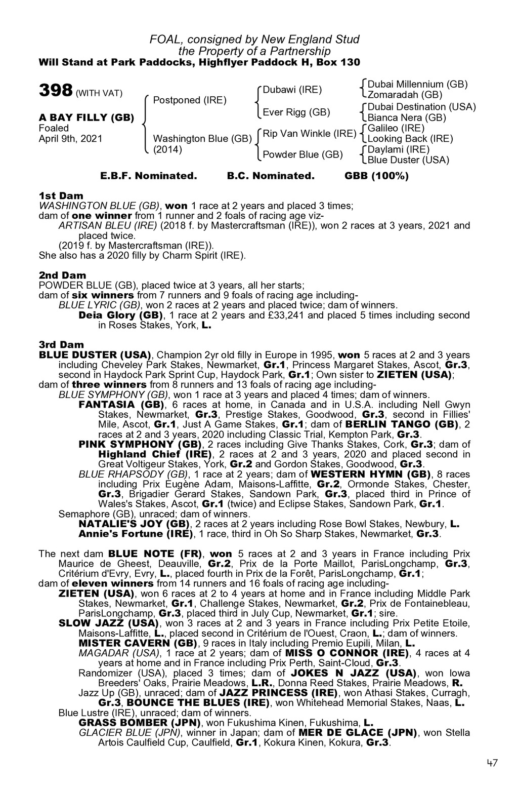 FOAL, consigned by New England Stud the Property of a Partnership Will Stand at Park Paddocks, Highflyer Paddock H, Box 130 398 (WITH VAT) A BAY FILLY (GB) Foaled April 9th, 2021 Dubawi (IRE) Postponed (IRE) Ever Rigg (GB) Washington Blue (GB) (2014) E.B.F. Nominated. Rip Van Winkle (IRE) Powder Blue (GB) B.C. Nominated. Dubai Millennium (GB) Zomaradah (GB) Dubai Destination (USA) Bianca Nera (GB) Galileo (IRE) Looking Back (IRE) Daylami (IRE) Blue Duster (USA) GBB (100%) 1st Dam WASHINGTON BLUE (GB), won 1 race at 2 years and placed 3 times; dam of one winner from 1 runner and 2 foals of racing age vizARTISAN BLEU (IRE) (2018 f. by Mastercraftsman (IRE)), won 2 races at 3 years, 2021 and placed twice. (2019 f. by Mastercraftsman (IRE)). She also has a 2020 filly by Charm Spirit (IRE). 2nd Dam POWDER BLUE (GB), placed twice at 3 years, all her starts; dam of six winners from 7 runners and 9 foals of racing age includingBLUE LYRIC (GB), won 2 races at 2 years and placed twice; dam of winners. Deia Glory (GB), 1 race at 2 years and 33,241 and placed 5 times including second in Roses Stakes, York, L. 3rd Dam BLUE DUSTER (USA), Champion 2yr old filly in Europe in 1995, won 5 races at 2 and 3 years including Cheveley Park Stakes, Newmarket, Gr.1, Princess Margaret Stakes, Ascot, Gr.3, second in Haydock Park Sprint Cup, Haydock Park, Gr.1; Own sister to ZIETEN (USA); dam of three winners from 8 runners and 13 foals of racing age includingBLUE SYMPHONY (GB), won 1 race at 3 years and placed 4 times; dam of winners. FANTASIA (GB), 6 races at home, in Canada and in U.S.A. including Nell Gwyn Stakes, Newmarket, Gr.3, Prestige Stakes, Goodwood, Gr.3, second in Fillies Mile, Ascot, Gr.1, Just A Game Stakes, Gr.1; dam of BERLIN TANGO (GB), 2 races at 2 and 3 years, 2020 including Classic Trial, Kempton Park, Gr.3. PINK SYMPHONY (GB), 2 races including Give Thanks Stakes, Cork, Gr.3; dam of Highland Chief (IRE), 2 races at 2 and 3 years, 2020 and placed second in Great Voltigeur Stakes, York, Gr.2 and Gordon Stakes, Goodwood, Gr.3. BLUE RHAPSODY (GB), 1 race at 2 years; dam of WESTERN HYMN (GB), 8 races including Prix Eugne Adam, Maisons-Laffitte, Gr.2, Ormonde Stakes, Chester, Gr.3, Brigadier Gerard Stakes, Sandown Park, Gr.3, placed third in Prince of Wales s Stakes, Ascot, Gr.1 (twice) and Eclipse Stakes, Sandown Park, Gr.1. Semaphore (GB), unraced; dam of winners. NATALIE S JOY (GB), 2 races at 2 years including Rose Bowl Stakes, Newbury, L. Annie s Fortune (IRE), 1 race, third in Oh So Sharp Stakes, Newmarket, Gr.3. The next dam BLUE NOTE (FR), won 5 races at 2 and 3 years in France including Prix Maurice de Gheest, Deauville, Gr.2, Prix de la Porte Maillot, ParisLongchamp, Gr.3, Critrium d Evry, Evry, L., placed fourth in Prix de la Fort, ParisLongchamp, Gr.1; dam of eleven winners from 14 runners and 16 foals of racing age includingZIETEN (USA), won 6 races at 2 to 4 years at home and in France including Middle Park Stakes, Newmarket, Gr.1, Challenge Stakes, Newmarket, Gr.2, Prix de Fontainebleau, ParisLongchamp, Gr.3, placed third in July Cup, Newmarket, Gr.1; sire. SLOW JAZZ (USA), won 3 races at 2 and 3 years in France including Prix Petite Etoile, Maisons-Laffitte, L., placed second in Critrium de l Ouest, Craon, L.; dam of winners. MISTER CAVERN (GB), 9 races in Italy including Premio Eupili, Milan, L. MAGADAR (USA), 1 race at 2 years; dam of MISS O CONNOR (IRE), 4 races at 4 years at home and in France including Prix Perth, Saint-Cloud, Gr.3. Randomizer (USA), placed 3 times; dam of JOKES N JAZZ (USA), won Iowa Breeders Oaks, Prairie Meadows, L.R., Donna Reed Stakes, Prairie Meadows, R. Jazz Up (GB), unraced; dam of JAZZ PRINCESS (IRE), won Athasi Stakes, Curragh, Gr.3, BOUNCE THE BLUES (IRE), won Whitehead Memorial Stakes, Naas, L. Blue Lustre (IRE), unraced; dam of winners. GRASS BOMBER (JPN), won Fukushima Kinen, Fukushima, L. GLACIER BLUE (JPN), winner in Japan; dam of MER DE GLACE (JPN), won Stella Artois Caulfield Cup, Caulfield, Gr.1, Kokura Kinen, Kokura, Gr.3. 47