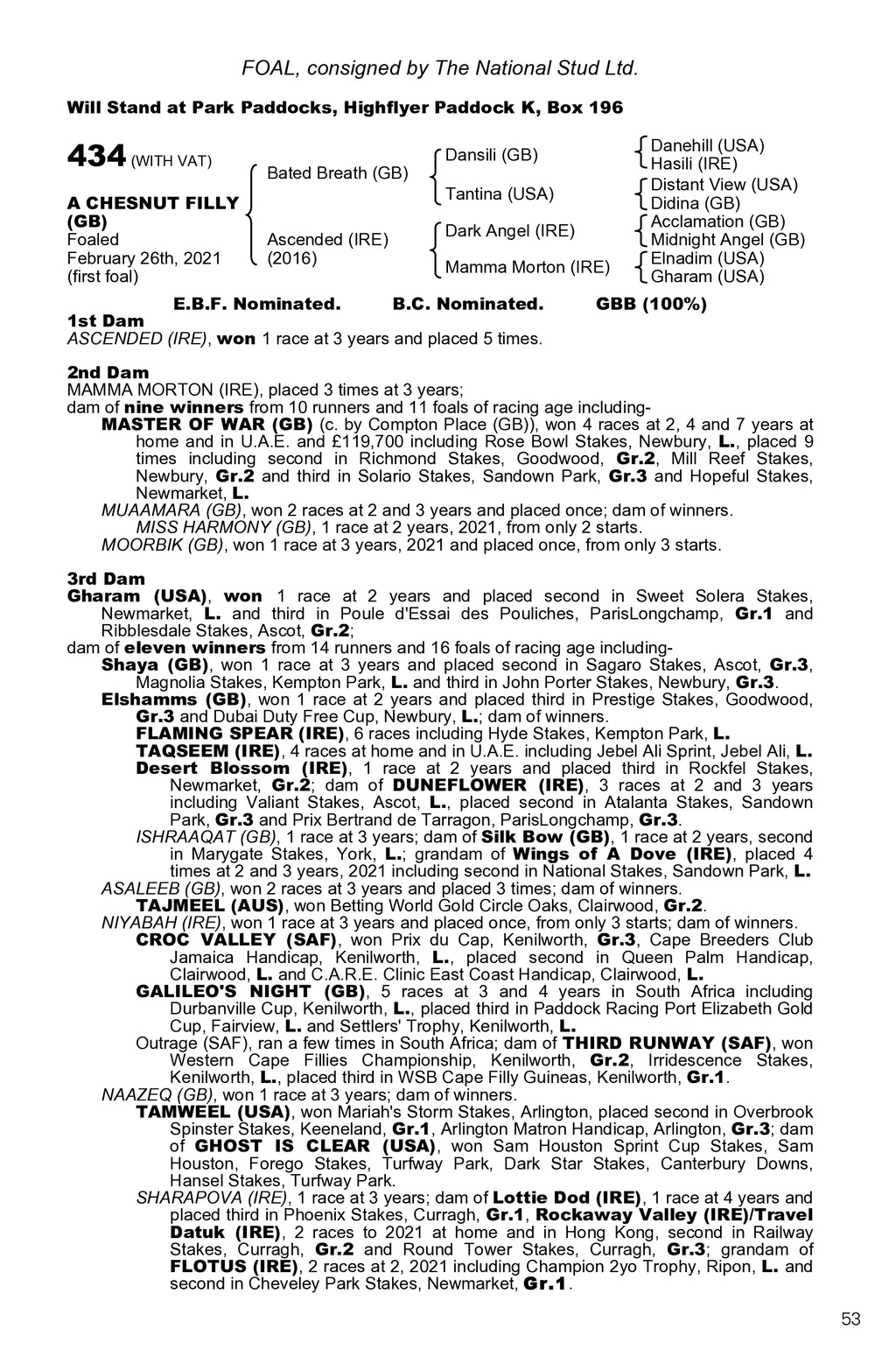 FOAL, consigned by The National Stud Ltd. Will Stand at Park Paddocks, Highflyer Paddock K, Box 196 434 (WITH VAT) A CHESNUT FILLY (GB) Foaled February 26th, 2021 (first foal) Bated Breath (GB) Ascended (IRE) (2016) Dansili (GB) Tantina (USA) Dark Angel (IRE) Mamma Morton (IRE) E.B.F. Nominated. B.C. Nominated. 1st Dam ASCENDED (IRE), won 1 race at 3 years and placed 5 times. Danehill (USA) Hasili (IRE) Distant View (USA) Didina (GB) Acclamation (GB) Midnight Angel (GB) Elnadim (USA) Gharam (USA) GBB (100%) 2nd Dam MAMMA MORTON (IRE), placed 3 times at 3 years; dam of nine winners from 10 runners and 11 foals of racing age includingMASTER OF WAR (GB) (c. by Compton Place (GB)), won 4 races at 2, 4 and 7 years at home and in U.A.E. and 119,700 including Rose Bowl Stakes, Newbury, L., placed 9 times including second in Richmond Stakes, Goodwood, Gr.2, Mill Reef Stakes, Newbury, Gr.2 and third in Solario Stakes, Sandown Park, Gr.3 and Hopeful Stakes, Newmarket, L. MUAAMARA (GB), won 2 races at 2 and 3 years and placed once; dam of winners. MISS HARMONY (GB), 1 race at 2 years, 2021, from only 2 starts. MOORBIK (GB), won 1 race at 3 years, 2021 and placed once, from only 3 starts. 3rd Dam Gharam (USA), won 1 race at 2 years and placed second in Sweet Solera Stakes, Newmarket, L. and third in Poule d Essai des Pouliches, ParisLongchamp, Gr.1 and Ribblesdale Stakes, Ascot, Gr.2; dam of eleven winners from 14 runners and 16 foals of racing age includingShaya (GB), won 1 race at 3 years and placed second in Sagaro Stakes, Ascot, Gr.3, Magnolia Stakes, Kempton Park, L. and third in John Porter Stakes, Newbury, Gr.3. Elshamms (GB), won 1 race at 2 years and placed third in Prestige Stakes, Goodwood, Gr.3 and Dubai Duty Free Cup, Newbury, L.; dam of winners. FLAMING SPEAR (IRE), 6 races including Hyde Stakes, Kempton Park, L. TAQSEEM (IRE), 4 races at home and in U.A.E. including Jebel Ali Sprint, Jebel Ali, L. Desert Blossom (IRE), 1 race at 2 years and placed third in Rockfel Stakes, Newmarket, Gr.2; dam of DUNEFLOWER (IRE), 3 races at 2 and 3 years including Valiant Stakes, Ascot, L., placed second in Atalanta Stakes, Sandown Park, Gr.3 and Prix Bertrand de Tarragon, ParisLongchamp, Gr.3. ISHRAAQAT (GB), 1 race at 3 years; dam of Silk Bow (GB), 1 race at 2 years, second in Marygate Stakes, York, L.; grandam of Wings of A Dove (IRE), placed 4 times at 2 and 3 years, 2021 including second in National Stakes, Sandown Park, L. ASALEEB (GB), won 2 races at 3 years and placed 3 times; dam of winners. TAJMEEL (AUS), won Betting World Gold Circle Oaks, Clairwood, Gr.2. NIYABAH (IRE), won 1 race at 3 years and placed once, from only 3 starts; dam of winners. CROC VALLEY (SAF), won Prix du Cap, Kenilworth, Gr.3, Cape Breeders Club Jamaica Handicap, Kenilworth, L., placed second in Queen Palm Handicap, Clairwood, L. and C.A.R.E. Clinic East Coast Handicap, Clairwood, L. GALILEO S NIGHT (GB), 5 races at 3 and 4 years in South Africa including Durbanville Cup, Kenilworth, L., placed third in Paddock Racing Port Elizabeth Gold Cup, Fairview, L. and Settlers Trophy, Kenilworth, L. Outrage (SAF), ran a few times in South Africa; dam of THIRD RUNWAY (SAF), won Western Cape Fillies Championship, Kenilworth, Gr.2, Irridescence Stakes, Kenilworth, L., placed third in WSB Cape Filly Guineas, Kenilworth, Gr.1. NAAZEQ (GB), won 1 race at 3 years; dam of winners. TAMWEEL (USA), won Mariah s Storm Stakes, Arlington, placed second in Overbrook Spinster Stakes, Keeneland, Gr.1, Arlington Matron Handicap, Arlington, Gr.3; dam of GHOST IS CLEAR (USA), won Sam Houston Sprint Cup Stakes, Sam Houston, Forego Stakes, Turfway Park, Dark Star Stakes, Canterbury Downs, Hansel Stakes, Turfway Park. SHARAPOVA (IRE), 1 race at 3 years; dam of Lottie Dod (IRE), 1 race at 4 years and placed third in Phoenix Stakes, Curragh, Gr.1, Rockaway Valley (IRE)/Travel Datuk (IRE), 2 races to 2021 at home and in Hong Kong, second in Railway Stakes, Curragh, Gr.2 and Round Tower Stakes, Curragh, Gr.3; grandam of FLOTUS (IRE), 2 races at 2, 2021 including Champion 2yo Trophy, Ripon, L. and second in Cheveley Park Stakes, Newmarket, G r . 1 . 53