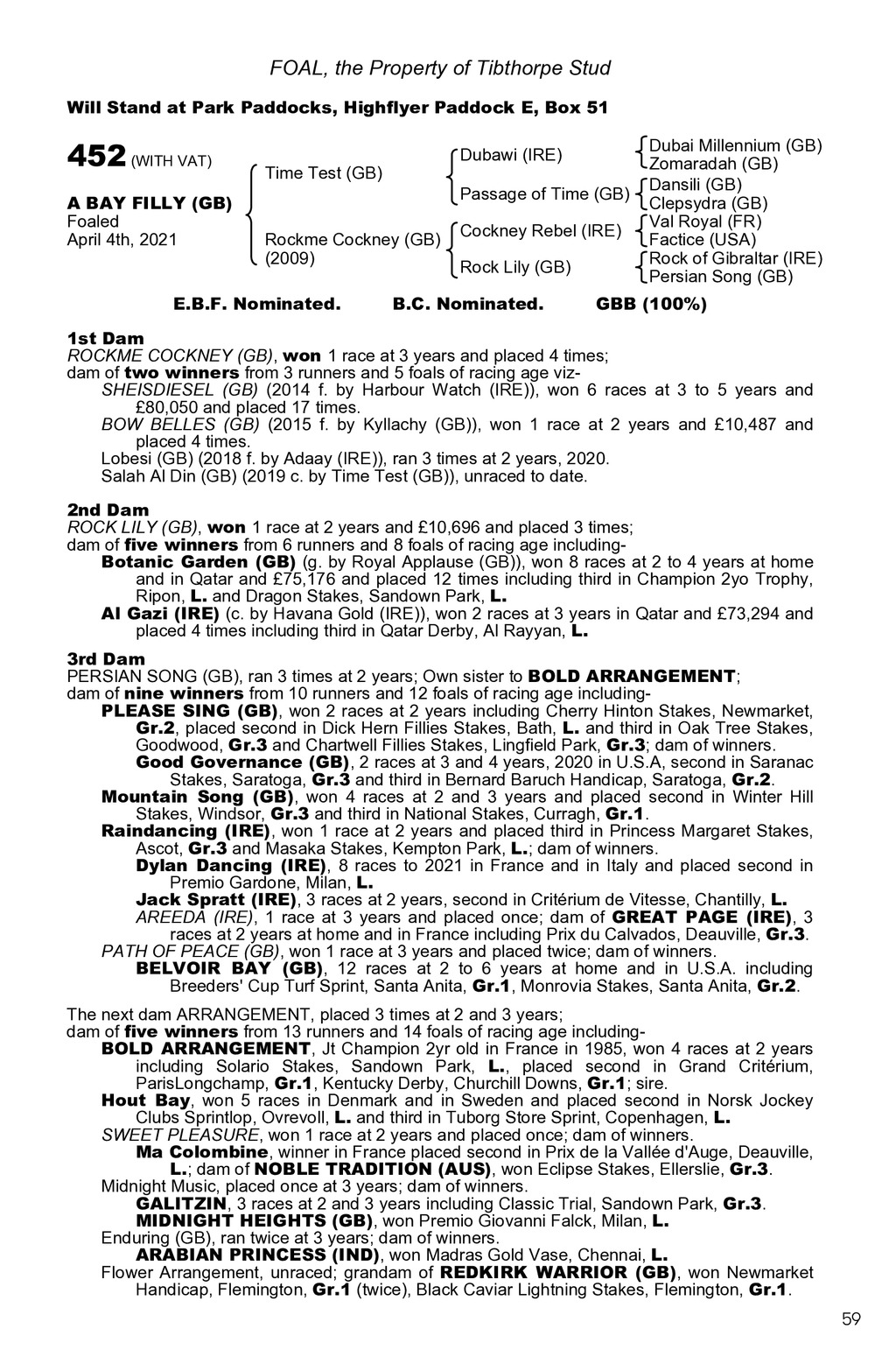 FOAL, the Property of Tibthorpe Stud Will Stand at Park Paddocks, Highflyer Paddock E, Box 51 452 (WITH VAT) A BAY FILLY (GB) Foaled April 4th, 2021 Dubawi (IRE) Time Test (GB) Passage of Time (GB) Rockme Cockney (GB) (2009) E.B.F. Nominated. Cockney Rebel (IRE) Rock Lily (GB) B.C. Nominated. Dubai Millennium (GB) Zomaradah (GB) Dansili (GB) Clepsydra (GB) Val Royal (FR) Factice (USA) Rock of Gibraltar (IRE) Persian Song (GB) GBB (100%) 1st Dam ROCKME COCKNEY (GB), won 1 race at 3 years and placed 4 times; dam of two winners from 3 runners and 5 foals of racing age vizSHEISDIESEL (GB) (2014 f. by Harbour Watch (IRE)), won 6 races at 3 to 5 years and 80,050 and placed 17 times. BOW BELLES (GB) (2015 f. by Kyllachy (GB)), won 1 race at 2 years and 10,487 and placed 4 times. Lobesi (GB) (2018 f. by Adaay (IRE)), ran 3 times at 2 years, 2020. Salah Al Din (GB) (2019 c. by Time Test (GB)), unraced to date. 2nd Dam ROCK LILY (GB), won 1 race at 2 years and 10,696 and placed 3 times; dam of five winners from 6 runners and 8 foals of racing age includingBotanic Garden (GB) (g. by Royal Applause (GB)), won 8 races at 2 to 4 years at home and in Qatar and 75,176 and placed 12 times including third in Champion 2yo Trophy, Ripon, L. and Dragon Stakes, Sandown Park, L. Al Gazi (IRE) (c. by Havana Gold (IRE)), won 2 races at 3 years in Qatar and 73,294 and placed 4 times including third in Qatar Derby, Al Rayyan, L. 3rd Dam PERSIAN SONG (GB), ran 3 times at 2 years; Own sister to BOLD ARRANGEMENT; dam of nine winners from 10 runners and 12 foals of racing age includingPLEASE SING (GB), won 2 races at 2 years including Cherry Hinton Stakes, Newmarket, Gr.2, placed second in Dick Hern Fillies Stakes, Bath, L. and third in Oak Tree Stakes, Goodwood, Gr.3 and Chartwell Fillies Stakes, Lingfield Park, Gr.3; dam of winners. Good Governance (GB), 2 races at 3 and 4 years, 2020 in U.S.A, second in Saranac Stakes, Saratoga, Gr.3 and third in Bernard Baruch Handicap, Saratoga, Gr.2. Mountain Song (GB), won 4 races at 2 and 3 years and placed second in Winter Hill Stakes, Windsor, Gr.3 and third in National Stakes, Curragh, Gr.1. Raindancing (IRE), won 1 race at 2 years and placed third in Princess Margaret Stakes, Ascot, Gr.3 and Masaka Stakes, Kempton Park, L.; dam of winners. Dylan Dancing (IRE), 8 races to 2021 in France and in Italy and placed second in Premio Gardone, Milan, L. Jack Spratt (IRE), 3 races at 2 years, second in Critrium de Vitesse, Chantilly, L. AREEDA (IRE), 1 race at 3 years and placed once; dam of GREAT PAGE (IRE), 3 races at 2 years at home and in France including Prix du Calvados, Deauville, Gr.3. PATH OF PEACE (GB), won 1 race at 3 years and placed twice; dam of winners. BELVOIR BAY (GB), 12 races at 2 to 6 years at home and in U.S.A. including Breeders Cup Turf Sprint, Santa Anita, Gr.1, Monrovia Stakes, Santa Anita, Gr.2. The next dam ARRANGEMENT, placed 3 times at 2 and 3 years; dam of five winners from 13 runners and 14 foals of racing age includingBOLD ARRANGEMENT, Jt Champion 2yr old in France in 1985, won 4 races at 2 years including Solario Stakes, Sandown Park, L., placed second in Grand Critrium, ParisLongchamp, Gr.1, Kentucky Derby, Churchill Downs, Gr.1; sire. Hout Bay, won 5 races in Denmark and in Sweden and placed second in Norsk Jockey Clubs Sprintlop, Ovrevoll, L. and third in Tuborg Store Sprint, Copenhagen, L. SWEET PLEASURE, won 1 race at 2 years and placed once; dam of winners. Ma Colombine, winner in France placed second in Prix de la Valle d Auge, Deauville, L.; dam of NOBLE TRADITION (AUS), won Eclipse Stakes, Ellerslie, Gr.3. Midnight Music, placed once at 3 years; dam of winners. GALITZIN, 3 races at 2 and 3 years including Classic Trial, Sandown Park, Gr.3. MIDNIGHT HEIGHTS (GB), won Premio Giovanni Falck, Milan, L. Enduring (GB), ran twice at 3 years; dam of winners. ARABIAN PRINCESS (IND), won Madras Gold Vase, Chennai, L. Flower Arrangement, unraced; grandam of REDKIRK WARRIOR (GB), won Newmarket Handicap, Flemington, Gr.1 (twice), Black Caviar Lightning Stakes, Flemington, Gr.1. 59