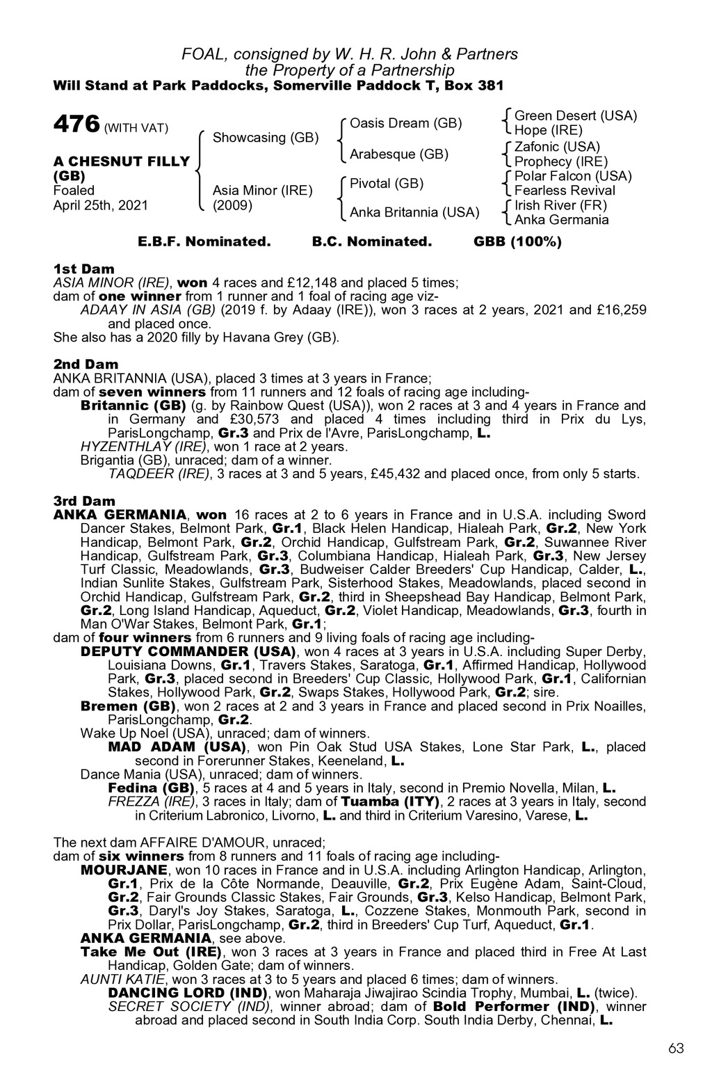 FOAL, consigned by W. H. R. John & Partners the Property of a Partnership Will Stand at Park Paddocks, Somerville Paddock T, Box 381 476 (WITH VAT) A CHESNUT FILLY (GB) Foaled April 25th, 2021 Showcasing (GB) Asia Minor (IRE) (2009) E.B.F. Nominated. Oasis Dream (GB) Arabesque (GB) Pivotal (GB) Anka Britannia (USA) B.C. Nominated. Green Desert (USA) Hope (IRE) Zafonic (USA) Prophecy (IRE) Polar Falcon (USA) Fearless Revival Irish River (FR) Anka Germania GBB (100%) 1st Dam ASIA MINOR (IRE), won 4 races and 12,148 and placed 5 times; dam of one winner from 1 runner and 1 foal of racing age vizADAAY IN ASIA (GB) (2019 f. by Adaay (IRE)), won 3 races at 2 years, 2021 and 16,259 and placed once. She also has a 2020 filly by Havana Grey (GB). 2nd Dam ANKA BRITANNIA (USA), placed 3 times at 3 years in France; dam of seven winners from 11 runners and 12 foals of racing age includingBritannic (GB) (g. by Rainbow Quest (USA)), won 2 races at 3 and 4 years in France and in Germany and 30,573 and placed 4 times including third in Prix du Lys, ParisLongchamp, Gr.3 and Prix de l Avre, ParisLongchamp, L. HYZENTHLAY (IRE), won 1 race at 2 years. Brigantia (GB), unraced; dam of a winner. TAQDEER (IRE), 3 races at 3 and 5 years, 45,432 and placed once, from only 5 starts. 3rd Dam ANKA GERMANIA, won 16 races at 2 to 6 years in France and in U.S.A. including Sword Dancer Stakes, Belmont Park, Gr.1, Black Helen Handicap, Hialeah Park, Gr.2, New York Handicap, Belmont Park, Gr.2, Orchid Handicap, Gulfstream Park, Gr.2, Suwannee River Handicap, Gulfstream Park, Gr.3, Columbiana Handicap, Hialeah Park, Gr.3, New Jersey Turf Classic, Meadowlands, Gr.3, Budweiser Calder Breeders Cup Handicap, Calder, L., Indian Sunlite Stakes, Gulfstream Park, Sisterhood Stakes, Meadowlands, placed second in Orchid Handicap, Gulfstream Park, Gr.2, third in Sheepshead Bay Handicap, Belmont Park, Gr.2, Long Island Handicap, Aqueduct, Gr.2, Violet Handicap, Meadowlands, Gr.3, fourth in Man O War Stakes, Belmont Park, Gr.1; dam of four winners from 6 runners and 9 living foals of racing age includingDEPUTY COMMANDER (USA), won 4 races at 3 years in U.S.A. including Super Derby, Louisiana Downs, Gr.1, Travers Stakes, Saratoga, Gr.1, Affirmed Handicap, Hollywood Park, Gr.3, placed second in Breeders Cup Classic, Hollywood Park, Gr.1, Californian Stakes, Hollywood Park, Gr.2, Swaps Stakes, Hollywood Park, Gr.2; sire. Bremen (GB), won 2 races at 2 and 3 years in France and placed second in Prix Noailles, ParisLongchamp, Gr.2. Wake Up Noel (USA), unraced; dam of winners. MAD ADAM (USA), won Pin Oak Stud USA Stakes, Lone Star Park, L., placed second in Forerunner Stakes, Keeneland, L. Dance Mania (USA), unraced; dam of winners. Fedina (GB), 5 races at 4 and 5 years in Italy, second in Premio Novella, Milan, L. FREZZA (IRE), 3 races in Italy; dam of Tuamba (ITY), 2 races at 3 years in Italy, second in Criterium Labronico, Livorno, L. and third in Criterium Varesino, Varese, L. The next dam AFFAIRE D AMOUR, unraced; dam of six winners from 8 runners and 11 foals of racing age includingMOURJANE, won 10 races in France and in U.S.A. including Arlington Handicap, Arlington, Gr.1, Prix de la Cte Normande, Deauville, Gr.2, Prix Eugne Adam, Saint-Cloud, Gr.2, Fair Grounds Classic Stakes, Fair Grounds, Gr.3, Kelso Handicap, Belmont Park, Gr.3, Daryl s Joy Stakes, Saratoga, L., Cozzene Stakes, Monmouth Park, second in Prix Dollar, ParisLongchamp, Gr.2, third in Breeders Cup Turf, Aqueduct, Gr.1. ANKA GERMANIA, see above. Take Me Out (IRE), won 3 races at 3 years in France and placed third in Free At Last Handicap, Golden Gate; dam of winners. AUNTI KATIE, won 3 races at 3 to 5 years and placed 6 times; dam of winners. DANCING LORD (IND), won Maharaja Jiwajirao Scindia Trophy, Mumbai, L. (twice). SECRET SOCIETY (IND), winner abroad; dam of Bold Performer (IND), winner abroad and placed second in South India Corp. South India Derby, Chennai, L. 63