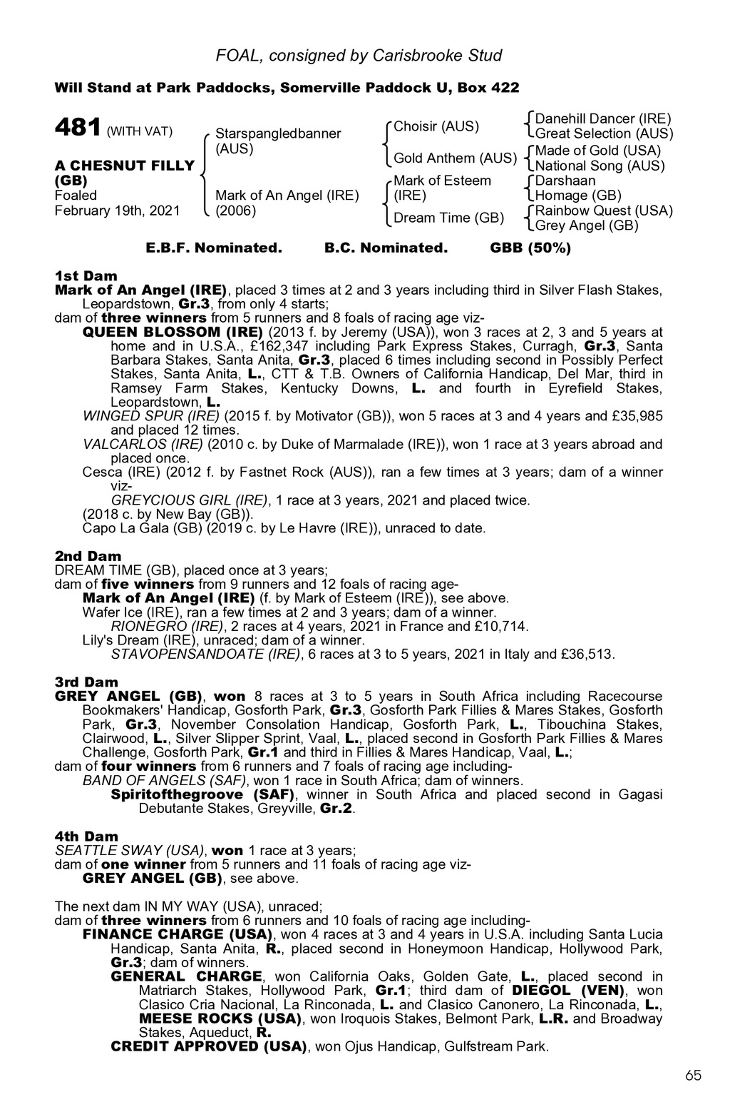 FOAL, consigned by Carisbrooke Stud Will Stand at Park Paddocks, Somerville Paddock U, Box 422 481 (WITH VAT) A CHESNUT FILLY (GB) Foaled February 19th, 2021 Starspangledbanner (AUS) Mark of An Angel (IRE) (2006) E.B.F. Nominated. Choisir (AUS) Gold Anthem (AUS) Mark of Esteem (IRE) Dream Time (GB) B.C. Nominated. Danehill Dancer (IRE) Great Selection (AUS) Made of Gold (USA) National Song (AUS) Darshaan Homage (GB) Rainbow Quest (USA) Grey Angel (GB) GBB (50%) 1st Dam Mark of An Angel (IRE), placed 3 times at 2 and 3 years including third in Silver Flash Stakes, Leopardstown, Gr.3, from only 4 starts; dam of three winners from 5 runners and 8 foals of racing age vizQUEEN BLOSSOM (IRE) (2013 f. by Jeremy (USA)), won 3 races at 2, 3 and 5 years at home and in U.S.A., 162,347 including Park Express Stakes, Curragh, Gr.3, Santa Barbara Stakes, Santa Anita, Gr.3, placed 6 times including second in Possibly Perfect Stakes, Santa Anita, L., CTT & T.B. Owners of California Handicap, Del Mar, third in Ramsey Farm Stakes, Kentucky Downs, L. and fourth in Eyrefield Stakes, Leopardstown, L. WINGED SPUR (IRE) (2015 f. by Motivator (GB)), won 5 races at 3 and 4 years and 35,985 and placed 12 times. VALCARLOS (IRE) (2010 c. by Duke of Marmalade (IRE)), won 1 race at 3 years abroad and placed once. Cesca (IRE) (2012 f. by Fastnet Rock (AUS)), ran a few times at 3 years; dam of a winner vizGREYCIOUS GIRL (IRE), 1 race at 3 years, 2021 and placed twice. (2018 c. by New Bay (GB)). Capo La Gala (GB) (2019 c. by Le Havre (IRE)), unraced to date. 2nd Dam DREAM TIME (GB), placed once at 3 years; dam of five winners from 9 runners and 12 foals of racing ageMark of An Angel (IRE) (f. by Mark of Esteem (IRE)), see above. Wafer Ice (IRE), ran a few times at 2 and 3 years; dam of a winner. RIONEGRO (IRE), 2 races at 4 years, 2021 in France and 10,714. Lily s Dream (IRE), unraced; dam of a winner. STAVOPENSANDOATE (IRE), 6 races at 3 to 5 years, 2021 in Italy and 36,513. 3rd Dam GREY ANGEL (GB), won 8 races at 3 to 5 years in South Africa including Racecourse Bookmakers Handicap, Gosforth Park, Gr.3, Gosforth Park Fillies & Mares Stakes, Gosforth Park, Gr.3, November Consolation Handicap, Gosforth Park, L., Tibouchina Stakes, Clairwood, L., Silver Slipper Sprint, Vaal, L., placed second in Gosforth Park Fillies & Mares Challenge, Gosforth Park, Gr.1 and third in Fillies & Mares Handicap, Vaal, L.; dam of four winners from 6 runners and 7 foals of racing age includingBAND OF ANGELS (SAF), won 1 race in South Africa; dam of winners. Spiritofthegroove (SAF), winner in South Africa and placed second in Gagasi Debutante Stakes, Greyville, Gr.2. 4th Dam SEATTLE SWAY (USA), won 1 race at 3 years; dam of one winner from 5 runners and 11 foals of racing age vizGREY ANGEL (GB), see above. The next dam IN MY WAY (USA), unraced; dam of three winners from 6 runners and 10 foals of racing age includingFINANCE CHARGE (USA), won 4 races at 3 and 4 years in U.S.A. including Santa Lucia Handicap, Santa Anita, R., placed second in Honeymoon Handicap, Hollywood Park, Gr.3; dam of winners. GENERAL CHARGE, won California Oaks, Golden Gate, L., placed second in Matriarch Stakes, Hollywood Park, Gr.1; third dam of DIEGOL (VEN), won Clasico Cria Nacional, La Rinconada, L. and Clasico Canonero, La Rinconada, L., MEESE ROCKS (USA), won Iroquois Stakes, Belmont Park, L.R. and Broadway Stakes, Aqueduct, R. CREDIT APPROVED (USA), won Ojus Handicap, Gulfstream Park. 65
