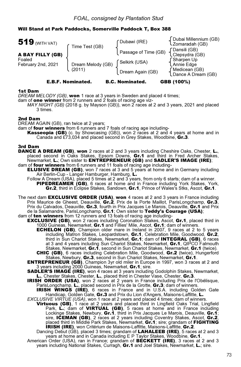 FOAL, consigned by Plantation Stud Will Stand at Park Paddocks, Somerville Paddock T, Box 388 519 (WITH VAT) A BAY FILLY (GB) Foaled February 2nd, 2021 Dubawi (IRE) Time Test (GB) Passage of Time (GB) Dream Melody (GB) (2011) E.B.F. Nominated. Selkirk (USA) Dream Again (GB) B.C. Nominated. Dubai Millennium (GB) Zomaradah (GB) Dansili (GB) Clepsydra (GB) Sharpen Up Annie Edge Medicean (GB) Dance A Dream (GB) GBB (100%) 1st Dam DREAM MELODY (GB), won 1 race at 3 years in Sweden and placed 4 times; dam of one winner from 2 runners and 2 foals of racing age vizMAY NIGHT (GB) (2018 g. by Mayson (GB)), won 2 races at 2 and 3 years, 2021 and placed 3 times. 2nd Dam DREAM AGAIN (GB), ran twice at 2 years; dam of four winners from 6 runners and 7 foals of racing age includingKasseopia (GB) (c. by Showcasing (GB)), won 2 races at 2 and 4 years at home and in Canada and 73,034 and placed second in Grey Stakes, Woodbine, Gr.3. 3rd Dam DANCE A DREAM (GB), won 2 races at 2 and 3 years including Cheshire Oaks, Chester, L., placed second in Oaks Stakes, Epsom Downs, Gr.1 and third in Fred Archer Stakes, Newmarket, L.; Own sister to ENTREPRENEUR (GB) and SADLER S IMAGE (IRE); dam of four winners from 6 runners and 11 foals of racing age includingELUSIVE DREAM (GB), won 7 races at 3 and 5 years at home and in Germany including Air Berlin-Cup - Langer Hamburger, Hamburg, L. Follow A Dream (USA), placed 5 times at 2 and 3 years, from only 6 starts; dam of a winner. PIPEDREAMER (GB), 6 races at home and in France including York Stakes, York, Gr.2, third in Eclipse Stakes, Sandown, Gr.1, Prince of Wales s Stks, Ascot, Gr.1. The next dam EXCLUSIVE ORDER (USA), won 4 races at 2 and 3 years in France including Prix Maurice de Gheest, Deauville, Gr.2, Prix de la Porte Maillot, ParisLongchamp, Gr.3, Prix du Calvados, Deauville, Gr.3, fourth in Prix Jacques Le Marois, Deauville, Gr.1 and Prix de la Salamandre, ParisLongchamp, Gr.1; Own sister to Teddy s Courage (USA); dam of ten winners from 12 runners and 13 foals of racing age includingEXCLUSIVE (GB), won 2 races including Coronation Stakes, Ascot, Gr.1, placed third in 1000 Guineas, Newmarket, Gr.1 and Fillies Mile, Ascot, Gr.1; dam of winners. ECHELON (GB), Champion older mare in Ireland in 2007, 9 races at 2 to 5 years including Matron Stakes, Leopardstown, Gr.1, Celebration Mile, Goodwood, Gr.2, third in Sun Chariot Stakes, Newmarket, Gr.1; dam of INTEGRAL (GB), 6 races at 3 and 4 years including Sun Chariot Stakes, Newmarket, Gr.1, QIPCO Falmouth Stakes, Newmarket, Gr.1, second in Sun Chariot Stakes, Newmarket, Gr.1 (twice). CHIC (GB), 6 races including Celebration Mile, Goodwood, Gr.2 (twice), Hungerford Stakes, Newbury, Gr.3, second in Sun Chariot Stakes, Newmarket, Gr.1. ENTREPRENEUR (GB), Champion 3yr old miler in Europe in 1997, won 3 races at 2 and 3 years including 2000 Guineas, Newmarket, Gr.1; sire. SADLER S IMAGE (IRE), won 4 races at 3 years including Godolphin Stakes, Newmarket, L., Chester Stakes, Chester, L., placed third in Chester Vase, Chester, Gr.3. IRISH ORDER (USA), won 2 races at 2 years in France including Prix de l Oblisque, ParisLongchamp, L., placed second in Prix de la Grotte, Gr.3; dam of winners. IRISH WINGS (IRE), 6 races in France and in U.S.A. including Golden Gate Handicap, Golden Gate, Gr.3 and Prix du Lion d Angers, Maisons-Laffitte, L. EXCLUSIVE VIRTUE (USA), won 1 race at 2 years and placed 4 times; dam of winners. Virtuous (GB), 1 race at 2 years and placed third in Lingfield Oaks Trial, Lingfield Park, L.; dam of VIRTUAL (GB), 5 races at home and in France including Lockinge Stakes, Newbury, Gr.1, third in Prix Jacques Le Marois, Deauville, Gr.1; sire, ICEMAN (GB), 2 races at 2 years including Coventry Stakes, Ascot, Gr.2, placed third in Middle Park Stakes, Newmarket, Gr.1; sire; grandam of FIGHTING IRISH (IRE), won Critrium de Maisons-Laffitte, Maisons-Laffitte, Gr.2. Dancing Debut (GB), placed 3 times; grandam of LAHALEEB (IRE), 5 races at 2 and 3 years at home and in Canada including E P Taylor Stakes, Woodbine, Gr.1. American Order (USA), ran in France; grandam of BECKETT (IRE), 3 races at 2 and 3 years including National Stakes, Curragh, Gr.1 and Joel Stakes, Newmarket, L.; sire. 73