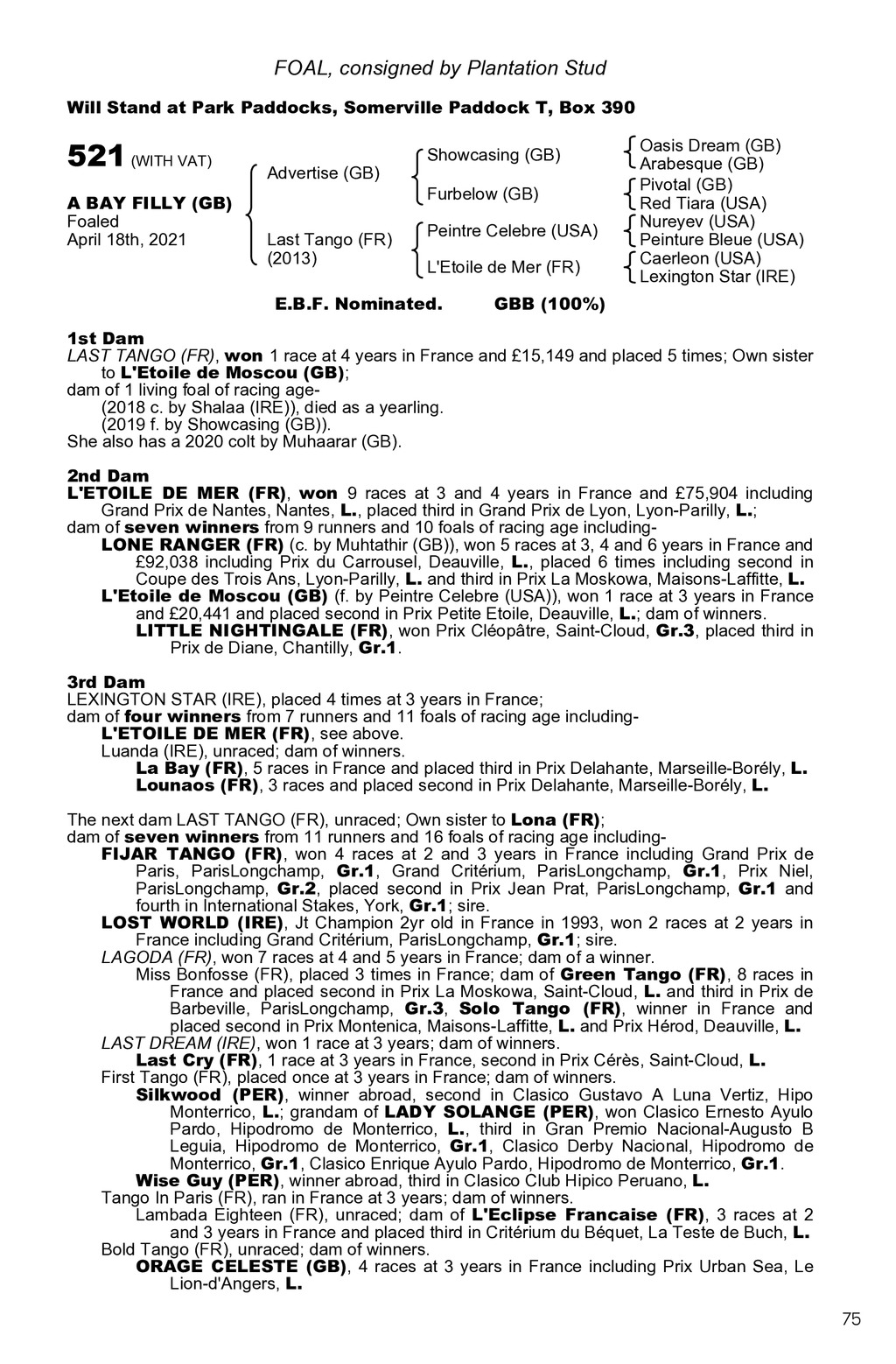 FOAL, consigned by Plantation Stud Will Stand at Park Paddocks, Somerville Paddock T, Box 390 521 (WITH VAT) A BAY FILLY (GB) Foaled April 18th, 2021 Advertise (GB) Last Tango (FR) (2013) Showcasing (GB) Furbelow (GB) Peintre Celebre (USA) L Etoile de Mer (FR) E.B.F. Nominated. Oasis Dream (GB) Arabesque (GB) Pivotal (GB) Red Tiara (USA) Nureyev (USA) Peinture Bleue (USA) Caerleon (USA) Lexington Star (IRE) GBB (100%) 1st Dam LAST TANGO (FR), won 1 race at 4 years in France and 15,149 and placed 5 times; Own sister to L Etoile de Moscou (GB); dam of 1 living foal of racing age(2018 c. by Shalaa (IRE)), died as a yearling. (2019 f. by Showcasing (GB)). She also has a 2020 colt by Muhaarar (GB). 2nd Dam L ETOILE DE MER (FR), won 9 races at 3 and 4 years in France and 75,904 including Grand Prix de Nantes, Nantes, L., placed third in Grand Prix de Lyon, Lyon-Parilly, L.; dam of seven winners from 9 runners and 10 foals of racing age includingLONE RANGER (FR) (c. by Muhtathir (GB)), won 5 races at 3, 4 and 6 years in France and 92,038 including Prix du Carrousel, Deauville, L., placed 6 times including second in Coupe des Trois Ans, Lyon-Parilly, L. and third in Prix La Moskowa, Maisons-Laffitte, L. L Etoile de Moscou (GB) (f. by Peintre Celebre (USA)), won 1 race at 3 years in France and 20,441 and placed second in Prix Petite Etoile, Deauville, L.; dam of winners. LITTLE NIGHTINGALE (FR), won Prix Cloptre, Saint-Cloud, Gr.3, placed third in Prix de Diane, Chantilly, Gr.1. 3rd Dam LEXINGTON STAR (IRE), placed 4 times at 3 years in France; dam of four winners from 7 runners and 11 foals of racing age includingL ETOILE DE MER (FR), see above. Luanda (IRE), unraced; dam of winners. La Bay (FR), 5 races in France and placed third in Prix Delahante, Marseille-Borly, L. Lounaos (FR), 3 races and placed second in Prix Delahante, Marseille-Borly, L. The next dam LAST TANGO (FR), unraced; Own sister to Lona (FR); dam of seven winners from 11 runners and 16 foals of racing age includingFIJAR TANGO (FR), won 4 races at 2 and 3 years in France including Grand Prix de Paris, ParisLongchamp, Gr.1, Grand Critrium, ParisLongchamp, Gr.1, Prix Niel, ParisLongchamp, Gr.2, placed second in Prix Jean Prat, ParisLongchamp, Gr.1 and fourth in International Stakes, York, Gr.1; sire. LOST WORLD (IRE), Jt Champion 2yr old in France in 1993, won 2 races at 2 years in France including Grand Critrium, ParisLongchamp, Gr.1; sire. LAGODA (FR), won 7 races at 4 and 5 years in France; dam of a winner. Miss Bonfosse (FR), placed 3 times in France; dam of Green Tango (FR), 8 races in France and placed second in Prix La Moskowa, Saint-Cloud, L. and third in Prix de Barbeville, ParisLongchamp, Gr.3, Solo Tango (FR), winner in France and placed second in Prix Montenica, Maisons-Laffitte, L. and Prix Hrod, Deauville, L. LAST DREAM (IRE), won 1 race at 3 years; dam of winners. Last Cry (FR), 1 race at 3 years in France, second in Prix Crs, Saint-Cloud, L. First Tango (FR), placed once at 3 years in France; dam of winners. Silkwood (PER), winner abroad, second in Clasico Gustavo A Luna Vertiz, Hipo Monterrico, L.; grandam of LADY SOLANGE (PER), won Clasico Ernesto Ayulo Pardo, Hipodromo de Monterrico, L., third in Gran Premio Nacional-Augusto B Leguia, Hipodromo de Monterrico, Gr.1, Clasico Derby Nacional, Hipodromo de Monterrico, Gr.1, Clasico Enrique Ayulo Pardo, Hipodromo de Monterrico, Gr.1. Wise Guy (PER), winner abroad, third in Clasico Club Hipico Peruano, L. Tango In Paris (FR), ran in France at 3 years; dam of winners. Lambada Eighteen (FR), unraced; dam of L Eclipse Francaise (FR), 3 races at 2 and 3 years in France and placed third in Critrium du Bquet, La Teste de Buch, L. Bold Tango (FR), unraced; dam of winners. ORAGE CELESTE (GB), 4 races at 3 years in France including Prix Urban Sea, Le Lion-d Angers, L. 75