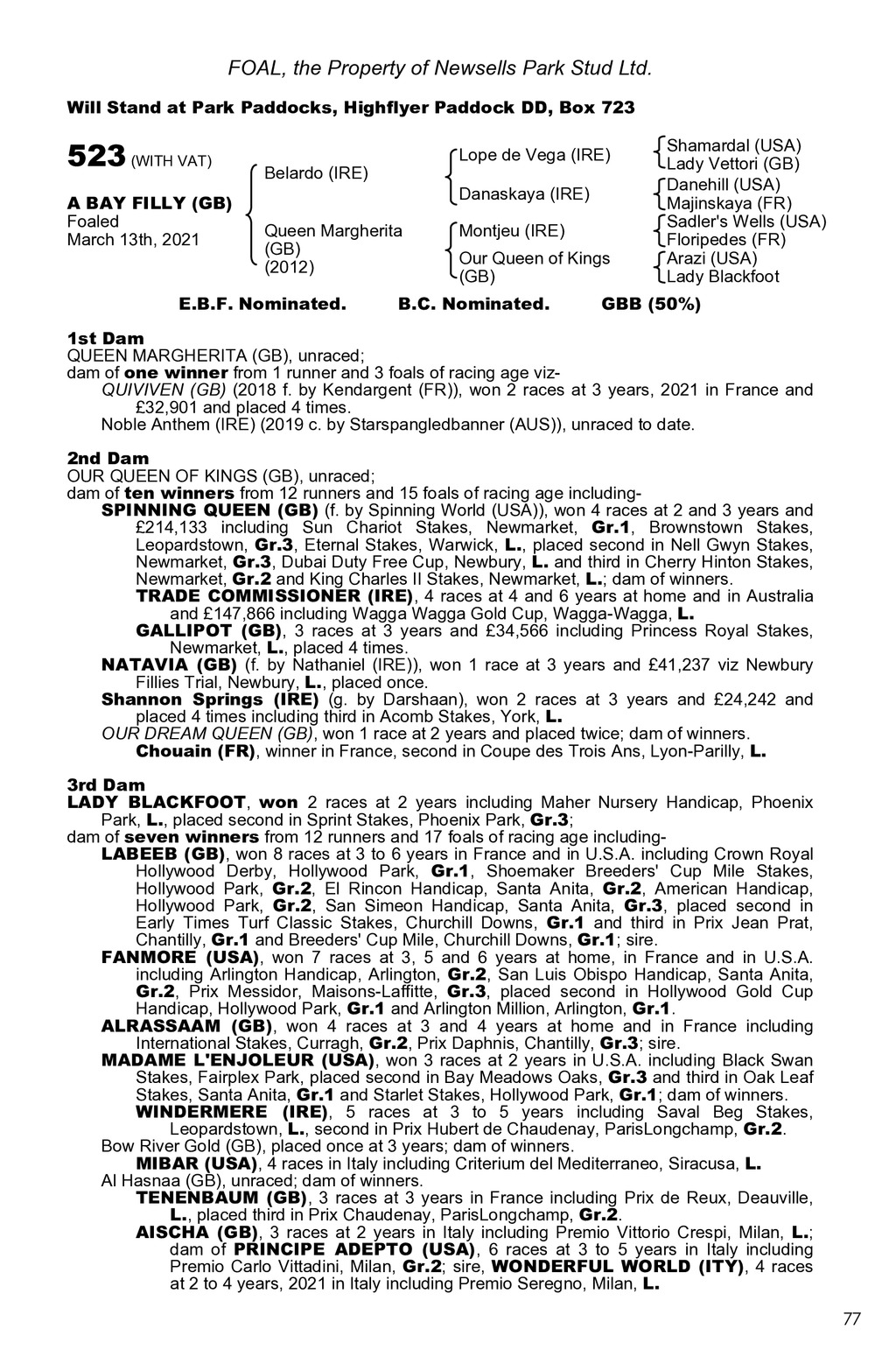 FOAL, the Property of Newsells Park Stud Ltd. Will Stand at Park Paddocks, Highflyer Paddock DD, Box 723 523 (WITH VAT) A BAY FILLY (GB) Foaled March 13th, 2021 Lope de Vega (IRE) Belardo (IRE) Danaskaya (IRE) Queen Margherita (GB) (2012) E.B.F. Nominated. Montjeu (IRE) Our Queen of Kings (GB) B.C. Nominated. Shamardal (USA) Lady Vettori (GB) Danehill (USA) Majinskaya (FR) Sadler s Wells (USA) Floripedes (FR) Arazi (USA) Lady Blackfoot GBB (50%) 1st Dam QUEEN MARGHERITA (GB), unraced; dam of one winner from 1 runner and 3 foals of racing age vizQUIVIVEN (GB) (2018 f. by Kendargent (FR)), won 2 races at 3 years, 2021 in France and 32,901 and placed 4 times. Noble Anthem (IRE) (2019 c. by Starspangledbanner (AUS)), unraced to date. 2nd Dam OUR QUEEN OF KINGS (GB), unraced; dam of ten winners from 12 runners and 15 foals of racing age includingSPINNING QUEEN (GB) (f. by Spinning World (USA)), won 4 races at 2 and 3 years and 214,133 including Sun Chariot Stakes, Newmarket, Gr.1, Brownstown Stakes, Leopardstown, Gr.3, Eternal Stakes, Warwick, L., placed second in Nell Gwyn Stakes, Newmarket, Gr.3, Dubai Duty Free Cup, Newbury, L. and third in Cherry Hinton Stakes, Newmarket, Gr.2 and King Charles II Stakes, Newmarket, L.; dam of winners. TRADE COMMISSIONER (IRE), 4 races at 4 and 6 years at home and in Australia and 147,866 including Wagga Wagga Gold Cup, Wagga-Wagga, L. GALLIPOT (GB), 3 races at 3 years and 34,566 including Princess Royal Stakes, Newmarket, L., placed 4 times. NATAVIA (GB) (f. by Nathaniel (IRE)), won 1 race at 3 years and 41,237 viz Newbury Fillies Trial, Newbury, L., placed once. Shannon Springs (IRE) (g. by Darshaan), won 2 races at 3 years and 24,242 and placed 4 times including third in Acomb Stakes, York, L. OUR DREAM QUEEN (GB), won 1 race at 2 years and placed twice; dam of winners. Chouain (FR), winner in France, second in Coupe des Trois Ans, Lyon-Parilly, L. 3rd Dam LADY BLACKFOOT, won 2 races at 2 years including Maher Nursery Handicap, Phoenix Park, L., placed second in Sprint Stakes, Phoenix Park, Gr.3; dam of seven winners from 12 runners and 17 foals of racing age includingLABEEB (GB), won 8 races at 3 to 6 years in France and in U.S.A. including Crown Royal Hollywood Derby, Hollywood Park, Gr.1, Shoemaker Breeders Cup Mile Stakes, Hollywood Park, Gr.2, El Rincon Handicap, Santa Anita, Gr.2, American Handicap, Hollywood Park, Gr.2, San Simeon Handicap, Santa Anita, Gr.3, placed second in Early Times Turf Classic Stakes, Churchill Downs, Gr.1 and third in Prix Jean Prat, Chantilly, Gr.1 and Breeders Cup Mile, Churchill Downs, Gr.1; sire. FANMORE (USA), won 7 races at 3, 5 and 6 years at home, in France and in U.S.A. including Arlington Handicap, Arlington, Gr.2, San Luis Obispo Handicap, Santa Anita, Gr.2, Prix Messidor, Maisons-Laffitte, Gr.3, placed second in Hollywood Gold Cup Handicap, Hollywood Park, Gr.1 and Arlington Million, Arlington, Gr.1. ALRASSAAM (GB), won 4 races at 3 and 4 years at home and in France including International Stakes, Curragh, Gr.2, Prix Daphnis, Chantilly, Gr.3; sire. MADAME L ENJOLEUR (USA), won 3 races at 2 years in U.S.A. including Black Swan Stakes, Fairplex Park, placed second in Bay Meadows Oaks, Gr.3 and third in Oak Leaf Stakes, Santa Anita, Gr.1 and Starlet Stakes, Hollywood Park, Gr.1; dam of winners. WINDERMERE (IRE), 5 races at 3 to 5 years including Saval Beg Stakes, Leopardstown, L., second in Prix Hubert de Chaudenay, ParisLongchamp, Gr.2. Bow River Gold (GB), placed once at 3 years; dam of winners. MIBAR (USA), 4 races in Italy including Criterium del Mediterraneo, Siracusa, L. Al Hasnaa (GB), unraced; dam of winners. TENENBAUM (GB), 3 races at 3 years in France including Prix de Reux, Deauville, L., placed third in Prix Chaudenay, ParisLongchamp, Gr.2. AISCHA (GB), 3 races at 2 years in Italy including Premio Vittorio Crespi, Milan, L.; dam of PRINCIPE ADEPTO (USA), 6 races at 3 to 5 years in Italy including Premio Carlo Vittadini, Milan, Gr.2; sire, WONDERFUL WORLD (ITY), 4 races at 2 to 4 years, 2021 in Italy including Premio Seregno, Milan, L. 77