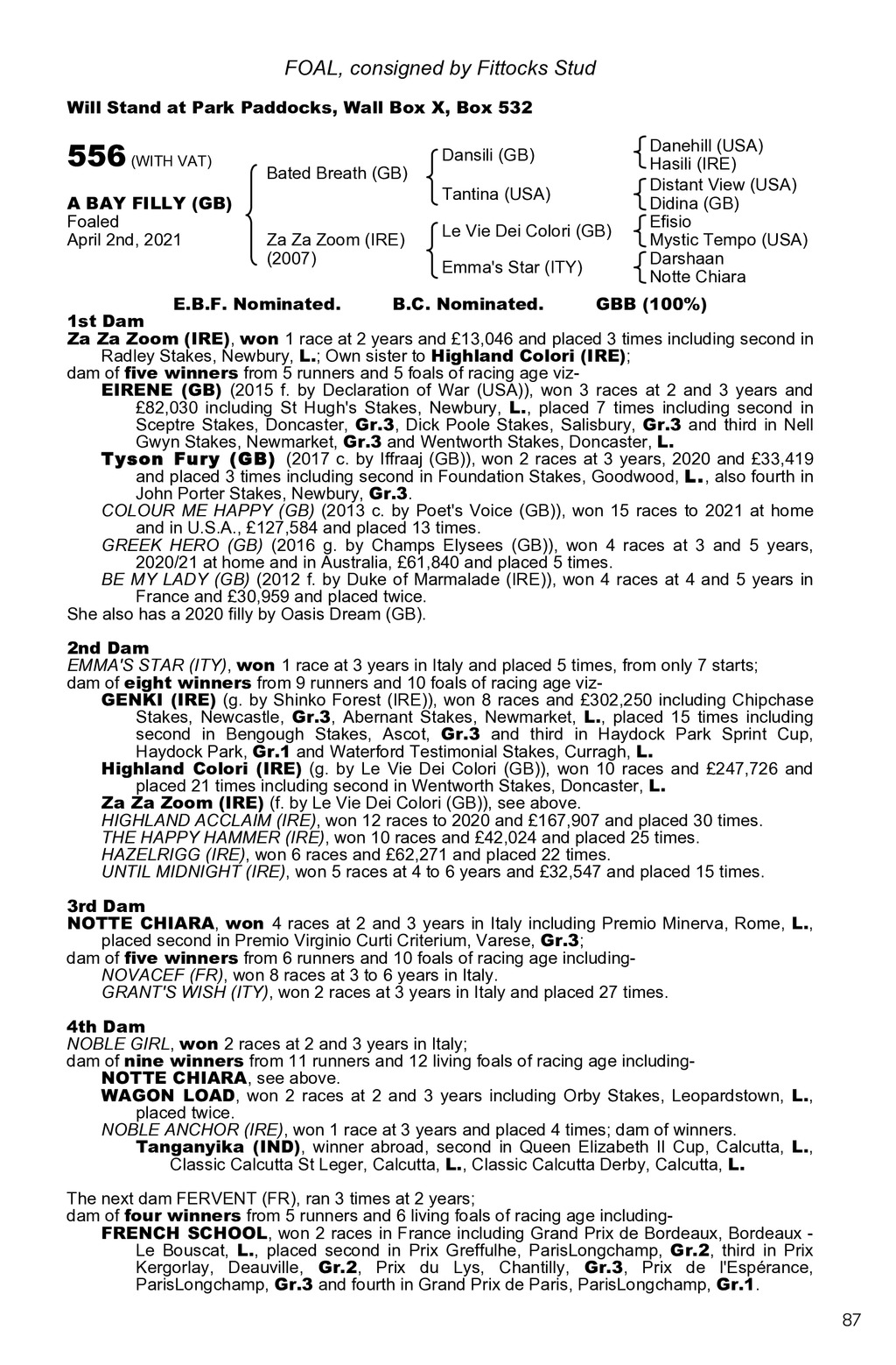 FOAL, consigned by Fittocks Stud Will Stand at Park Paddocks, Wall Box X, Box 532 556 (WITH VAT) A BAY FILLY (GB) Foaled April 2nd, 2021 Bated Breath (GB) Za Za Zoom (IRE) (2007) Dansili (GB) Tantina (USA) Le Vie Dei Colori (GB) Emma s Star (ITY) Danehill (USA) Hasili (IRE) Distant View (USA) Didina (GB) Efisio Mystic Tempo (USA) Darshaan Notte Chiara E.B.F. Nominated. B.C. Nominated. GBB (100%) 1st Dam Za Za Zoom (IRE), won 1 race at 2 years and 13,046 and placed 3 times including second in Radley Stakes, Newbury, L.; Own sister to Highland Colori (IRE); dam of five winners from 5 runners and 5 foals of racing age vizEIRENE (GB) (2015 f. by Declaration of War (USA)), won 3 races at 2 and 3 years and 82,030 including St Hugh s Stakes, Newbury, L., placed 7 times including second in Sceptre Stakes, Doncaster, Gr.3, Dick Poole Stakes, Salisbury, Gr.3 and third in Nell Gwyn Stakes, Newmarket, Gr.3 and Wentworth Stakes, Doncaster, L. T y s o n F u r y ( G B ) (2017 c. by Iffraaj (GB)), won 2 races at 3 years, 2020 and 33,419 and placed 3 times including second in Foundation Stakes, Goodwood, L . , also fourth in John Porter Stakes, Newbury, Gr.3. COLOUR ME HAPPY (GB) (2013 c. by Poet s Voice (GB)), won 15 races to 2021 at home and in U.S.A., 127,584 and placed 13 times. GREEK HERO (GB) (2016 g. by Champs Elysees (GB)), won 4 races at 3 and 5 years, 2020/21 at home and in Australia, 61,840 and placed 5 times. BE MY LADY (GB) (2012 f. by Duke of Marmalade (IRE)), won 4 races at 4 and 5 years in France and 30,959 and placed twice. She also has a 2020 filly by Oasis Dream (GB). 2nd Dam EMMA S STAR (ITY), won 1 race at 3 years in Italy and placed 5 times, from only 7 starts; dam of eight winners from 9 runners and 10 foals of racing age vizGENKI (IRE) (g. by Shinko Forest (IRE)), won 8 races and 302,250 including Chipchase Stakes, Newcastle, Gr.3, Abernant Stakes, Newmarket, L., placed 15 times including second in Bengough Stakes, Ascot, Gr.3 and third in Haydock Park Sprint Cup, Haydock Park, Gr.1 and Waterford Testimonial Stakes, Curragh, L. Highland Colori (IRE) (g. by Le Vie Dei Colori (GB)), won 10 races and 247,726 and placed 21 times including second in Wentworth Stakes, Doncaster, L. Za Za Zoom (IRE) (f. by Le Vie Dei Colori (GB)), see above. HIGHLAND ACCLAIM (IRE), won 12 races to 2020 and 167,907 and placed 30 times. THE HAPPY HAMMER (IRE), won 10 races and 42,024 and placed 25 times. HAZELRIGG (IRE), won 6 races and 62,271 and placed 22 times. UNTIL MIDNIGHT (IRE), won 5 races at 4 to 6 years and 32,547 and placed 15 times. 3rd Dam NOTTE CHIARA, won 4 races at 2 and 3 years in Italy including Premio Minerva, Rome, L., placed second in Premio Virginio Curti Criterium, Varese, Gr.3; dam of five winners from 6 runners and 10 foals of racing age includingNOVACEF (FR), won 8 races at 3 to 6 years in Italy. GRANT S WISH (ITY), won 2 races at 3 years in Italy and placed 27 times. 4th Dam NOBLE GIRL, won 2 races at 2 and 3 years in Italy; dam of nine winners from 11 runners and 12 living foals of racing age includingNOTTE CHIARA, see above. WAGON LOAD, won 2 races at 2 and 3 years including Orby Stakes, Leopardstown, L., placed twice. NOBLE ANCHOR (IRE), won 1 race at 3 years and placed 4 times; dam of winners. Tanganyika (IND), winner abroad, second in Queen Elizabeth II Cup, Calcutta, L., Classic Calcutta St Leger, Calcutta, L., Classic Calcutta Derby, Calcutta, L. The next dam FERVENT (FR), ran 3 times at 2 years; dam of four winners from 5 runners and 6 living foals of racing age includingFRENCH SCHOOL, won 2 races in France including Grand Prix de Bordeaux, Bordeaux Le Bouscat, L., placed second in Prix Greffulhe, ParisLongchamp, Gr.2, third in Prix Kergorlay, Deauville, Gr.2, Prix du Lys, Chantilly, Gr.3, Prix de l Esprance, ParisLongchamp, Gr.3 and fourth in Grand Prix de Paris, ParisLongchamp, Gr.1. 87
