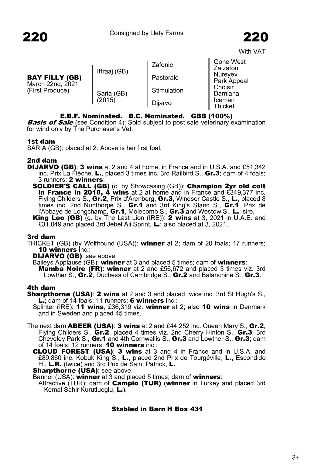 0100Y99.GUI 00Saria (GB)|2021|F|A|2837919 220 220 Consigned by Llety Farms With VAT BAY FILLY (GB) March 22nd, 2021 (First Produce) Iffraaj (GB) Saria (GB) (2015) Zafonic Pastorale Stimulation Dijarvo Gone West Zaizafon Nureyev Park Appeal Choisir Damiana Iceman Thicket E.B.F. Nominated. B.C. Nominated. GBB (100%) Basis of Sale (see Condition 4): Sold subject to post sale veterinary examination for wind only by The Purchasers Vet. 1st dam SARIA (GB): placed at 2. Above is her first foal. 2nd dam DIJARVO (GB): 3 wins at 2 and 4 at home, in France and in U.S.A. and 51,342 inc. Prix La Flche, L., placed 3 times inc. 3rd Railbird S., Gr.3; dam of 4 foals; 3 runners; 2 winners: SOLDIER S CALL (GB) (c. by Showcasing (GB)): Champion 2yr old colt in France in 2018, 4 wins at 2 at home and in France and 349,377 inc. Flying Childers S., Gr.2, Prix d Arenberg, Gr.3, Windsor Castle S., L., placed 8 times inc. 2nd Nunthorpe S., Gr.1 and 3rd King s Stand S., Gr.1, Prix de l Abbaye de Longchamp, Gr.1, Molecomb S., Gr.3 and Westow S., L.; sire. King Leo (GB) (g. by The Last Lion (IRE)): 2 wins at 3, 2021 in U.A.E. and 31,049 and placed 3rd Jebel Ali Sprint, L.; also placed at 3, 2021. 3rd dam THICKET (GB) (by Wolfhound (USA)): winner at 2; dam of 20 foals; 17 runners; 10 winners inc.: DIJARVO (GB): see above. Baileys Applause (GB): winner at 3 and placed 5 times; dam of winners: Mamba Noire (FR): winner at 2 and 56,672 and placed 3 times viz. 3rd Lowther S., Gr.2, Duchess of Cambridge S., Gr.2 and Balanchine S., Gr.3. 4th dam Sharpthorne (USA): 2 wins at 2 and 3 and placed twice inc. 3rd St Hugh s S., L.; dam of 14 foals; 11 runners; 6 winners inc.: Splinter (IRE): 11 wins, 36,319 viz. winner at 2; also 10 wins in Denmark and in Sweden and placed 45 times. The next dam ABEER (USA): 3 wins at 2 and 44,252 inc. Queen Mary S., Gr.2, Flying Childers S., Gr.2, placed 4 times viz. 2nd Cherry Hinton S., Gr.3, 3rd Cheveley Park S., Gr.1 and 4th Cornwallis S., Gr.3 and Lowther S., Gr.3; dam of 14 foals; 12 runners; 10 winners inc.: CLOUD FOREST (USA): 3 wins at 3 and 4 in France and in U.S.A. and 89,860 inc. Kobuk King S., L., placed 2nd Prix de Tourgville, L., Escondido H., L.R. (twice) and 3rd Prix de Saint Patrick, L. Sharpthorne (USA): see above. Banner (USA): winner at 3 and placed 5 times; dam of winners: Attractive (TUR); dam of Campio (TUR) (winner in Turkey and placed 3rd Kemal Sahir Kurutluoglu, L.). Stabled in Barn Box Stabled in Barn H Box 431 34