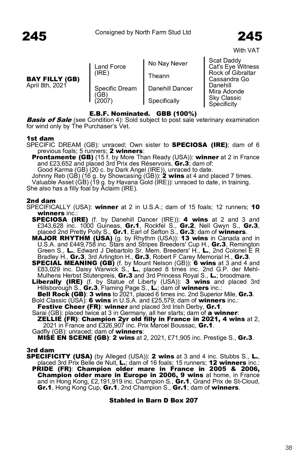 0052Z48.GUI 00Specific Dream (GB)|2021|F|A|2840225 245 Consigned by North Farm Stud Ltd 245 With VAT BAY FILLY (GB) April 8th, 2021 Land Force (IRE) No Nay Never Specific Dream (GB) (2007) Danehill Dancer Theann Specifically Scat Daddy Cat s Eye Witness Rock of Gibraltar Cassandra Go Danehill Mira Adonde Sky Classic Specificity E.B.F. Nominated. GBB (100%) Basis of Sale (see Condition 4): Sold subject to post sale veterinary examination for wind only by The Purchasers Vet. 1st dam SPECIFIC DREAM (GB): unraced; Own sister to SPECIOSA (IRE); dam of 6 previous foals; 5 runners; 2 winners: Prontamente (GB) (15 f. by More Than Ready (USA)): winner at 2 in France and 23,652 and placed 3rd Prix des Rservoirs, Gr.3; dam of: Good Karma (GB) (20 c. by Dark Angel (IRE)), unraced to date. Johnny Reb (GB) (16 g. by Showcasing (GB)): 2 wins at 4 and placed 7 times. Valuable Asset (GB) (19 g. by Havana Gold (IRE)): unraced to date, in training. She also has a filly foal by Aclaim (IRE). 2nd dam SPECIFICALLY (USA): winner at 2 in U.S.A.; dam of 15 foals; 12 runners; 10 winners inc.: SPECIOSA (IRE) (f. by Danehill Dancer (IRE)): 4 wins at 2 and 3 and 343,628 inc. 1000 Guineas, Gr.1, Rockfel S., Gr.2, Nell Gwyn S., Gr.3, placed 2nd Pretty Polly S., Gr.1, Earl of Sefton S., Gr.3; dam of winners. MAJOR RHYTHM (USA) (g. by Rhythm (USA)): 13 wins in Canada and in U.S.A. and 449,758 inc. Stars and Stripes Breeders Cup H., Gr.3, Remington Green S., L., Edward J Debartolo Sr. Mem. Breeders H., L., 2nd Colonel E R Bradley H., Gr.3, 3rd Arlington H., Gr.3, Robert F Carey Memorial H., Gr.3. SPECIAL MEANING (GB) (f. by Mount Nelson (GB)): 6 wins at 3 and 4 and 83,029 inc. Daisy Warwick S., L., placed 8 times inc. 2nd G.P. der MehlMulhens Herbst Stutenpreis, Gr.3 and 3rd Princess Royal S., L.; broodmare. Liberally (IRE) (f. by Statue of Liberty (USA)): 3 wins and placed 3rd Hillsborough S., Gr.3, Flaming Page S., L.; dam of winners inc.: Bell Rock (GB): 3 wins to 2021, placed 6 times inc. 2nd Superior Mile, Gr.3. Bold Classic (USA): 6 wins in U.S.A. and 25,579; dam of winners inc.: Festive Cheer (FR): winner and placed 3rd Irish Derby, Gr.1. Sarai (GB): placed twice at 3 in Germany, all her starts; dam of a winner: ZELLIE (FR): Champion 2yr old filly in France in 2021, 4 wins at 2, 2021 in France and 326,907 inc. Prix Marcel Boussac, Gr.1. Gadfly (GB): unraced; dam of winners: MISE EN SCENE (GB): 2 wins at 2, 2021, 71,905 inc. Prestige S., Gr.3. 3rd dam SPECIFICITY (USA) (by Alleged (USA)): 2 wins at 3 and 4 inc. Stubbs S., L., placed 3rd Prix Belle de Nuit, L.; dam of 16 foals; 15 runners; 12 winners inc.: PRIDE (FR): Champion older mare in France in 2005 & 2006, Champion older mare in Europe in 2006, 9 wins at home, in France and in Hong Kong, 2,191,919 inc. Champion S., Gr.1, Grand Prix de St-Cloud, Gr.1, Hong Kong Cup, Gr.1, 2nd Champion S., Gr.1; dam of winners. Stabled in Barn Box Stabled in Barn D Box 207 38
