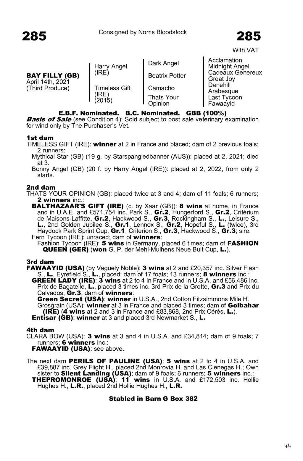 0314W83.GUI 00Timeless Gift (IRE)|2021|F|A|2842370 285 285 Consigned by Norris Bloodstock With VAT BAY FILLY (GB) April 14th, 2021 (Third Produce) Harry Angel (IRE) Dark Angel Timeless Gift (IRE) (2015) Camacho Thats Your Opinion Beatrix Potter Acclamation Midnight Angel Cadeaux Genereux Great Joy Danehill Arabesque Last Tycoon Fawaayid E.B.F. Nominated. B.C. Nominated. GBB (100%) Basis of Sale (see Condition 4): Sold subject to post sale veterinary examination for wind only by The Purchasers Vet. 1st dam TIMELESS GIFT (IRE): winner at 2 in France and placed; dam of 2 previous foals; 2 runners: Mythical Star (GB) (19 g. by Starspangledbanner (AUS)): placed at 2, 2021; died at 3. Bonny Angel (GB) (20 f. by Harry Angel (IRE)): placed at 2, 2022, from only 2 starts. 2nd dam THATS YOUR OPINION (GB): placed twice at 3 and 4; dam of 11 foals; 6 runners; 2 winners inc.: BALTHAZAAR S GIFT (IRE) (c. by Xaar (GB)): 8 wins at home, in France and in U.A.E. and 571,754 inc. Park S., Gr.2, Hungerford S., Gr.2, Critrium de Maisons-Laffitte, Gr.2, Hackwood S., Gr.3, Rockingham S., L., Leisure S., L., 2nd Golden Jubilee S., Gr.1, Lennox S., Gr.2, Hopeful S., L. (twice), 3rd Haydock Park Sprint Cup, Gr.1, Criterion S., Gr.3, Hackwood S., Gr.3; sire. Fern Tycoon (IRE): unraced; dam of winners: Fashion Tycoon (IRE): 5 wins in Germany, placed 6 times; dam of FASHION QUEEN (GER) (won G. P. der Mehl-Mulhens Neue Bult Cup, L.). 3rd dam FAWAAYID (USA) (by Vaguely Noble): 3 wins at 2 and 20,357 inc. Silver Flash S., L., Eyrefield S., L., placed; dam of 17 foals; 13 runners; 8 winners inc.: GREEN LADY (IRE): 3 wins at 2 to 4 in France and in U.S.A. and 56,486 inc. Prix de Bagatelle, L., placed 3 times inc. 3rd Prix de la Grotte, Gr.3 and Prix du Calvados, Gr.3; dam of winners: Green Secret (USA): winner in U.S.A., 2nd Cotton Fitzsimmons Mile H. Grosgrain (USA): winner at 3 in France and placed 3 times; dam of Golbahar (IRE) (4 wins at 2 and 3 in France and 83,868, 2nd Prix Crs, L.). Entisar (GB): winner at 3 and placed 3rd Newmarket S., L. 4th dam CLARA BOW (USA): 3 wins at 3 and 4 in U.S.A. and 34,814; dam of 9 foals; 7 runners; 6 winners inc.: FAWAAYID (USA): see above. The next dam PERILS OF PAULINE (USA): 5 wins at 2 to 4 in U.S.A. and 39,887 inc. Grey Flight H., placed 2nd Monrovia H. and Las Cienegas H.; Own sister to Silent Landing (USA); dam of 9 foals; 6 runners; 5 winners inc.: THEPROMONROE (USA): 11 wins in U.S.A. and 172,503 inc. Hollie Hughes H., L.R., placed 2nd Hollie Hughes H., L.R. Stabled in Barn Box Stabled in Barn G Box 382 44