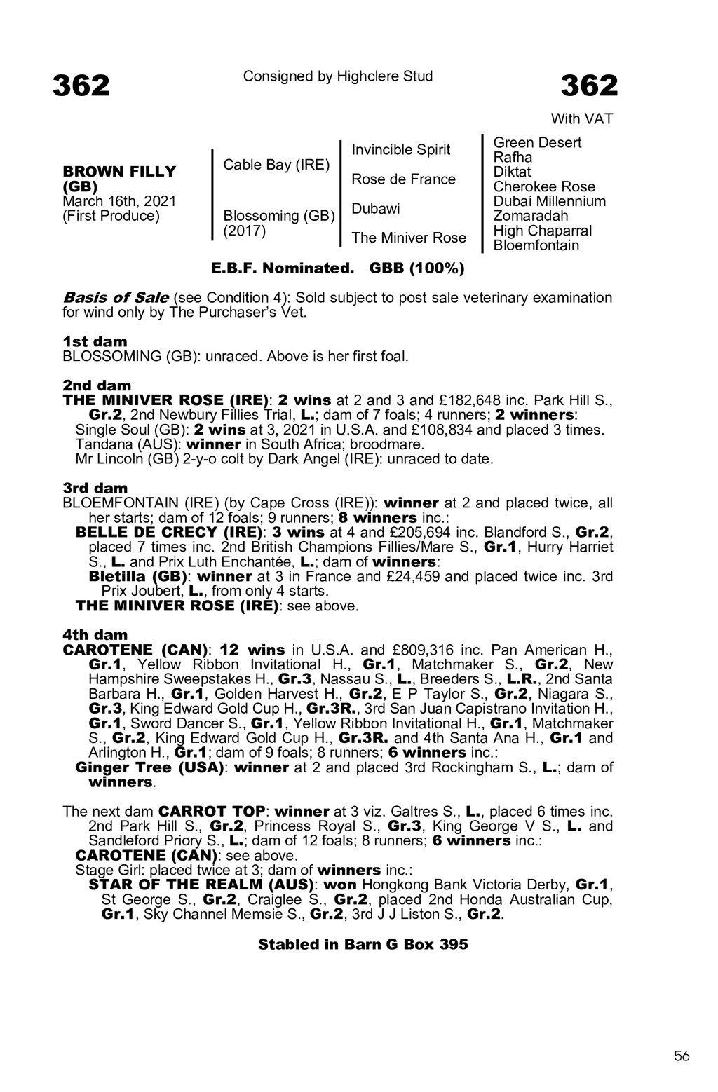 0290X08.GUI 00Blossoming (GB)|2021|F|A|2835647 362 Consigned by Highclere Stud 362 With VAT BROWN FILLY (GB) March 16th, 2021 (First Produce) Cable Bay (IRE) Blossoming (GB) (2017) Invincible Spirit Rose de France Dubawi The Miniver Rose Green Desert Rafha Diktat Cherokee Rose Dubai Millennium Zomaradah High Chaparral Bloemfontain E.B.F. Nominated. GBB (100%) Basis of Sale (see Condition 4): Sold subject to post sale veterinary examination for wind only by The Purchasers Vet. 1st dam BLOSSOMING (GB): unraced. Above is her first foal. 2nd dam THE MINIVER ROSE (IRE): 2 wins at 2 and 3 and 182,648 inc. Park Hill S., Gr.2, 2nd Newbury Fillies Trial, L.; dam of 7 foals; 4 runners; 2 winners: Single Soul (GB): 2 wins at 3, 2021 in U.S.A. and 108,834 and placed 3 times. Tandana (AUS): winner in South Africa; broodmare. Mr Lincoln (GB) 2-y-o colt by Dark Angel (IRE): unraced to date. 3rd dam BLOEMFONTAIN (IRE) (by Cape Cross (IRE)): winner at 2 and placed twice, all her starts; dam of 12 foals; 9 runners; 8 winners inc.: BELLE DE CRECY (IRE): 3 wins at 4 and 205,694 inc. Blandford S., Gr.2, placed 7 times inc. 2nd British Champions Fillies/Mare S., Gr.1, Hurry Harriet S., L. and Prix Luth Enchante, L.; dam of winners: Bletilla (GB): winner at 3 in France and 24,459 and placed twice inc. 3rd Prix Joubert, L., from only 4 starts. THE MINIVER ROSE (IRE): see above. 4th dam CAROTENE (CAN): 12 wins in U.S.A. and 809,316 inc. Pan American H., Gr.1, Yellow Ribbon Invitational H., Gr.1, Matchmaker S., Gr.2, New Hampshire Sweepstakes H., Gr.3, Nassau S., L., Breeders S., L.R., 2nd Santa Barbara H., Gr.1, Golden Harvest H., Gr.2, E P Taylor S., Gr.2, Niagara S., Gr.3, King Edward Gold Cup H., Gr.3R., 3rd San Juan Capistrano Invitation H., Gr.1, Sword Dancer S., Gr.1, Yellow Ribbon Invitational H., Gr.1, Matchmaker S., Gr.2, King Edward Gold Cup H., Gr.3R. and 4th Santa Ana H., Gr.1 and Arlington H., Gr.1; dam of 9 foals; 8 runners; 6 winners inc.: Ginger Tree (USA): winner at 2 and placed 3rd Rockingham S., L.; dam of winners. The next dam CARROT TOP: winner at 3 viz. Galtres S., L., placed 6 times inc. 2nd Park Hill S., Gr.2, Princess Royal S., Gr.3, King George V S., L. and Sandleford Priory S., L.; dam of 12 foals; 8 runners; 6 winners inc.: CAROTENE (CAN): see above. Stage Girl: placed twice at 3; dam of winners inc.: STAR OF THE REALM (AUS): won Hongkong Bank Victoria Derby, Gr.1, St George S., Gr.2, Craiglee S., Gr.2, placed 2nd Honda Australian Cup, Gr.1, Sky Channel Memsie S., Gr.2, 3rd J J Liston S., Gr.2. Stabled in Barn Box Stabled in Barn G Box 395 56