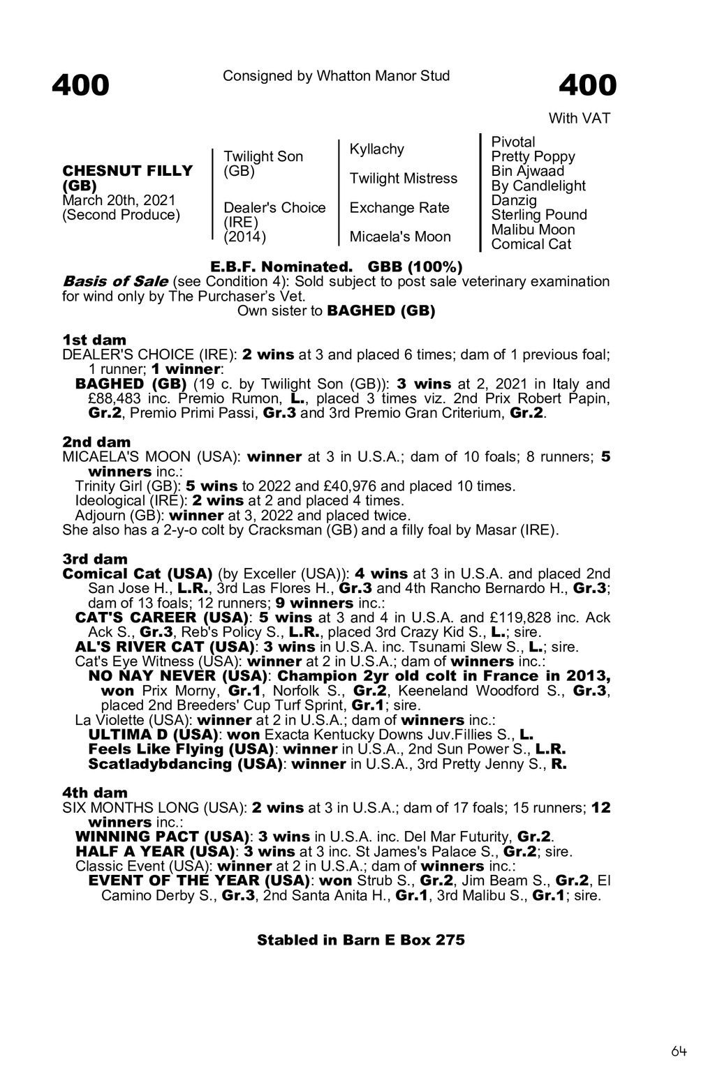 0089Z11.GUI 00Dealer s Choice (IRE)|2021|F|A|2835702 400 Consigned by Whatton Manor Stud 400 With VAT CHESNUT FILLY (GB) March 20th, 2021 (Second Produce) Twilight Son (GB) Kyllachy Dealer s Choice (IRE) (2014) Exchange Rate Twilight Mistress Micaela s Moon Pivotal Pretty Poppy Bin Ajwaad By Candlelight Danzig Sterling Pound Malibu Moon Comical Cat E.B.F. Nominated. GBB (100%) Basis of Sale (see Condition 4): Sold subject to post sale veterinary examination for wind only by The Purchasers Vet. Own sister to BAGHED (GB) 1st dam DEALER S CHOICE (IRE): 2 wins at 3 and placed 6 times; dam of 1 previous foal; 1 runner; 1 winner: BAGHED (GB) (19 c. by Twilight Son (GB)): 3 wins at 2, 2021 in Italy and 88,483 inc. Premio Rumon, L., placed 3 times viz. 2nd Prix Robert Papin, Gr.2, Premio Primi Passi, Gr.3 and 3rd Premio Gran Criterium, Gr.2. 2nd dam MICAELA S MOON (USA): winner at 3 in U.S.A.; dam of 10 foals; 8 runners; 5 winners inc.: Trinity Girl (GB): 5 wins to 2022 and 40,976 and placed 10 times. Ideological (IRE): 2 wins at 2 and placed 4 times. Adjourn (GB): winner at 3, 2022 and placed twice. She also has a 2-y-o colt by Cracksman (GB) and a filly foal by Masar (IRE). 3rd dam Comical Cat (USA) (by Exceller (USA)): 4 wins at 3 in U.S.A. and placed 2nd San Jose H., L.R., 3rd Las Flores H., Gr.3 and 4th Rancho Bernardo H., Gr.3; dam of 13 foals; 12 runners; 9 winners inc.: CAT S CAREER (USA): 5 wins at 3 and 4 in U.S.A. and 119,828 inc. Ack Ack S., Gr.3, Reb s Policy S., L.R., placed 3rd Crazy Kid S., L.; sire. AL S RIVER CAT (USA): 3 wins in U.S.A. inc. Tsunami Slew S., L.; sire. Cat s Eye Witness (USA): winner at 2 in U.S.A.; dam of winners inc.: NO NAY NEVER (USA): Champion 2yr old colt in France in 2013, won Prix Morny, Gr.1, Norfolk S., Gr.2, Keeneland Woodford S., Gr.3, placed 2nd Breeders Cup Turf Sprint, Gr.1; sire. La Violette (USA): winner at 2 in U.S.A.; dam of winners inc.: ULTIMA D (USA): won Exacta Kentucky Downs Juv.Fillies S., L. Feels Like Flying (USA): winner in U.S.A., 2nd Sun Power S., L.R. Scatladybdancing (USA): winner in U.S.A., 3rd Pretty Jenny S., R. 4th dam SIX MONTHS LONG (USA): 2 wins at 3 in U.S.A.; dam of 17 foals; 15 runners; 12 winners inc.: WINNING PACT (USA): 3 wins in U.S.A. inc. Del Mar Futurity, Gr.2. HALF A YEAR (USA): 3 wins at 3 inc. St James s Palace S., Gr.2; sire. Classic Event (USA): winner at 2 in U.S.A.; dam of winners inc.: EVENT OF THE YEAR (USA): won Strub S., Gr.2, Jim Beam S., Gr.2, El Camino Derby S., Gr.3, 2nd Santa Anita H., Gr.1, 3rd Malibu S., Gr.1; sire. Stabled in Barn Box Stabled in Barn E Box 275 64