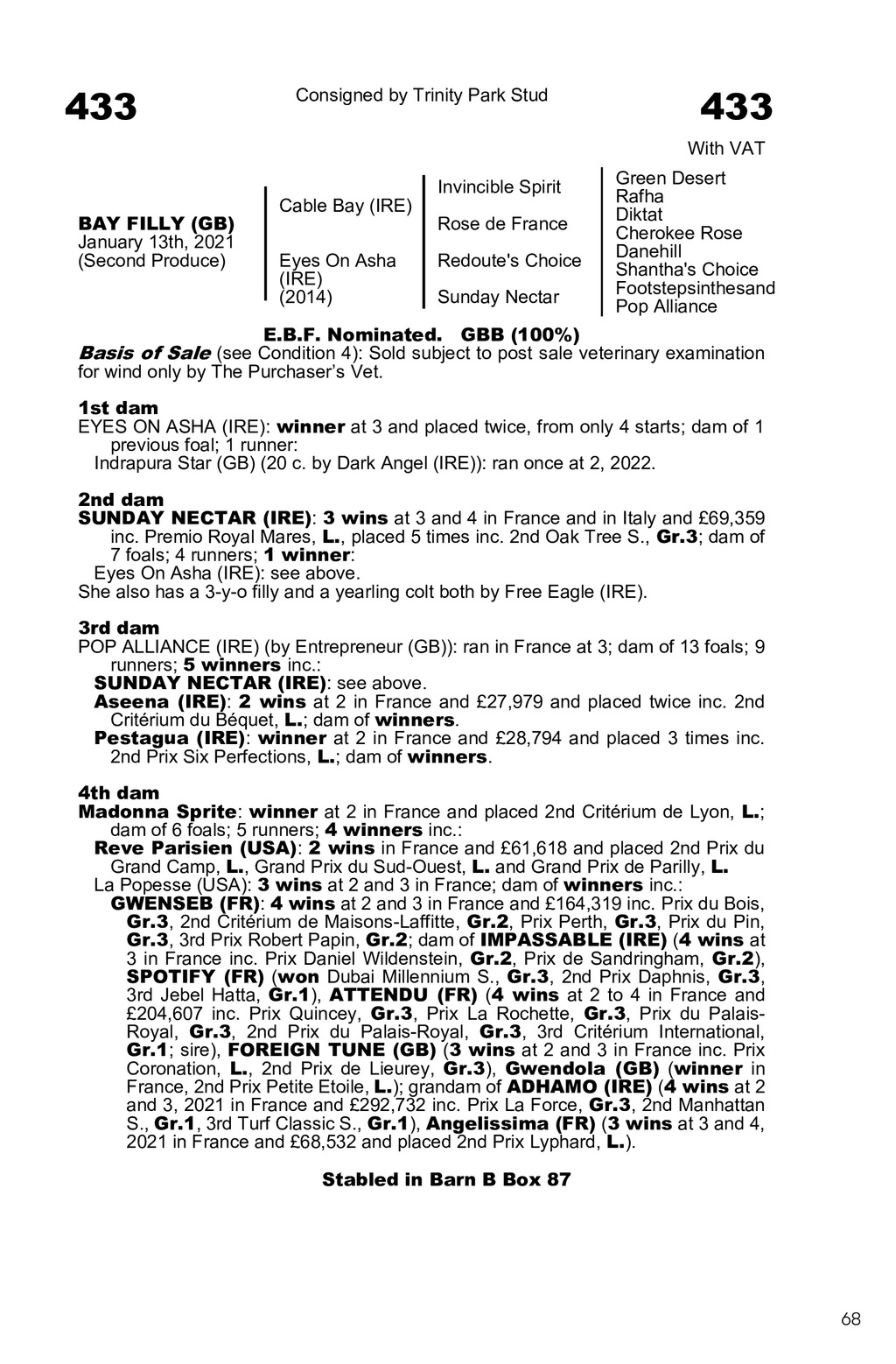 0305W92.GUI 00Eyes On Asha (IRE)|2021|F|A|2793671 433 Consigned by Trinity Park Stud 433 With VAT BAY FILLY (GB) January 13th, 2021 (Second Produce) Cable Bay (IRE) Eyes On Asha (IRE) (2014) Invincible Spirit Rose de France Redoute s Choice Sunday Nectar Green Desert Rafha Diktat Cherokee Rose Danehill Shantha s Choice Footstepsinthesand Pop Alliance E.B.F. Nominated. GBB (100%) Basis of Sale (see Condition 4): Sold subject to post sale veterinary examination for wind only by The Purchasers Vet. 1st dam EYES ON ASHA (IRE): winner at 3 and placed twice, from only 4 starts; dam of 1 previous foal; 1 runner: Indrapura Star (GB) (20 c. by Dark Angel (IRE)): ran once at 2, 2022. 2nd dam SUNDAY NECTAR (IRE): 3 wins at 3 and 4 in France and in Italy and 69,359 inc. Premio Royal Mares, L., placed 5 times inc. 2nd Oak Tree S., Gr.3; dam of 7 foals; 4 runners; 1 winner: Eyes On Asha (IRE): see above. She also has a 3-y-o filly and a yearling colt both by Free Eagle (IRE). 3rd dam POP ALLIANCE (IRE) (by Entrepreneur (GB)): ran in France at 3; dam of 13 foals; 9 runners; 5 winners inc.: SUNDAY NECTAR (IRE): see above. Aseena (IRE): 2 wins at 2 in France and 27,979 and placed twice inc. 2nd Critrium du Bquet, L.; dam of winners. Pestagua (IRE): winner at 2 in France and 28,794 and placed 3 times inc. 2nd Prix Six Perfections, L.; dam of winners. 4th dam Madonna Sprite: winner at 2 in France and placed 2nd Critrium de Lyon, L.; dam of 6 foals; 5 runners; 4 winners inc.: Reve Parisien (USA): 2 wins in France and 61,618 and placed 2nd Prix du Grand Camp, L., Grand Prix du Sud-Ouest, L. and Grand Prix de Parilly, L. La Popesse (USA): 3 wins at 2 and 3 in France; dam of winners inc.: GWENSEB (FR): 4 wins at 2 and 3 in France and 164,319 inc. Prix du Bois, Gr.3, 2nd Critrium de Maisons-Laffitte, Gr.2, Prix Perth, Gr.3, Prix du Pin, Gr.3, 3rd Prix Robert Papin, Gr.2; dam of IMPASSABLE (IRE) (4 wins at 3 in France inc. Prix Daniel Wildenstein, Gr.2, Prix de Sandringham, Gr.2), SPOTIFY (FR) (won Dubai Millennium S., Gr.3, 2nd Prix Daphnis, Gr.3, 3rd Jebel Hatta, Gr.1), ATTENDU (FR) (4 wins at 2 to 4 in France and 204,607 inc. Prix Quincey, Gr.3, Prix La Rochette, Gr.3, Prix du PalaisRoyal, Gr.3, 2nd Prix du Palais-Royal, Gr.3, 3rd Critrium International, Gr.1; sire), FOREIGN TUNE (GB) (3 wins at 2 and 3 in France inc. Prix Coronation, L., 2nd Prix de Lieurey, Gr.3), Gwendola (GB) (winner in France, 2nd Prix Petite Etoile, L.); grandam of ADHAMO (IRE) (4 wins at 2 and 3, 2021 in France and 292,732 inc. Prix La Force, Gr.3, 2nd Manhattan S., Gr.1, 3rd Turf Classic S., Gr.1), Angelissima (FR) (3 wins at 3 and 4, 2021 in France and 68,532 and placed 2nd Prix Lyphard, L.). Stabled in Barn Box Stabled in Barn B Box 87 68