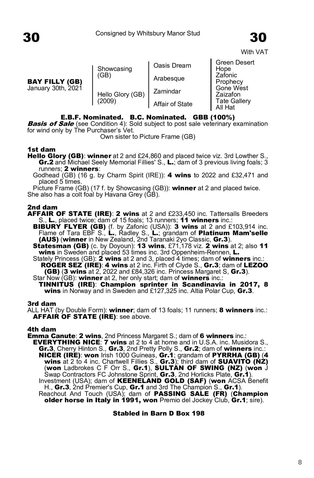 0062Z38.GUI 00Hello Glory (GB)|2021|F|A|2795481 30 30 Consigned by Whitsbury Manor Stud With VAT BAY FILLY (GB) January 30th, 2021 Showcasing (GB) Oasis Dream Hello Glory (GB) (2009) Zamindar Arabesque Affair of State Green Desert Hope Zafonic Prophecy Gone West Zaizafon Tate Gallery All Hat E.B.F. Nominated. B.C. Nominated. GBB (100%) Basis of Sale (see Condition 4): Sold subject to post sale veterinary examination for wind only by The Purchasers Vet. Own sister to Picture Frame (GB) 1st dam Hello Glory (GB): winner at 2 and 24,860 and placed twice viz. 3rd Lowther S., Gr.2 and Michael Seely Memorial Fillies S., L.; dam of 3 previous living foals; 3 runners; 2 winners: Godhead (GB) (16 g. by Charm Spirit (IRE)): 4 wins to 2022 and 32,471 and placed 5 times. Picture Frame (GB) (17 f. by Showcasing (GB)): winner at 2 and placed twice. She also has a colt foal by Havana Grey (GB). 2nd dam AFFAIR OF STATE (IRE): 2 wins at 2 and 233,450 inc. Tattersalls Breeders S., L., placed twice; dam of 15 foals; 13 runners; 11 winners inc.: BIBURY FLYER (GB) (f. by Zafonic (USA)): 3 wins at 2 and 103,914 inc. Flame of Tara EBF S., L., Radley S., L.; grandam of Platinum Mam selle (AUS) (winner in New Zealand, 2nd Taranaki 2yo Classic, Gr.3). Statesman (GB) (c. by Doyoun): 13 wins, 71,178 viz. 2 wins at 2; also 11 wins in Sweden and placed 53 times inc. 3rd Oppenheim-Rennen, L. Stately Princess (GB): 2 wins at 2 and 3, placed 4 times; dam of winners inc.: ROGER SEZ (IRE): 4 wins at 2 inc. Firth of Clyde S., Gr.3; dam of LEZOO (GB) (3 wins at 2, 2022 and 84,326 inc. Princess Margaret S, Gr.3). Star Now (GB): winner at 2, her only start; dam of winners inc.: TINNITUS (IRE): Champion sprinter in Scandinavia in 2017, 8 wins in Norway and in Sweden and 127,325 inc. Altia Polar Cup, Gr.3. 3rd dam ALL HAT (by Double Form): winner; dam of 13 foals; 11 runners; 8 winners inc.: AFFAIR OF STATE (IRE): see above. 4th dam Emma Canute: 2 wins, 2nd Princess Margaret S.; dam of 6 winners inc.: EVERYTHING NICE: 7 wins at 2 to 4 at home and in U.S.A. inc. Musidora S., Gr.3, Cherry Hinton S., Gr.3, 2nd Pretty Polly S., Gr.2; dam of winners inc.: NICER (IRE): won Irish 1000 Guineas, Gr.1; grandam of PYRRHA (GB) (4 wins at 2 to 4 inc. Chartwell Fillies S., Gr.3); third dam of SUAVITO (NZ) (won Ladbrokes C F Orr S., Gr.1), SULTAN OF SWING (NZ) (won J Swap Contractors FC Johnstone Sprint, Gr.3, 2nd Horlicks Plate, Gr.1). Investment (USA); dam of KEENELAND GOLD (SAF) (won ACSA Benefit H., Gr.3, 2nd Premier s Cup, Gr.1 and 3rd The Champion S., Gr.1). Reachout And Touch (USA); dam of PASSING SALE (FR) (Champion older horse in Italy in 1991, won Premio del Jockey Club, Gr.1; sire). Stabled in Barn Box Stabled in Barn D Box 198 8