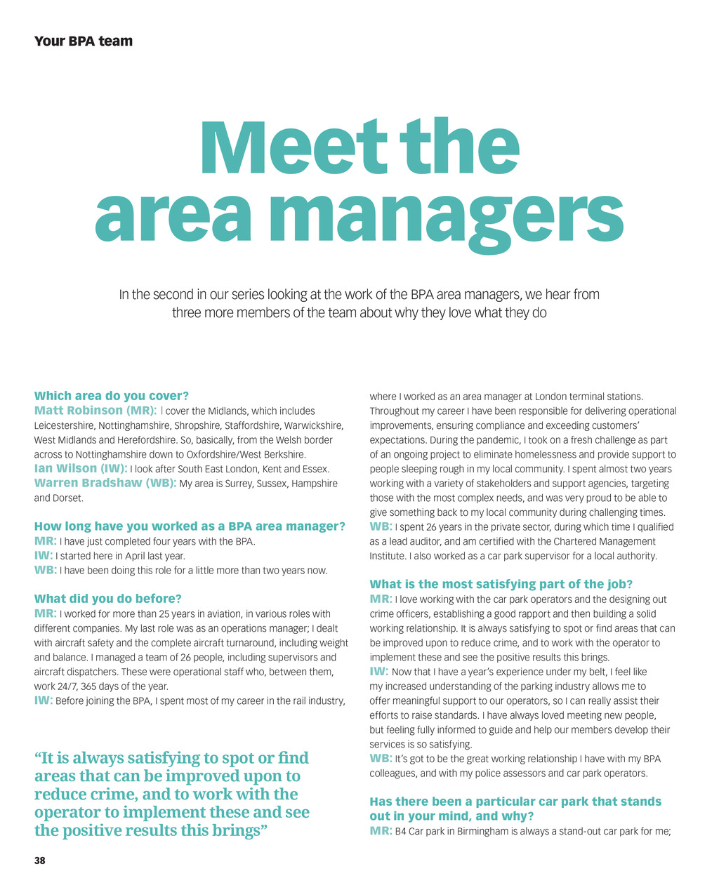 Your BPA team Meet the area managers In the second in our series looking at the work of the BPA area managers, we hear from three more members of the team about why they love what they do Which area do you cover? Matt Robinson (MR): I cover the Midlands, which includes Leicestershire, Nottinghamshire, Shropshire, Staffordshire, Warwickshire, West Midlands and Herefordshire. So, basically, from the Welsh border across to Nottinghamshire down to Oxfordshire/West Berkshire. Ian Wilson (IW): I look after South East London, Kent and Essex. Warren Bradshaw (WB): My area is Surrey, Sussex, Hampshire and Dorset. How long have you worked as a BPA area manager? MR: I have just completed four years with the BPA. IW: I started here in April last year. WB: I have been doing this role for a little more than two years now. What did you do before? MR: I worked for more than 25 years in aviation, in various roles with different companies. My last role was as an operations manager; I dealt with aircraft safety and the complete aircraft turnaround, including weight and balance. I managed a team of 26 people, including supervisors and aircraft dispatchers. These were operational staff who, between them, work 24/7, 365 days of the year. IW: Before joining the BPA, I spent most of my career in the rail industry, It is always satisfying to spot or find areas that can be improved upon to reduce crime, and to work with the operator to implement these and see the positive results this brings where I worked as an area manager at London terminal stations. Throughout my career I have been responsible for delivering operational improvements, ensuring compliance and exceeding customers expectations. During the pandemic, I took on a fresh challenge as part of an ongoing project to eliminate homelessness and provide support to people sleeping rough in my local community. I spent almost two years working with a variety of stakeholders and support agencies, targeting those with the most complex needs, and was very proud to be able to give something back to my local community during challenging times. WB: I spent 26 years in the private sector, during which time I qualified as a lead auditor, and am certified with the Chartered Management Institute. I also worked as a car park supervisor for a local authority. What is the most satisfying part of the job? MR: I love working with the car park operators and the designing out crime officers, establishing a good rapport and then building a solid working relationship. It is always satisfying to spot or find areas that can be improved upon to reduce crime, and to work with the operator to implement these and see the positive results this brings. IW: Now that I have a years experience under my belt, I feel like my increased understanding of the parking industry allows me to offer meaningful support to our operators, so I can really assist their efforts to raise standards. I have always loved meeting new people, but feeling fully informed to guide and help our members develop their services is so satisfying. WB: Its got to be the great working relationship I have with my BPA colleagues, and with my police assessors and car park operators. Has there been a particular car park that stands out in your mind, and why? MR: B4 Car park in Birmingham is always a stand-out car park for me; 38 PN May 2023 pp38-39 Area managers.indd 38 25/04/2023 11:31
