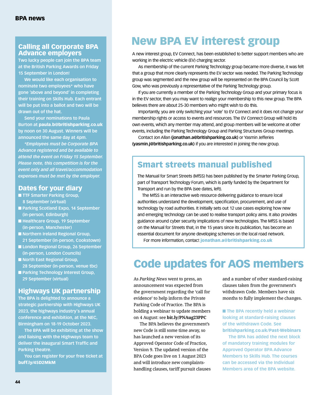 BPA news Calling all Corporate BPA Advance employers Two lucky people can join the BPA team at the British Parking Awards on Friday 15 September in London! We would like each organisation to nominate two employees* who have gone above and beyond in completing their training on Skills Hub. Each entrant will be put into a ballot and two will be drawn out of the hat. Send your nominations to Paula Burton at paula.b@britishparking.co.uk by noon on 30 August. Winners will be announced the same day at 4pm. *Employees must be Corporate BPA Advance registered and be available to attend the event on Friday 15 September. Please note, this competition is for the event only and all travel/accommodation expenses must be met by the employer. Dates for your diary TTF Smarter Parking Group, 8 September (virtual) Parking Scotland Expo, 14 September (in-person, Edinburgh) Healthcare Group, 19 September (in-person, Manchester) Northern Ireland Regional Group, 21 September (in-person, Cookstown) London Regional Group, 26 September (in-person, London Councils) North East Regional Group, 28 September (in-person, venue tbc) Parking Technology Interest Group, 29 September (virtual) Highways UK partnership The BPA is delighted to announce a strategic partnership with Highways UK 2023, the highways industrys annual conference and exhibition, at the NEC, Birmingham on 18-19 October 2023. The BPA will be exhibiting at the show and liaising with the Highways team to deliver the inaugural Smart Traffic and Parking theatre. You can register for your free ticket at buff.ly/45D2MkM 44 New BPA EV interest group A new interest group, EV Connect, has been established to better support members who are working in the electric vehicle (EV) charging sector. As membership of the current Parking Technology group became more diverse, it was felt that a group that more clearly represents the EV sector was needed. The Parking Technology group was segmented and the new group will be represented on the BPA Council by Scott Gow, who was previously a representative of the Parking Technology group. If you are currently a member of the Parking Technology Group and your primary focus is in the EV sector, then you may want to realign your membership to this new group. The BPA believes there are about 25-30 members who might wish to do this. Importantly, you are only switching your vote to EV Connect and it does not change your membership rights or access to events and resources. The EV Connect Group will hold its own events, which any member may attend, and group members will be welcome at other events, including the Parking Technology Group and Parking Structures Group meetings. Contact Jon Allan (jonathan.a@britishparking.co.uk) or Yasmin Jefferies (yasmin.j@britishparking.co.uk) if you are interested in joining the new group. Smart streets manual published The Manual for Smart Streets (MfSS) has been published by the Smarter Parking Group, part of Transport Technology Forum, which is partly funded by the Department for Transport and run by the BPA (see dates, left). The MfSS is an interactive web resource delivering guidance to ensure local authorities understand the development, specification, procurement, and use of technology by road authorities. It initially sets out 12 use cases exploring how new and emerging technology can be used to realise transport policy aims. It also provides guidance around cyber security implications of new technologies. The MfSS is based on the Manual for Streets that, in the 15 years since its publication, has become an essential document for anyone developing schemes on the local road network. For more information, contact jonathan.a@britishparking.co.uk Code updates for AOS members As Parking News went to press, an announcement was expected from the government regarding the call for evidence to help inform the Private Parking Code of Practice. The BPA is holding a webinar to update members on 4 August: see bit.ly/PNAug23PPC The BPA believes the governments new Code is still some time away, so has launched a new version of its Approved Operator Code of Practice, Version 9. The updated version of the BPA Code goes live on 1 August 2023 and will introduce new complaintshandling clauses, tariff pursuit clauses and a number of other standard-raising clauses taken from the governments withdrawn Code. Members have six months to fully implement the changes. The BPA recently held a webinar looking at standard-raising clauses of the withdrawn Code. See britishparking.co.uk/Past-Webinars The BPA has added the next block of mandatory training modules for Approved Operator BPA Advance Members to Skills Hub. The courses can be accessed via the Individual Members area of the BPA website.