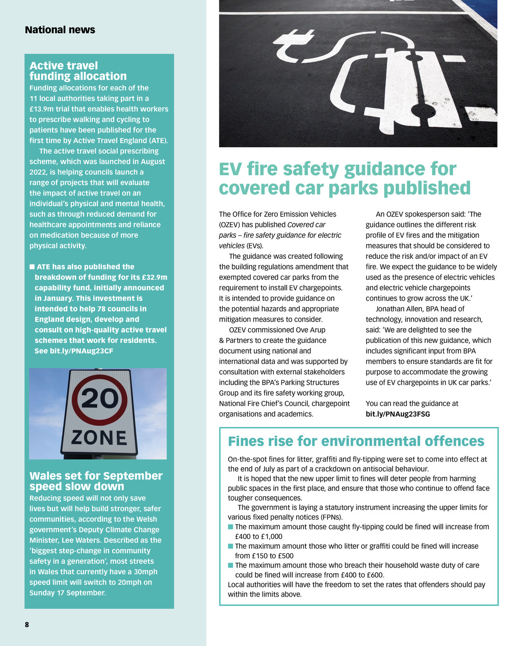 National news Active travel funding allocation Funding allocations for each of the 11 local authorities taking part in a 13.9m trial that enables health workers to prescribe walking and cycling to patients have been published for the first time by Active Travel England (ATE). The active travel social prescribing scheme, which was launched in August 2022, is helping councils launch a range of projects that will evaluate the impact of active travel on an individuals physical and mental health, such as through reduced demand for healthcare appointments and reliance on medication because of more physical activity. ATE has also published the breakdown of funding for its 32.9m capability fund, initially announced in January. This investment is intended to help 78 councils in England design, develop and consult on high-quality active travel schemes that work for residents. See bit.ly/PNAug23CF EV fire safety guidance for covered car parks published The Office for Zero Emission Vehicles (OZEV) has published Covered car parks fire safety guidance for electric vehicles (EVs). The guidance was created following the building regulations amendment that exempted covered car parks from the requirement to install EV chargepoints. It is intended to provide guidance on the potential hazards and appropriate mitigation measures to consider. OZEV commissioned Ove Arup & Partners to create the guidance document using national and international data and was supported by consultation with external stakeholders including the BPAs Parking Structures Group and its fire safety working group, National Fire Chiefs Council, chargepoint organisations and academics. An OZEV spokesperson said: The guidance outlines the different risk profile of EV fires and the mitigation measures that should be considered to reduce the risk and/or impact of an EV fire. We expect the guidance to be widely used as the presence of electric vehicles and electric vehicle chargepoints continues to grow across the UK. Jonathan Allen, BPA head of technology, innovation and research, said: We are delighted to see the publication of this new guidance, which includes significant input from BPA members to ensure standards are fit for purpose to accommodate the growing use of EV chargepoints in UK car parks. You can read the guidance at bit.ly/PNAug23FSG Fines rise for environmental offences Wales set for September speed slow down Reducing speed will not only save lives but will help build stronger, safer communities, according to the Welsh governments Deputy Climate Change Minister, Lee Waters. Described as the biggest step-change in community safety in a generation, most streets in Wales that currently have a 30mph speed limit will switch to 20mph on Sunday 17 September. 8 On-the-spot fines for litter, graffiti and fly-tipping were set to come into effect at the end of July as part of a crackdown on antisocial behaviour. It is hoped that the new upper limit to fines will deter people from harming public spaces in the first place, and ensure that those who continue to offend face tougher consequences. The government is laying a statutory instrument increasing the upper limits for various fixed penalty notices (FPNs). The maximum amount those caught fly-tipping could be fined will increase from 400 to 1,000 The maximum amount those who litter or graffiti could be fined will increase from 150 to 500 The maximum amount those who breach their household waste duty of care could be fined will increase from 400 to 600. Local authorities will have the freedom to set the rates that offenders should pay within the limits above.