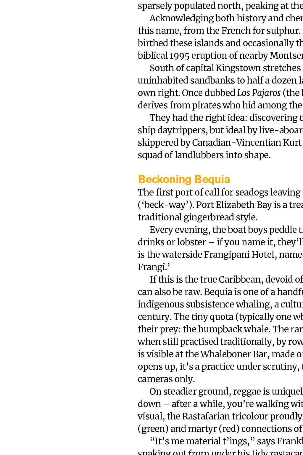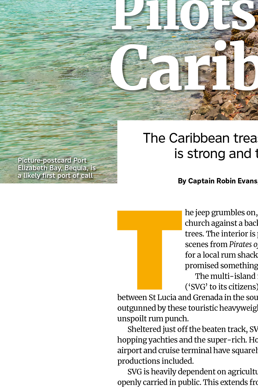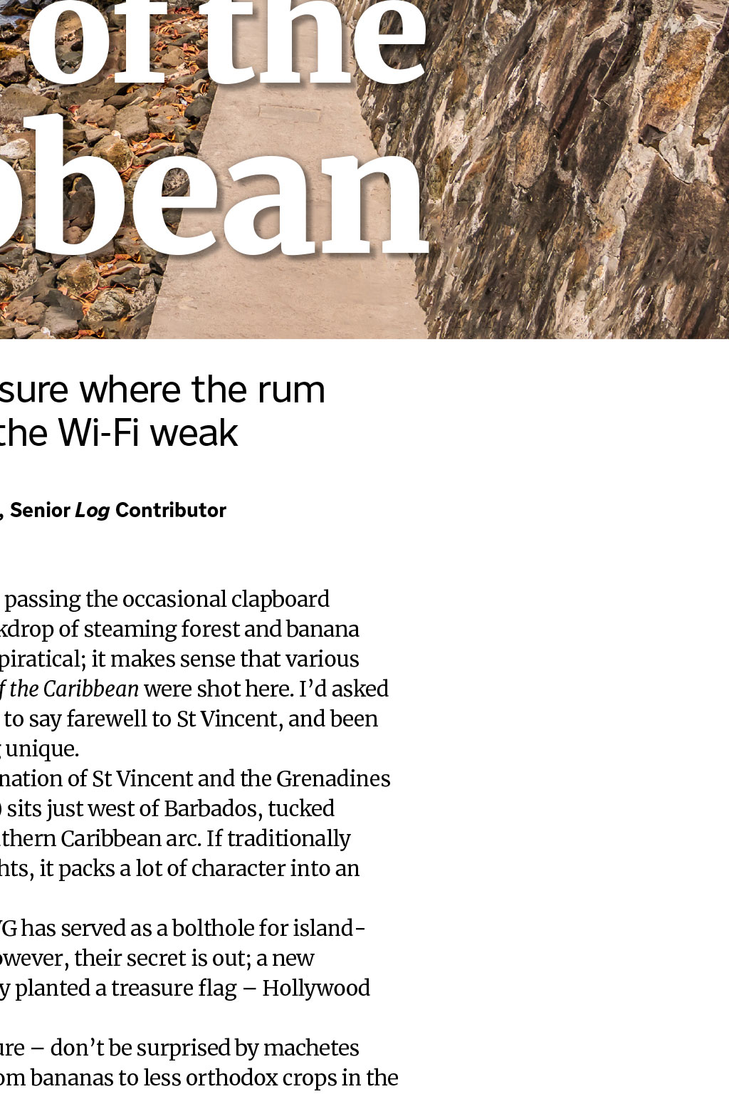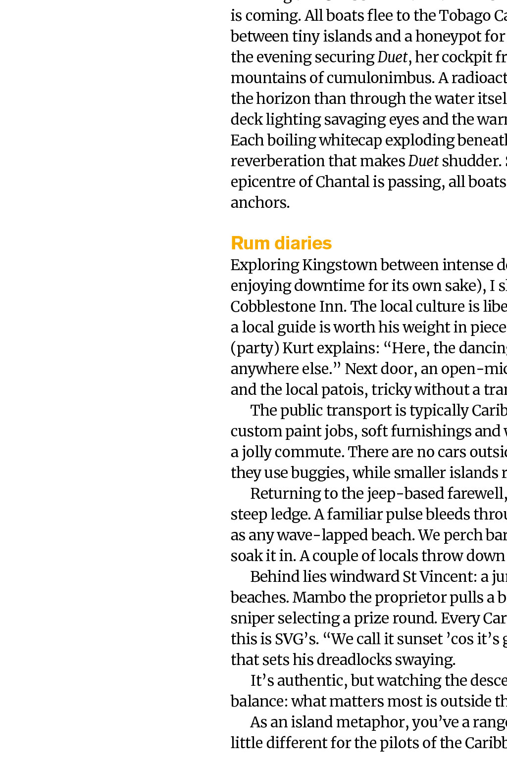 Pilots of the Caribbean Picture-postcard Port Elizabeth Bay, Bequia, is a likely first port of call The Caribbean treasure where the rum is strong and the Wi-Fi weak By Captain Robin Evans, Senior Log Contributor he jeep grumbles on, passing the occasional clapboard church against a backdrop of steaming forest and banana trees. The interior is piratical; it makes sense that various scenes from Pirates of the Caribbean were shot here. I’d asked A boat’s larder is often topped up with local produce sourced from enterprising ‘boat boys’ Aerial view of the Tobago Cays, always a perfect bolthole, but particularly from passing storms TRAVEL for a local rum shack to say farewell to St Vincent, and been promised something unique. The multi-island nation of St Vincent and the Grenadines (‘SVG’ to its citizens) sits just west of Barbados, tucked between St Lucia and Grenada in the southern Caribbean arc. If traditionally outgunned by these touristic heavyweights, it packs a lot of character into an unspoilt rum punch. Sheltered just off the beaten track, SVG has served as a bolthole for island- hopping yachties and the super-rich. However, their secret is out; a new airport and cruise terminal have squarely planted a treasure flag – Hollywood productions included. SVG is heavily dependent on agriculture – don’t be surprised by machetes openly carried in public. This extends from bananas to less orthodox crops in the sparsely populated north, peaking at the active 1,234m volcano Mt Soufrière. Acknowledging both history and chemistry, many Caribbean volcanoes bear this name, from the French for sulphur. All are evidence of the tectonic ring that birthed these islands and occasionally threatens to remove them, such as the biblical 1995 eruption of nearby Montserrat. South of capital Kingstown stretches a chain of more than 30 Grenadines – uninhabited sandbanks to half a dozen large islands, often destinations in their own right. Once dubbed Los Pajaros (the birds) by Spanish sailors, Grenadines derives from pirates who hid among the sheltered coves. They had the right idea: discovering the real SVG is impossible for cruise- ship daytrippers, but ideal by live-aboard catamaran. Mine is called Duet, and is skippered by Canadian-Vincentian Kurt, a marine biologist who easily whips his squad of landlubbers into shape. Beckoning Bequia The first port of call for seadogs leaving capital Kingstown is the island of Bequia (‘beck-way’). Port Elizabeth Bay is a treasure trove, fringed with houses in traditional gingerbread style. Every evening, the boat boys peddle their wares from deck to deck; cold drinks or lobster – if you name it, they’ll find it. If going ashore, a popular stop is the waterside Frangipani Hotel, named after the flower: ‘See you later at the Frangi.’ If this is the true Caribbean, devoid of resorts and high fences, paradise can also be raw. Bequia is one of a handful of spots worldwide that practises indigenous subsistence whaling, a cultural heritage dating back to the 19th century. The tiny quota (typically one whale annually) is in contrast to the size of their prey: the humpback whale. The rarity and hazard of a catch is unsurprising when still practised traditionally, by rowing boat and hand harpoon. Evidence is visible at the Whaleboner Bar, made of giant, bleached jawbones. As SVG opens up, it’s a practice under scrutiny, the rest of the Caribbean shooting with cameras only. On steadier ground, reggae is uniquely infectious, a permanent sign to slow down – after a while, you’re walking with a swagger. From the audio to the visual, the Rastafarian tricolour proudly evokes the financial (yellow), natural (green) and martyr (red) connections of the spiritual Ethiopian homeland. “It’s me material t’ings,” says Franklin, patting the long dreadlocks snaking out from under his tidy rastacap. He tells me how uncut hair and a strict vegetarian code, known as ital (“ital is vital”), derive from biblical interpretation (see Genesis 1:29). Rastafarian spirituality is embodied by the phrase “I and I” (the first for the Almighty, partly residing within the second: yourself) and ensures Franklin has all he needs. He explains how the original Carib Islander term for people (karibna) gives us the name of the region we all love. A few hours’ sail from these simple attitudes lies the most iconic of private islands: Mustique. The eccentric Lord Glenconner masterminded transforming marshy scrubland into luxury villas in the 1950s, creating a private reserve for the glitterati. Princess Margaret accepted the first plot, ‘Les Jolies Eaux’, the first of many exclusive boltholes. Others, owned by Jagger or Hilfiger, are available for rent from US$2,000 to $10,000 per week. Walking across a millionaire’s immaculate lawn to gaze at an infinity pool was a guilty treat – but as the luxury climbed, the character nosedived. To the outsider, million-dollar Balinese villas are amazing to behold, but a clever screen for the wider world. The only place there was any soul was a local shack where island staff reverted to their jolly selves. Basil’s Bar, so often the epicentre of evening entertainment, was populated by privileged American teens of business tycoons, unable to name the island chain they stood upon. To find the real treasures of SVG, we raised anchor and fled. On steadier ground, reggae is uniquely infectious, a permanent sign to slow down – after a while, you’re walking with a swagger Natural heights Nature offers plenty of treats: one day Duet is peppered by the frantic smack of clumsy flying fish. They gasp, flapping gossamer wings until returned to the sea. Returning from ashore one evening, the dinghy propeller leaves a glowing bioluminescent wake in the inky water. Several shipmates dive in, adding their own. Evenings were often spent awaiting the elusive green flash as the last rays refract over the horizon, referenced in Pirate