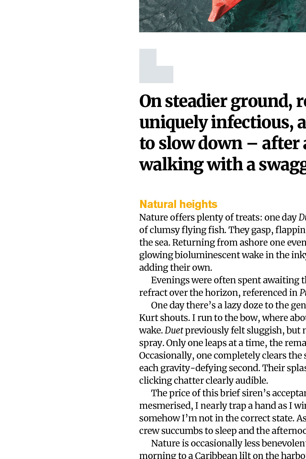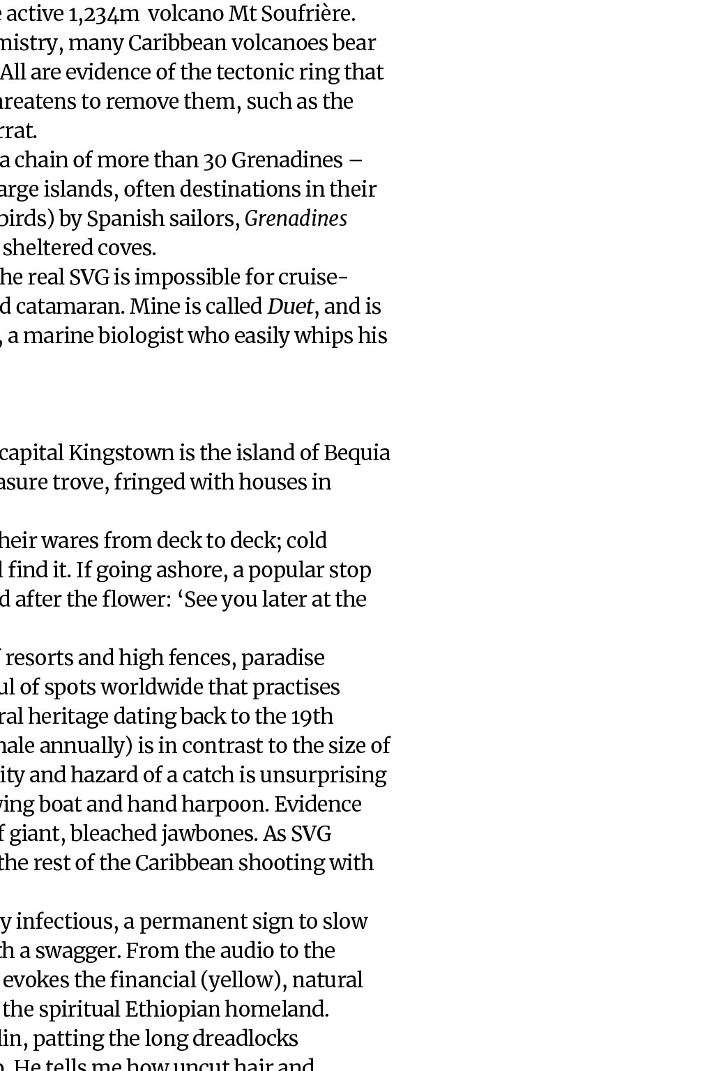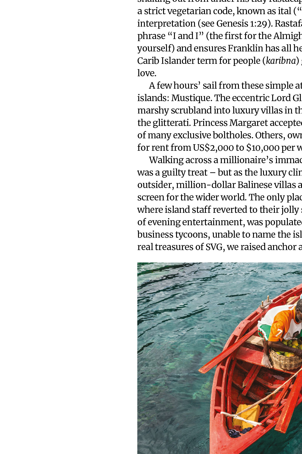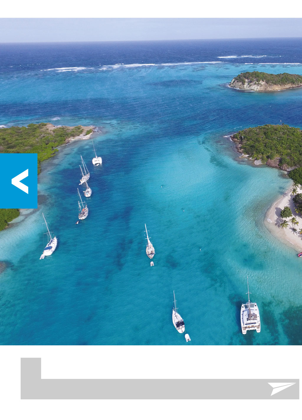 Pilots of the Caribbean Picture-postcard Port Elizabeth Bay, Bequia, is a likely first port of call The Caribbean treasure where the rum is strong and the Wi-Fi weak By Captain Robin Evans, Senior Log Contributor he jeep grumbles on, passing the occasional clapboard church against a backdrop of steaming forest and banana trees. The interior is piratical; it makes sense that various scenes from Pirates of the Caribbean were shot here. I’d asked A boat’s larder is often topped up with local produce sourced from enterprising ‘boat boys’ Aerial view of the Tobago Cays, always a perfect bolthole, but particularly from passing storms TRAVEL for a local rum shack to say farewell to St Vincent, and been promised something unique. The multi-island nation of St Vincent and the Grenadines (‘SVG’ to its citizens) sits just west of Barbados, tucked between St Lucia and Grenada in the southern Caribbean arc. If traditionally outgunned by these touristic heavyweights, it packs a lot of character into an unspoilt rum punch. Sheltered just off the beaten track, SVG has served as a bolthole for island- hopping yachties and the super-rich. However, their secret is out; a new airport and cruise terminal have squarely planted a treasure flag – Hollywood productions included. SVG is heavily dependent on agriculture – don’t be surprised by machetes openly carried in public. This extends from bananas to less orthodox crops in the sparsely populated north, peaking at the active 1,234m volcano Mt Soufrière. Acknowledging both history and chemistry, many Caribbean volcanoes bear this name, from the French for sulphur. All are evidence of the tectonic ring that birthed these islands and occasionally threatens to remove them, such as the biblical 1995 eruption of nearby Montserrat. South of capital Kingstown stretches a chain of more than 30 Grenadines – uninhabited sandbanks to half a dozen large islands, often destinations in their own right. Once dubbed Los Pajaros (the birds) by Spanish sailors, Grenadines derives from pirates who hid among the sheltered coves. They had the right idea: discovering the real SVG is impossible for cruise- ship daytrippers, but ideal by live-aboard catamaran. Mine is called Duet, and is skippered by Canadian-Vincentian Kurt, a marine biologist who easily whips his squad of landlubbers into shape. Beckoning Bequia The first port of call for seadogs leaving capital Kingstown is the island of Bequia (‘beck-way’). Port Elizabeth Bay is a treasure trove, fringed with houses in traditional gingerbread style. Every evening, the boat boys peddle their wares from deck to deck; cold drinks or lobster – if you name it, they’ll find it. If going ashore, a popular stop is the waterside Frangipani Hotel, named after the flower: ‘See you later at the Frangi.’ If this is the true Caribbean, devoid of resorts and high fences, paradise can also be raw. Bequia is one of a handful of spots worldwide that practises indigenous subsistence whaling, a cultural heritage dating back to the 19th century. The tiny quota (typically one whale annually) is in contrast to the size of their prey: the humpback whale. The rarity and hazard of a catch is unsurprising when still practised traditionally, by rowing boat and hand harpoon. Evidence is visible at the Whaleboner Bar, made of giant, bleached jawbones. As SVG opens up, it’s a practice under scrutiny, the rest of the Caribbean shooting with cameras only. On steadier ground, reggae is uniquely infectious, a permanent sign to slow down – after a while, you’re walking with a swagger. From the audio to the visual, the Rastafarian tricolour proudly evokes the financial (yellow), natural (green) and martyr (red) connections of the spiritual Ethiopian homeland. “It’s me material t’ings,” says Franklin, patting the long dreadlocks snaking out from under his tidy rastacap. He tells me how uncut hair and a strict vegetarian code, known as ital (“ital is vital”), derive from biblical interpretation (see Genesis 1:29). Rastafarian spirituality is embodied by the phrase “I and I” (the first for the Almighty, partly residing within the second: yourself) and ensures Franklin has all he needs. He explains how the original Carib Islander term for people (karibna) gives us the name of the region we all love. A few hours’ sail from these simple attitudes lies the most iconic of private islands: Mustique. The eccentric Lord Glenconner masterminded transforming marshy scrubland into luxury villas in the 1950s, creating a private reserve for the glitterati. Princess Margaret accepted the first plot, ‘Les Jolies Eaux’, the first of many exclusive boltholes. Others, owned by Jagger or Hilfiger, are available for rent from US$2,000 to $10,000 per week. Walking across a millionaire’s immaculate lawn to gaze at an infinity pool was a guilty treat – but as the luxury climbed, the character nosedived. To the outsider, million-dollar Balinese villas are amazing to behold, but a clever screen for the wider world. The only place there was any soul was a local shack where island staff reverted to their jolly selves. Basil’s Bar, so often the epicentre of evening entertainment, was populated by privileged American teens of business tycoons, unable to name the island chain they stood upon. To find the real treasures of SVG, we raised anchor and fled. On steadier ground, reggae is uniquely infectious, a permanent sign to slow down – after a while, you’re walking with a swagger Natural heights Nature offers plenty of treats: one day Duet is peppered by the frantic smack of clumsy flying fish. They gasp, flapping gossamer wings until returned to the sea. Returning from ashore one evening, the dinghy propeller leaves a glowing bioluminescent wake in the inky water. Several shipmates dive in, adding their own. Evenings were often spent awaiting the elusive green flash as the last rays refract over the horizon, referenced in Pirate