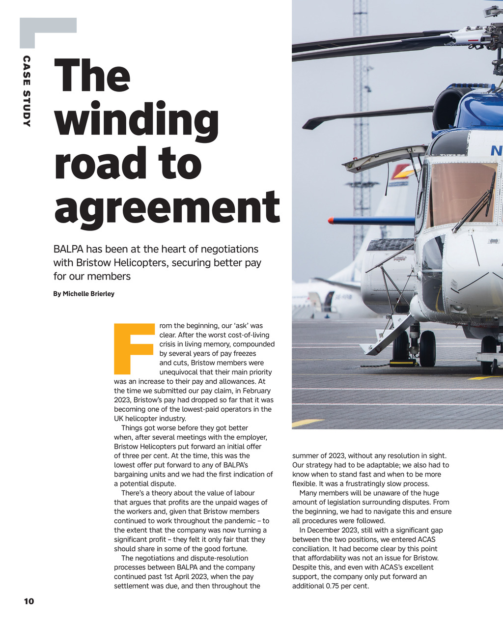 CA S E S T U DY The winding road to agreement BALPA has been at the heart of negotiations with Bristow Helicopters, securing better pay for our members By Michelle Brierley F rom the beginning, our ask was clear. After the worst cost-of-living crisis in living memory, compounded by several years of pay freezes and cuts, Bristow members were unequivocal that their main priority was an increase to their pay and allowances. At the time we submitted our pay claim, in February 2023, Bristows pay had dropped so far that it was becoming one of the lowest-paid operators in the UK helicopter industry. Things got worse before they got better when, after several meetings with the employer, Bristow Helicopters put forward an initial offer of three per cent. At the time, this was the lowest offer put forward to any of BALPAs bargaining units and we had the first indication of a potential dispute. Theres a theory about the value of labour that argues that profits are the unpaid wages of the workers and, given that Bristow members continued to work throughout the pandemic to the extent that the company was now turning a significant profit they felt it only fair that they should share in some of the good fortune. The negotiations and dispute-resolution processes between BALPA and the company continued past 1st April 2023, when the pay settlement was due, and then throughout the summer of 2023, without any resolution in sight. Our strategy had to be adaptable; we also had to know when to stand fast and when to be more flexible. It was a frustratingly slow process. Many members will be unaware of the huge amount of legislation surrounding disputes. From the beginning, we had to navigate this and ensure all procedures were followed. In December 2023, still with a significant gap between the two positions, we entered ACAS conciliation. It had become clear by this point that affordability was not an issue for Bristow. Despite this, and even with ACASs excellent support, the company only put forward an additional 0.75 per cent. 10 THE LOG Autumn 24 pp10-13 News Extra Bristow.indd 10 13/11/2024 14:17