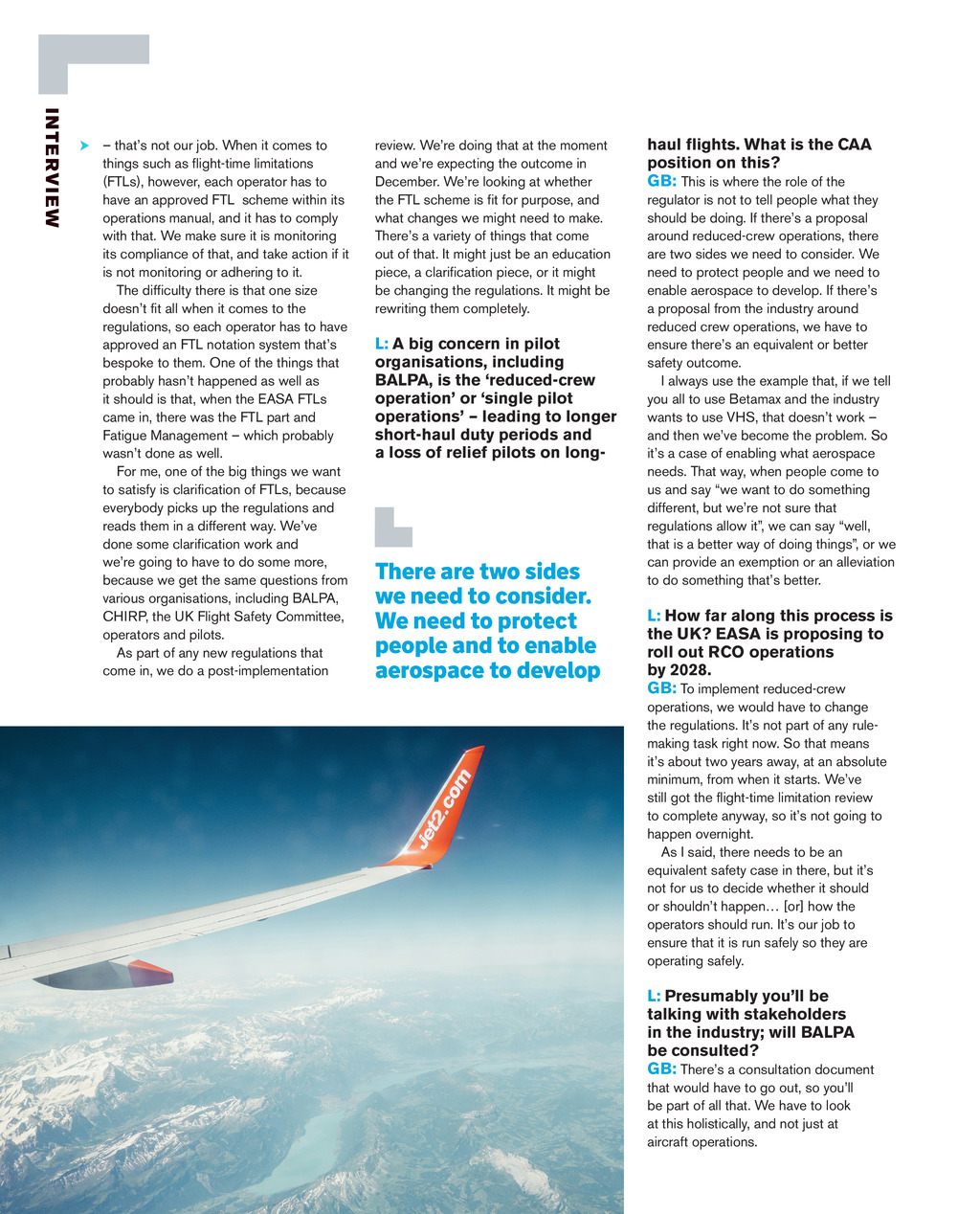 I N T E RV I E W thats not our job. When it comes to things such as flight-time limitations (FTLs), however, each operator has to have an approved FTL scheme within its operations manual, and it has to comply with that. We make sure it is monitoring its compliance of that, and take action if it is not monitoring or adhering to it. The difficulty there is that one size doesnt fit all when it comes to the regulations, so each operator has to have approved an FTL notation system thats bespoke to them. One of the things that probably hasnt happened as well as it should is that, when the EASA FTLs came in, there was the FTL part and Fatigue Management which probably wasnt done as well. For me, one of the big things we want to satisfy is clarification of FTLs, because everybody picks up the regulations and reads them in a different way. Weve done some clarification work and were going to have to do some more, because we get the same questions from various organisations, including BALPA, CHIRP, the UK Flight Safety Committee, operators and pilots. As part of any new regulations that come in, we do a post-implementation review. Were doing that at the moment and were expecting the outcome in December. Were looking at whether the FTL scheme is fit for purpose, and what changes we might need to make. Theres a variety of things that come out of that. It might just be an education piece, a clarification piece, or it might be changing the regulations. It might be rewriting them completely. L: A big concern in pilot organisations, including BALPA, is the reduced-crew operation or single pilot operations leading to longer short-haul duty periods and a loss of relief pilots on long- There are two sides we need to consider. We need to protect people and to enable aerospace to develop haul flights. What is the CAA position on this? GB: This is where the role of the regulator is not to tell people what they should be doing. If theres a proposal around reduced-crew operations, there are two sides we need to consider. We need to protect people and we need to enable aerospace to develop. If theres a proposal from the industry around reduced crew operations, we have to ensure theres an equivalent or better safety outcome. I always use the example that, if we tell you all to use Betamax and the industry wants to use VHS, that doesnt work and then weve become the problem. So its a case of enabling what aerospace needs. That way, when people come to us and say we want to do something different, but were not sure that regulations allow it, we can say well, that is a better way of doing things, or we can provide an exemption or an alleviation to do something thats better. L: How far along this process is the UK? EASA is proposing to roll out RCO operations by 2028. GB: To implement reduced-crew operations, we would have to change the regulations. Its not part of any rulemaking task right now. So that means its about two years away, at an absolute minimum, from when it starts. Weve still got the flight-time limitation review to complete anyway, so its not going to happen overnight. As I said, there needs to be an equivalent safety case in there, but its not for us to decide whether it should or shouldnt happen [or] how the operators should run. Its our job to ensure that it is run safely so they are operating safely. L: Presumably youll be talking with stakeholders in the industry; will BALPA be consulted? GB: Theres a consultation document that would have to go out, so youll be part of all that. We have to look at this holistically, and not just at aircraft operations. 30 THE LOG Autumn 24 pp14-23 CAA.indd 18 13/11/2024 14:38
