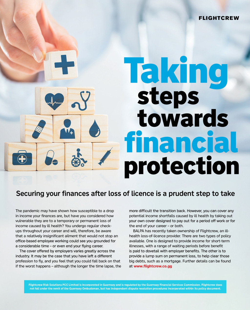 FLI G HTCR EW TECH LOG Taking steps towards financial protection The pandemic may have shown how susceptible to a drop in income your finances are, but have you considered how vulnerable they are to a temporary or permanent loss of income caused by ill health? You undergo regular checkups throughout your career and will, therefore, be aware that a relatively insignificant ailment that would not stop an profession to fly, and you feel that you could fall back on that if the worst happens although the longer the time lapse, the potential income shortfalls caused by ill health by taking out the end of your career or both. BALPA has recently taken ownership of Flightcrew, an illhealth loss-of-licence provider. There are two types of policy available. One is designed to provide income for short-term illnesses, with a range of waiting periods before benefit big debts, such as a mortgage. Further details can be found www.flightcrew.co.gg Flightcrew Risk Solutions PCC Limited is incorporated in Guernsey and is regulated by the Guernsey Financial Services Commission. Flightcrew does not fall under the remit of the Guernsey Ombudsman, but has independent dispute resolution procedures incorporated within its policy document. 2 THE LOG Autumn 24 pp02-03 Editorial.indd 2 13/11/2024 14:13
