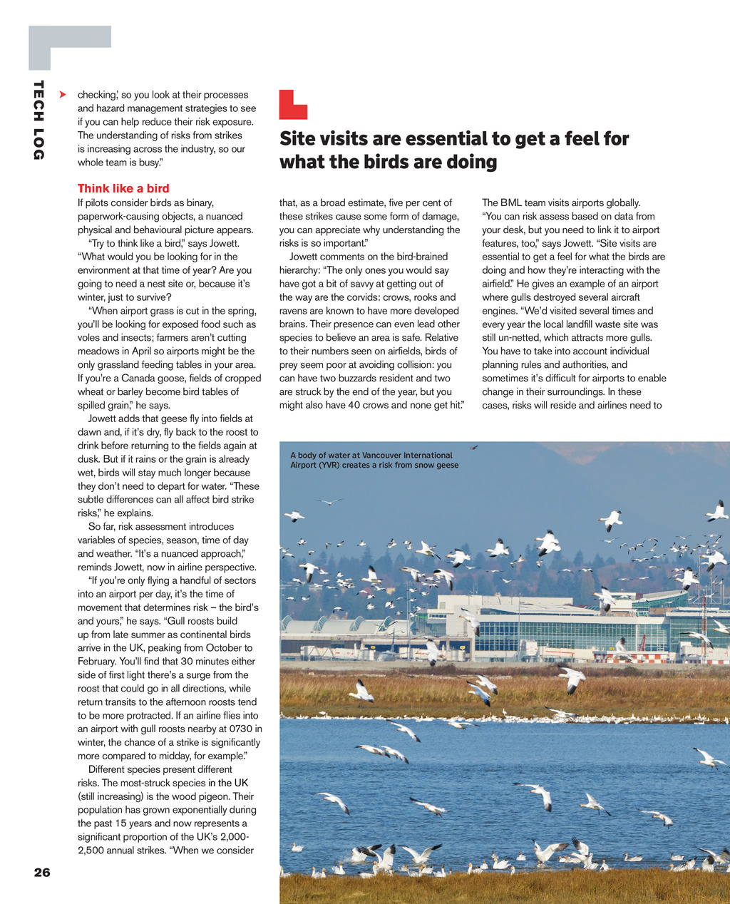 TECH LOG checking, so you look at their processes and hazard management strategies to see if you can help reduce their risk exposure. The understanding of risks from strikes is increasing across the industry, so our whole team is busy. Site visits are essential to get a feel for what the birds are doing Think like a bird If pilots consider birds as binary, paperwork-causing objects, a nuanced physical and behavioural picture appears. Try to think like a bird, says Jowett. What would you be looking for in the environment at that time of year? Are you going to need a nest site or, because its winter, just to survive? When airport grass is cut in the spring, youll be looking for exposed food such as voles and insects; farmers arent cutting meadows in April so airports might be the only grassland feeding tables in your area. If youre a Canada goose, fields of cropped wheat or barley become bird tables of spilled grain, he says. Jowett adds that geese fly into fields at dawn and, if its dry, fly back to the roost to drink before returning to the fields again at dusk. But if it rains or the grain is already wet, birds will stay much longer because they dont need to depart for water. These subtle differences can all affect bird strike risks, he explains. So far, risk assessment introduces variables of species, season, time of day and weather. Its a nuanced approach, reminds Jowett, now in airline perspective. If youre only flying a handful of sectors into an airport per day, its the time of movement that determines risk the birds and yours, he says. Gull roosts build up from late summer as continental birds arrive in the UK, peaking from October to February. Youll find that 30 minutes either side of first light theres a surge from the roost that could go in all directions, while return transits to the afternoon roosts tend to be more protracted. If an airline flies into an airport with gull roosts nearby at 0730 in winter, the chance of a strike is significantly more compared to midday, for example. Different species present different risks. The most-struck species in the UK (still increasing) is the wood pigeon. Their population has grown exponentially during the past 15 years and now represents a significant proportion of the UKs 2,0002,500 annual strikes. When we consider that, as a broad estimate, five per cent of these strikes cause some form of damage, you can appreciate why understanding the risks is so important. Jowett comments on the bird-brained hierarchy: The only ones you would say have got a bit of savvy at getting out of the way are the corvids: crows, rooks and ravens are known to have more developed brains. Their presence can even lead other species to believe an area is safe. Relative to their numbers seen on airfields, birds of prey seem poor at avoiding collision: you can have two buzzards resident and two are struck by the end of the year, but you might also have 40 crows and none get hit. The BML team visits airports globally. You can risk assess based on data from your desk, but you need to link it to airport features, too, says Jowett. Site visits are essential to get a feel for what the birds are doing and how theyre interacting with the airfield. He gives an example of an airport where gulls destroyed several aircraft engines. Wed visited several times and every year the local landfill waste site was still un-netted, which attracts more gulls. You have to take into account individual planning rules and authorities, and sometimes its difficult for airports to enable change in their surroundings. In these cases, risks will reside and airlines need to A body of water at Vancouver International Airport (YVR) creates a risk from snow geese 26 THE LOG Autumn 24 pp25-29 Birdstrikes.indd 26 13/11/2024 14:22