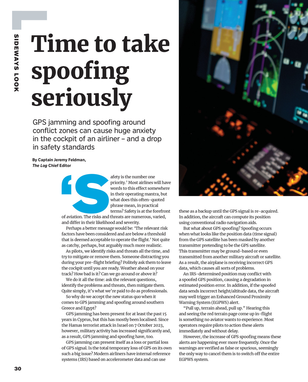 S I D E WAYS L O O K Time to take spoofing seriously GPS jamming and spoofing around conflict zones can cause huge anxiety in the cockpit of an airliner and a drop in safety standards By Captain Jeremy Feldman, The Log Chief Editor S afety is the number one priority. Most airlines will have words to this effect somewhere in their operating mantra, but what does this often-quoted phrase mean, in practical terms? Safety is at the forefront of aviation. The risks and threats are numerous, varied, and differ in their likelihood and severity. Perhaps a better message would be: The relevant risk factors have been considered and are below a threshold that is deemed acceptable to operate the flight. Not quite as catchy, perhaps, but arguably much more realistic. As pilots, we identify risks and threats all the time, and try to mitigate or remove them. Someone distracting you during your pre-flight briefing? Politely ask them to leave the cockpit until you are ready. Weather ahead on your track? How bad is it? Can we go around or above it? We do it all the time: ask the relevant questions, identify the problems and threats, then mitigate them. Quite simply, its what were paid to do as professionals. So why do we accept the new status quo when it comes to GPS jamming and spoofing around southern Greece and Egypt? GPS jamming has been present for at least the past 15 years in Cyprus, but this has mostly been localised. Since the Hamas terrorist attack in Israel on 7 October 2023, however, military activity has increased significantly and, as a result, GPS jamming and spoofing have, too. GPS jamming can present itself as a loss or partial loss of GPS signal. Is the total temporary loss of GPS on its own such a big issue? Modern airliners have internal reference systems (IRS) based on accelerometer data and can use these as a backup until the GPS signal is re-acquired. In addition, the aircraft can compute its position using conventional radio navigation aids. But what about GPS spoofing? Spoofing occurs when what looks like the position data (time signal) from the GPS satellite has been masked by another transmitter pretending to be the GPS satellite. This transmitter may be ground-based or even transmitted from another military aircraft or satellite. As a result, the airplane is receiving incorrect GPS data, which causes all sorts of problems. An IRS-determined position may conflict with a spoofed GPS position, causing a degradation in estimated position error. In addition, if the spoofed data sends incorrect height/altitude data, the aircraft may well trigger an Enhanced Ground Proximity Warning System (EGPWS) alert. Pull up, terrain ahead, pull up. Hearing this and seeing the red terrain page come up in-flight is something no aviator wants to experience. Most operators require pilots to action these alerts immediately and without delay. However, the increase of GPS spoofing means these alerts are happening ever more frequently. Once the warnings are verified as false or spurious, seemingly the only way to cancel them is to switch off the entire EGPWS system. 30 THE LOG Autumn 24 pp30-31 GPS Jamming.indd 30 13/11/2024 14:23
