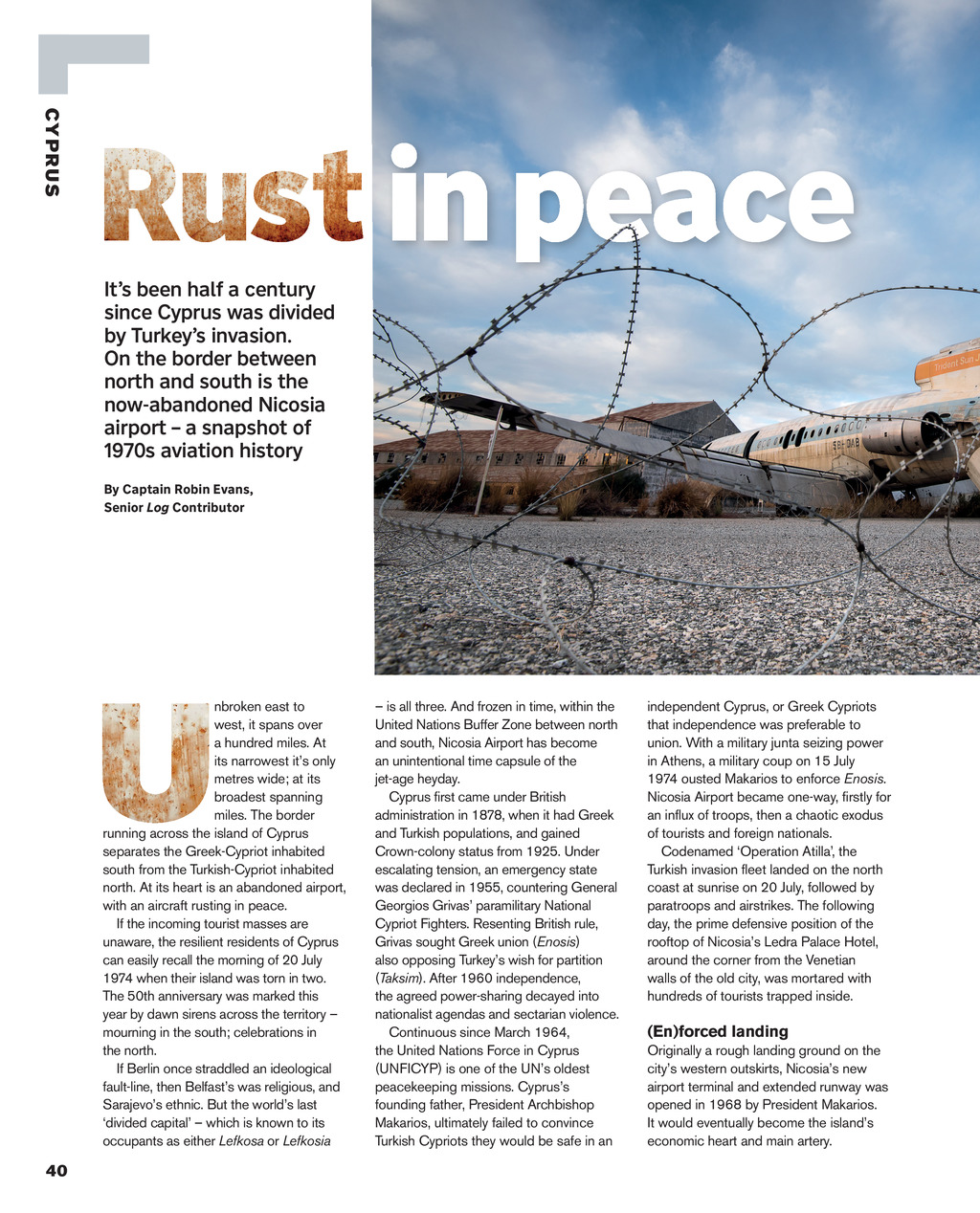 CY P R US Its been half a century since Cyprus was divided by Turkeys invasion. On the border between north and south is the now-abandoned Nicosia airport a snapshot of 1970s aviation history By Captain Robin Evans, Senior Log Contributor U nbroken east to west, it spans over a hundred miles. At its narrowest its only metres wide; at its broadest spanning miles. The border running across the island of Cyprus separates the Greek-Cypriot inhabited south from the Turkish-Cypriot inhabited north. At its heart is an abandoned airport, with an aircraft rusting in peace. If the incoming tourist masses are unaware, the resilient residents of Cyprus can easily recall the morning of 20 July 1974 when their island was torn in two. The 50th anniversary was marked this year by dawn sirens across the territory mourning in the south; celebrations in the north. If Berlin once straddled an ideological fault-line, then Belfasts was religious, and Sarajevos ethnic. But the worlds last divided capital which is known to its occupants as either Lefkosa or Lefkosia is all three. And frozen in time, within the United Nations Buffer Zone between north and south, Nicosia Airport has become an unintentional time capsule of the jet-age heyday. Cyprus first came under British administration in 1878, when it had Greek and Turkish populations, and gained Crown-colony status from 1925. Under escalating tension, an emergency state was declared in 1955, countering General Georgios Grivas paramilitary National Cypriot Fighters. Resenting British rule, Grivas sought Greek union (Enosis) also opposing Turkeys wish for partition (Taksim). After 1960 independence, the agreed power-sharing decayed into nationalist agendas and sectarian violence. Continuous since March 1964, the United Nations Force in Cyprus (UNFICYP) is one of the UNs oldest peacekeeping missions. Cypruss founding father, President Archbishop Makarios, ultimately failed to convince Turkish Cypriots they would be safe in an independent Cyprus, or Greek Cypriots that independence was preferable to union. With a military junta seizing power in Athens, a military coup on 15 July 1974 ousted Makarios to enforce Enosis. Nicosia Airport became one-way, firstly for an influx of troops, then a chaotic exodus of tourists and foreign nationals. Codenamed Operation Atilla, the Turkish invasion fleet landed on the north coast at sunrise on 20 July, followed by paratroops and airstrikes. The following day, the prime defensive position of the rooftop of Nicosias Ledra Palace Hotel, around the corner from the Venetian walls of the old city, was mortared with hundreds of tourists trapped inside. (En)forced landing Originally a rough landing ground on the citys western outskirts, Nicosias new airport terminal and extended runway was opened in 1968 by President Makarios. It would eventually become the islands economic heart and main artery. 40 THE LOG Autumn 24 pp40-43 Nicosia.indd 40 13/11/2024 14:39