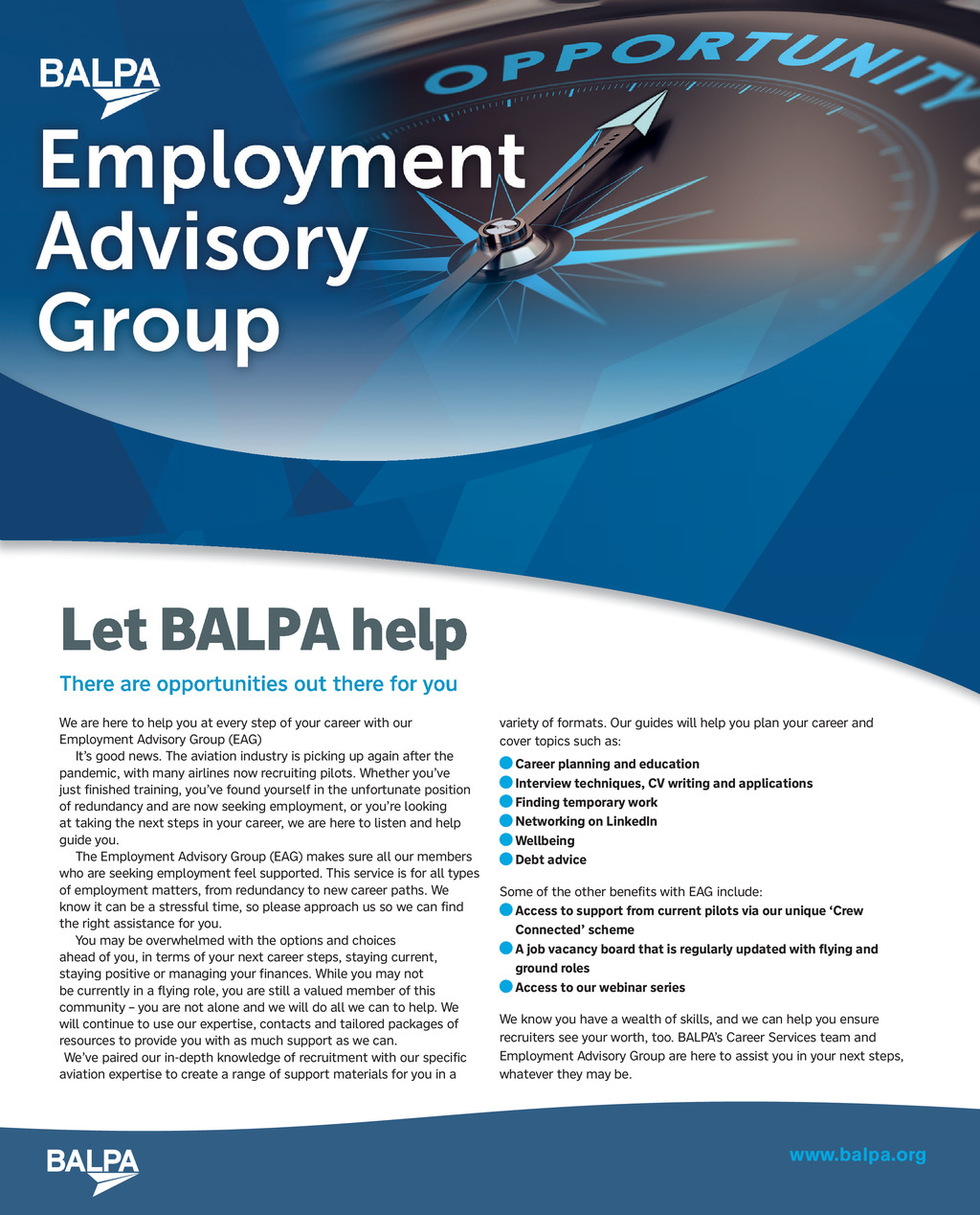 Let BALPA help There are opportunities out there for you We are here to help you at every step of your career with our Employment Advisory Group (EAG) Its good news. The aviation industry is picking up again after the pandemic, with many airlines now recruiting pilots. Whether youve just finished training, youve found yourself in the unfortunate position of redundancy and are now seeking employment, or youre looking at taking the next steps in your career, we are here to listen and help guide you. The Employment Advisory Group (EAG) makes sure all our members who are seeking employment feel supported. This service is for all types of employment matters, from redundancy to new career paths. We know it can be a stressful time, so please approach us so we can find the right assistance for you. You may be overwhelmed with the options and choices ahead of you, in terms of your next career steps, staying current, staying positive or managing your finances. While you may not be currently in a flying role, you are still a valued member of this community you are not alone and we will do all we can to help. We will continue to use our expertise, contacts and tailored packages of resources to provide you with as much support as we can. Weve paired our in-depth knowledge of recruitment with our specific aviation expertise to create a range of support materials for you in a variety of formats. Our guides will help you plan your career and cover topics such as: Career planning and education Interview techniques, CV writing and applications Finding temporary work Networking on LinkedIn Wellbeing Debt advice Some of the other benefits with EAG include: Access to support from current pilots via our unique Crew Connected scheme A job vacancy board that is regularly updated with flying and ground roles Access to our webinar series We know you have a wealth of skills, and we can help you ensure recruiters see your worth, too. BALPAs Career Services team and Employment Advisory Group are here to assist you in your next steps, whatever they may be. www.balpa.org THE LOG Autumn 24 pp56-57 Obit_V2 copy.indd 56 13/11/2024 15:02