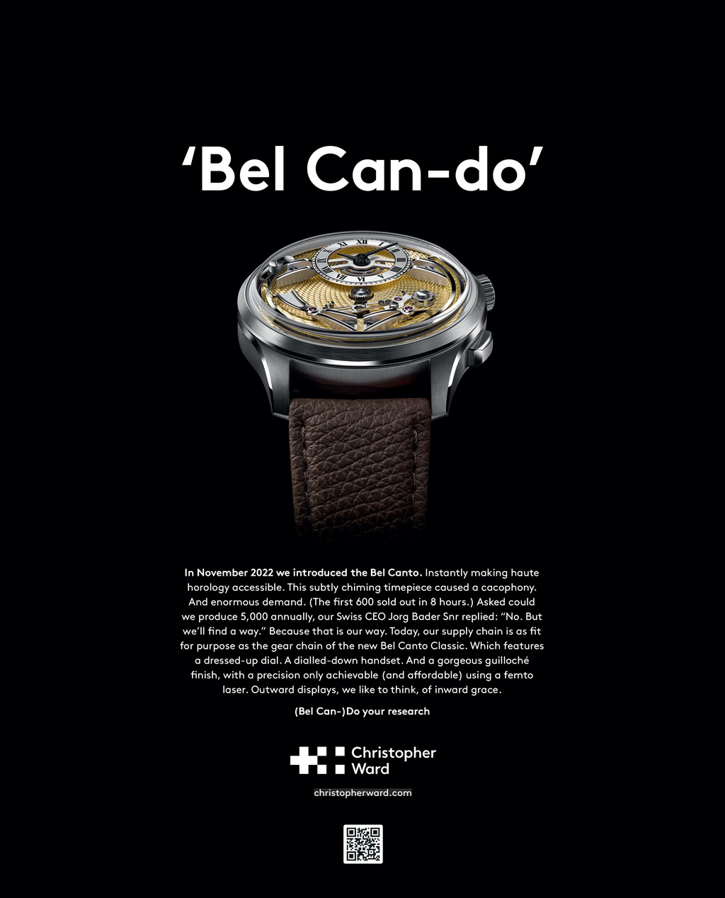 In November 2022 we introduced the Bel Canto. Instantly making haute horology accessible. This subtly chiming timepiece caused a cacophony. And enormous demand. (The first 600 sold out in 8 hours.) Asked could we produce 5,000 annually, our Swiss CEO Jorg Bader Snr replied: No. But well find a way. Because that is our way. Today, our supply chain is as fit for purpose as the gear chain of the new Bel Canto Classic. Which features a dressed-up dial. A dialled-down handset. And a gorgeous guilloch finish, with a precision only achievable (and affordable) using a femto laser. Outward displays, we like to think, of inward grace. (Bel Can-)Do your research christopherward.com THE LOG Autumn 24 pp06-07 News.indd 6 13/11/2024 14:15