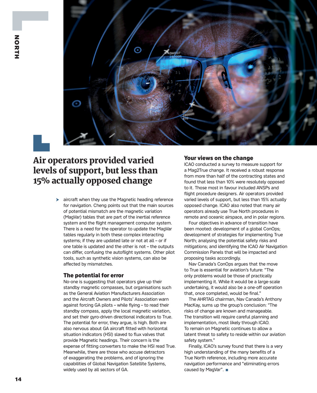 NORTH Air operators provided varied levels of support, but less than 15% actually opposed change aircraft when they use the Magnetic heading reference for navigation. Cheng points out that the main sources of potential mismatch are the magnetic variation (MagVar) tables that are part of the inertial reference system and the flight management computer system. There is a need for the operator to update the MagVar tables regularly in both these complex interacting systems; if they are updated late or not at all or if one table is updated and the other is not the outputs can differ, confusing the autoflight systems. Other pilot tools, such as synthetic vision systems, can also be affected by mismatches. The potential for error No-one is suggesting that operators give up their standby magnetic compasses, but organisations such as the General Aviation Manufacturers Association and the Aircraft Owners and Pilots Association warn against forcing GA pilots while flying to read their standby compass, apply the local magnetic variation, and set their gyro-driven directional indicators to True. The potential for error, they argue, is high. Both are also nervous about GA aircraft fitted with horizontal situation indicators (HSI) slaved to flux valves that provide Magnetic headings. Their concern is the expense of fitting converters to make the HSI read True. Meanwhile, there are those who accuse detractors of exaggerating the problems, and of ignoring the capabilities of Global Navigation Satellite Systems, widely used by all sectors of GA. Your views on the change ICAO conducted a survey to measure support for a Mag2True change. It received a robust response from more than half of the contracting states and found that less than 10% were resolutely opposed to it. Those most in favour included ANSPs and flight procedure designers. Air operators provided varied levels of support, but less than 15% actually opposed change. ICAO also noted that many air operators already use True North procedures in remote and oceanic airspace, and in polar regions. Four objectives in advance of transition have been mooted: development of a global ConOps; development of strategies for implementing True North; analysing the potential safety risks and mitigations; and identifying the ICAO Air Navigation Commission Panels that will be impacted and proposing tasks accordingly. Nav Canadas ConOps argues that the move to True is essential for aviations future: The only problems would be those of practically implementing it. While it would be a large-scale undertaking, it would also be a one-off operation that, once completed, would be final. The AHRTAG chairman, Nav Canadas Anthony MacKay, sums up the groups conclusion: The risks of change are known and manageable. The transition will require careful planning and implementation, most likely through ICAO. To remain on Magnetic continues to allow a latent threat to safety to reside within our aviation safety system. Finally, ICAOs survey found that there is a very high understanding of the many benefits of a True North reference, including more accurate navigation performance and eliminating errors caused by MagVar. 14 THE LOG Spr 24 pp12-14 True North.indd 14 16/02/2024 11:30