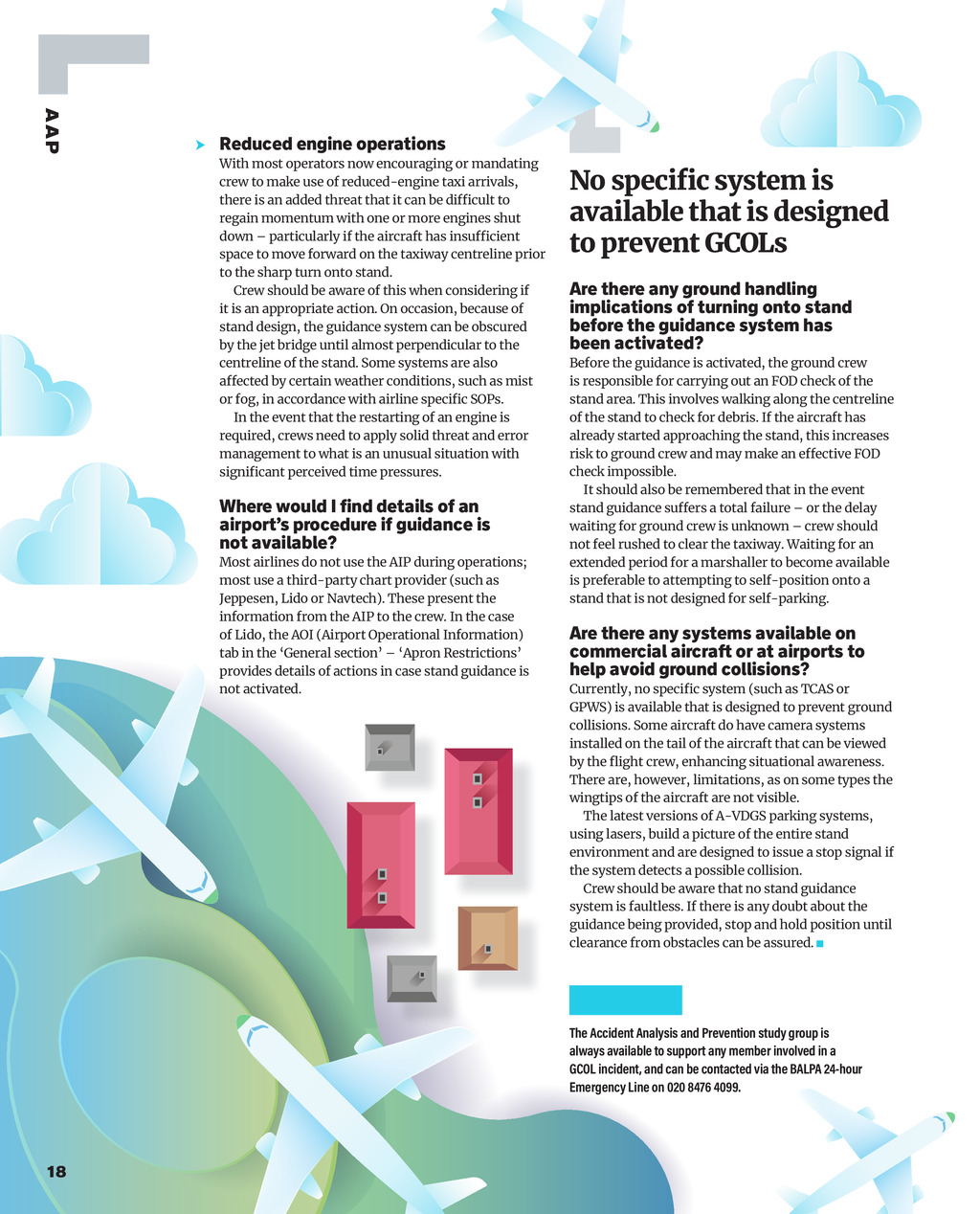 AAP Reduced engine operations With most operators now encouraging or mandating crew to make use of reduced-engine taxi arrivals, there is an added threat that it can be difficult to regain momentum with one or more engines shut down particularly if the aircraft has insufficient space to move forward on the taxiway centreline prior to the sharp turn onto stand. Crew should be aware of this when considering if it is an appropriate action. On occasion, because of stand design, the guidance system can be obscured by the jet bridge until almost perpendicular to the centreline of the stand. Some systems are also affected by certain weather conditions, such as mist or fog, in accordance with airline specific SOPs. In the event that the restarting of an engine is required, crews need to apply solid threat and error management to what is an unusual situation with significant perceived time pressures. Where would I find details of an airports procedure if guidance is not available? Most airlines do not use the AIP during operations; most use a third-party chart provider (such as Jeppesen, Lido or Navtech). These present the information from the AIP to the crew. In the case of Lido, the AOI (Airport Operational Information) tab in the General section Apron Restrictions provides details of actions in case stand guidance is not activated. No specific system is available that is designed to prevent GCOLs Are there any ground handling implications of turning onto stand before the guidance system has been activated? Before the guidance is activated, the ground crew is responsible for carrying out an FOD check of the stand area. This involves walking along the centreline of the stand to check for debris. If the aircraft has already started approaching the stand, this increases risk to ground crew and may make an effective FOD check impossible. It should also be remembered that in the event stand guidance suffers a total failure or the delay waiting for ground crew is unknown crew should not feel rushed to clear the taxiway. Waiting for an extended period for a marshaller to become available is preferable to attempting to self-position onto a stand that is not designed for self-parking. Are there any systems available on commercial aircraft or at airports to help avoid ground collisions? Currently, no specific system (such as TCAS or GPWS) is available that is designed to prevent ground collisions. Some aircraft do have camera systems installed on the tail of the aircraft that can be viewed by the flight crew, enhancing situational awareness. There are, however, limitations, as on some types the wingtips of the aircraft are not visible. The latest versions of A-VDGS parking systems, using lasers, build a picture of the entire stand environment and are designed to issue a stop signal if the system detects a possible collision. Crew should be aware that no stand guidance system is faultless. If there is any doubt about the guidance being provided, stop and hold position until clearance from obstacles can be assured. The Accident Analysis and Prevention study group is always available to support any member involved in a GCOL incident, and can be contacted via the BALPA 24-hour Emergency Line on 020 8476 4099. 18 THE LOG Spr 24 pp16-18 AAP Ground Ops.indd 18 16/02/2024 11:31