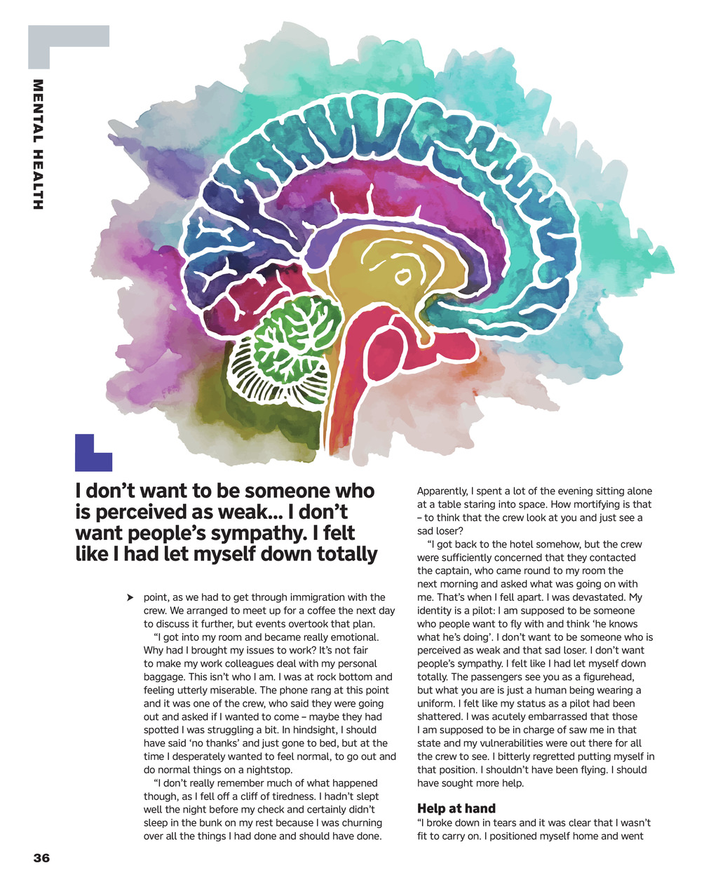 M E N TA L H E A LT H I dont want to be someone who is perceived as weak I dont want peoples sympathy. I felt like I had let myself down totally point, as we had to get through immigration with the crew. We arranged to meet up for a coffee the next day to discuss it further, but events overtook that plan. I got into my room and became really emotional. Why had I brought my issues to work? Its not fair to make my work colleagues deal with my personal baggage. This isnt who I am. I was at rock bottom and feeling utterly miserable. The phone rang at this point and it was one of the crew, who said they were going out and asked if I wanted to come maybe they had spotted I was struggling a bit. In hindsight, I should have said no thanks and just gone to bed, but at the time I desperately wanted to feel normal, to go out and do normal things on a nightstop. I dont really remember much of what happened though, as I fell off a cliff of tiredness. I hadnt slept well the night before my check and certainly didnt sleep in the bunk on my rest because I was churning over all the things I had done and should have done. Apparently, I spent a lot of the evening sitting alone at a table staring into space. How mortifying is that to think that the crew look at you and just see a sad loser? I got back to the hotel somehow, but the crew were sufficiently concerned that they contacted the captain, who came round to my room the next morning and asked what was going on with me. Thats when I fell apart. I was devastated. My identity is a pilot: I am supposed to be someone who people want to fly with and think he knows what hes doing. I dont want to be someone who is perceived as weak and that sad loser. I dont want peoples sympathy. I felt like I had let myself down totally. The passengers see you as a figurehead, but what you are is just a human being wearing a uniform. I felt like my status as a pilot had been shattered. I was acutely embarrassed that those I am supposed to be in charge of saw me in that state and my vulnerabilities were out there for all the crew to see. I bitterly regretted putting myself in that position. I shouldnt have been flying. I should have sought more help. Help at hand I broke down in tears and it was clear that I wasnt fit to carry on. I positioned myself home and went 36 THE LOG Spr 24 pp32-37 Mental Health.indd 36 16/02/2024 11:08