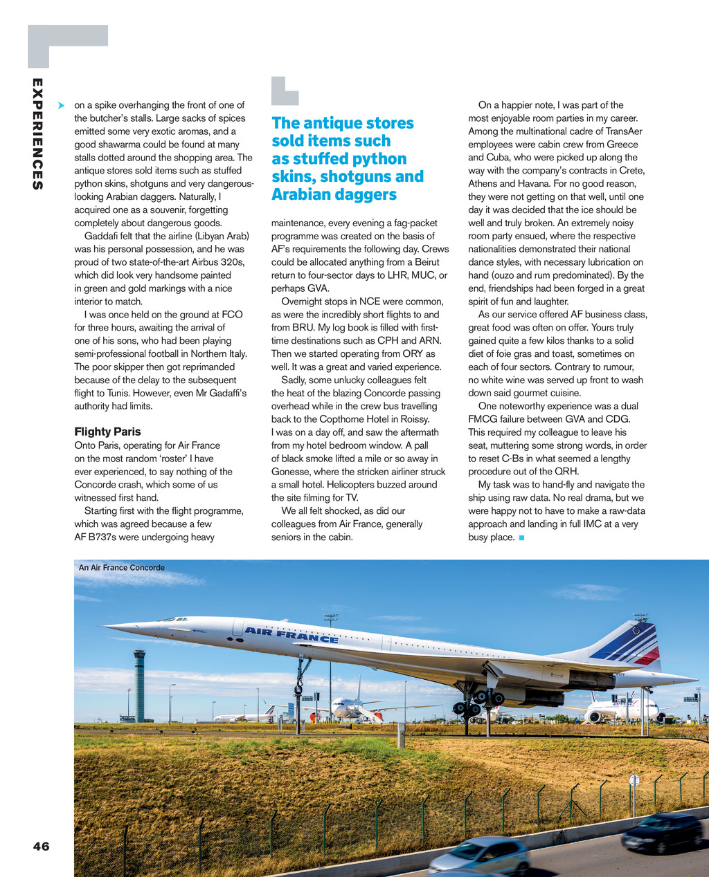 EXPERIENCES on a spike overhanging the front of one of the butchers stalls. Large sacks of spices emitted some very exotic aromas, and a good shawarma could be found at many stalls dotted around the shopping area. The antique stores sold items such as stuffed python skins, shotguns and very dangerouslooking Arabian daggers. Naturally, I acquired one as a souvenir, forgetting completely about dangerous goods. Gaddafi felt that the airline (Libyan Arab) was his personal possession, and he was proud of two state-of-the-art Airbus 320s, which did look very handsome painted in green and gold markings with a nice interior to match. I was once held on the ground at FCO for three hours, awaiting the arrival of one of his sons, who had been playing semi-professional football in Northern Italy. The poor skipper then got reprimanded because of the delay to the subsequent flight to Tunis. However, even Mr Gadaffis authority had limits. Flighty Paris Onto Paris, operating for Air France on the most random roster I have ever experienced, to say nothing of the Concorde crash, which some of us witnessed first hand. Starting first with the flight programme, which was agreed because a few AF B737s were undergoing heavy The antique stores sold items such as stuffed python skins, shotguns and Arabian daggers maintenance, every evening a fag-packet programme was created on the basis of AFs requirements the following day. Crews could be allocated anything from a Beirut return to four-sector days to LHR, MUC, or perhaps GVA. Overnight stops in NCE were common, as were the incredibly short flights to and from BRU. My log book is filled with firsttime destinations such as CPH and ARN. Then we started operating from ORY as well. It was a great and varied experience. Sadly, some unlucky colleagues felt the heat of the blazing Concorde passing overhead while in the crew bus travelling back to the Copthorne Hotel in Roissy. I was on a day off, and saw the aftermath from my hotel bedroom window. A pall of black smoke lifted a mile or so away in Gonesse, where the stricken airliner struck a small hotel. Helicopters buzzed around the site filming for TV. We all felt shocked, as did our colleagues from Air France, generally seniors in the cabin. On a happier note, I was part of the most enjoyable room parties in my career. Among the multinational cadre of TransAer employees were cabin crew from Greece and Cuba, who were picked up along the way with the companys contracts in Crete, Athens and Havana. For no good reason, they were not getting on that well, until one day it was decided that the ice should be well and truly broken. An extremely noisy room party ensued, where the respective nationalities demonstrated their national dance styles, with necessary lubrication on hand (ouzo and rum predominated). By the end, friendships had been forged in a great spirit of fun and laughter. As our service offered AF business class, great food was often on offer. Yours truly gained quite a few kilos thanks to a solid diet of foie gras and toast, sometimes on each of four sectors. Contrary to rumour, no white wine was served up front to wash down said gourmet cuisine. One noteworthy experience was a dual FMCG failure between GVA and CDG. This required my colleague to leave his seat, muttering some strong words, in order to reset C-Bs in what seemed a lengthy procedure out of the QRH. My task was to hand-fly and navigate the ship using raw data. No real drama, but we were happy not to have to make a raw-data approach and landing in full IMC at a very busy place. An Air France Concorde 46 THE LOG Spr 24 pp40-46 Highs and lows.indd 46 16/02/2024 11:14