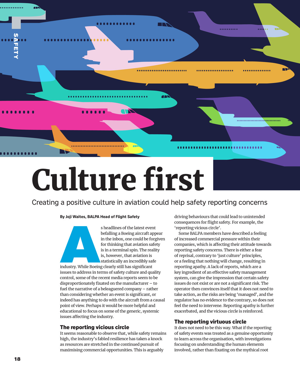 SA F E T Y Culture first Creating a positive culture in aviation could help safety reporting concerns By Joji Waites, BALPA Head of Flight Safety A s headlines of the latest event befalling a Boeing aircraft appear in the inbox, one could be forgiven for thinking that aviation safety is in a terminal spin. The reality is, however, that aviation is statistically an incredibly safe industry. While Boeing clearly still has significant issues to address in terms of safety culture and quality control, some of the recent media reports seem to be disproportionately fixated on the manufacturer to fuel the narrative of a beleaguered company rather than considering whether an event is significant, or indeed has anything to do with the aircraft from a causal point of view. Perhaps it would be more helpful and educational to focus on some of the generic, systemic issues affecting the industry. The reporting vicious circle It seems reasonable to observe that, while safety remains high, the industrys fabled resilience has taken a knock as resources are stretched in the continued pursuit of maximising commercial opportunities. This is arguably driving behaviours that could lead to unintended consequences for flight safety. For example, the reporting vicious circle. Some BALPA members have described a feeling of increased commercial pressure within their companies, which is affecting their attitude towards reporting safety concerns. There is either a fear of reprisal, contrary to just culture principles, or a feeling that nothing will change, resulting in reporting apathy. A lack of reports, which are a key ingredient of an effective safety management system, can give the impression that certain safety issues do not exist or are not a significant risk. The operator then convinces itself that it does not need to take action, as the risks are being managed, and the regulator has no evidence to the contrary, so does not feel the need to intervene. Reporting apathy is further exacerbated, and the vicious circle is reinforced. The reporting virtuous circle It does not need to be this way. What if the reporting of safety events was treated as a genuine opportunity to learn across the organisation, with investigations focusing on understanding the human elements involved, rather than fixating on the mythical root 18 THE LOG Sum 24 pp18-19 Vicious or virtuous reporting circle.indd 18 13/06/2024 13:00