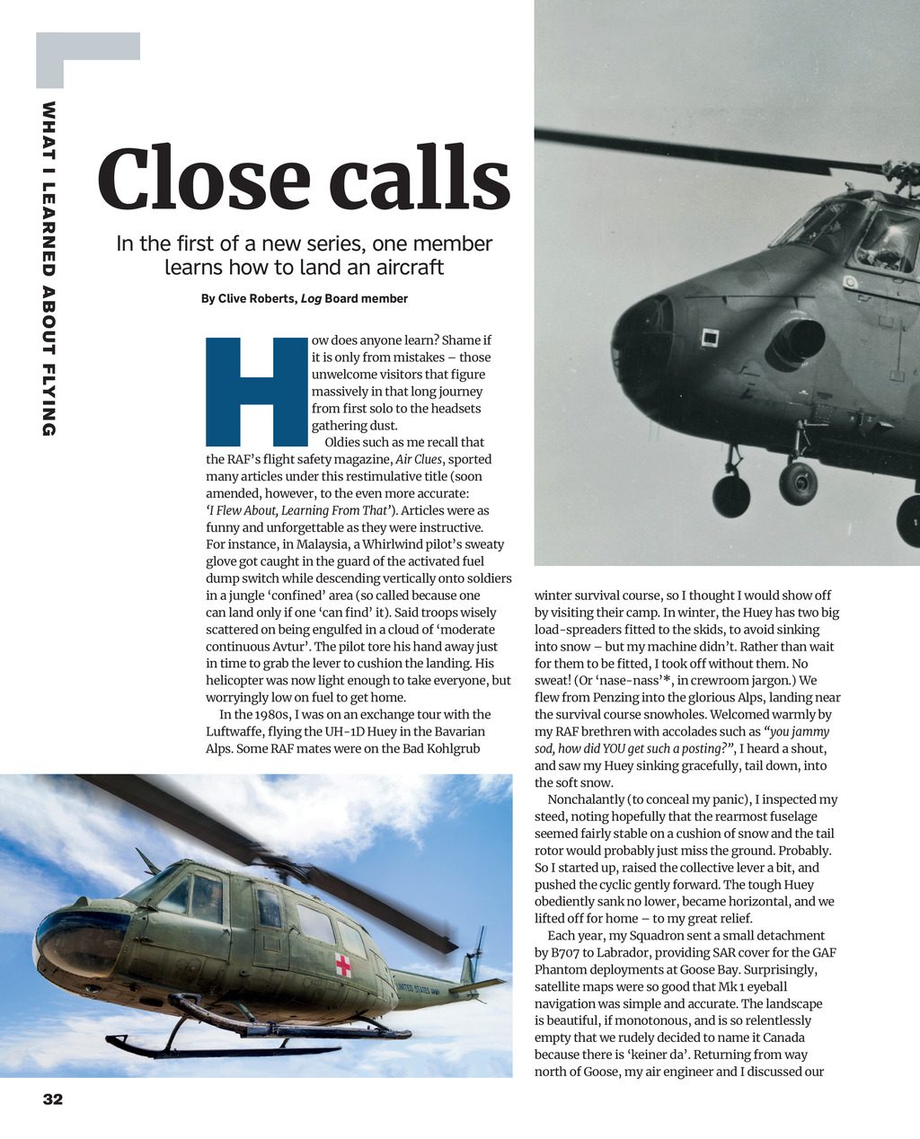 W H AT I L E A R N E D A B O U T F LY I N G Close calls In the first of a new series, one member learns how to land an aircraft By Clive Roberts, Log Board member H ow does anyone learn? Shame if it is only from mistakes those unwelcome visitors that figure massively in that long journey from first solo to the headsets gathering dust. Oldies such as me recall that the RAFs flight safety magazine, Air Clues, sported many articles under this restimulative title (soon amended, however, to the even more accurate: I Flew About, Learning From That). Articles were as funny and unforgettable as they were instructive. For instance, in Malaysia, a Whirlwind pilots sweaty glove got caught in the guard of the activated fuel dump switch while descending vertically onto soldiers in a jungle confined area (so called because one can land only if one can find it). Said troops wisely scattered on being engulfed in a cloud of moderate continuous Avtur. The pilot tore his hand away just in time to grab the lever to cushion the landing. His helicopter was now light enough to take everyone, but worryingly low on fuel to get home. In the 1980s, I was on an exchange tour with the Luftwaffe, flying the UH-1D Huey in the Bavarian Alps. Some RAF mates were on the Bad Kohlgrub winter survival course, so I thought I would show off by visiting their camp. In winter, the Huey has two big load-spreaders fitted to the skids, to avoid sinking into snow but my machine didnt. Rather than wait for them to be fitted, I took off without them. No sweat! (Or nase-nass*, in crewroom jargon.) We flew from Penzing into the glorious Alps, landing near the survival course snowholes. Welcomed warmly by my RAF brethren with accolades such as you jammy sod, how did YOU get such a posting?, I heard a shout, and saw my Huey sinking gracefully, tail down, into the soft snow. Nonchalantly (to conceal my panic), I inspected my steed, noting hopefully that the rearmost fuselage seemed fairly stable on a cushion of snow and the tail rotor would probably just miss the ground. Probably. So I started up, raised the collective lever a bit, and pushed the cyclic gently forward. The tough Huey obediently sank no lower, became horizontal, and we lifted off for home to my great relief. Each year, my Squadron sent a small detachment by B707 to Labrador, providing SAR cover for the GAF Phantom deployments at Goose Bay. Surprisingly, satellite maps were so good that Mk 1 eyeball navigation was simple and accurate. The landscape is beautiful, if monotonous, and is so relentlessly empty that we rudely decided to name it Canada because there is keiner da. Returning from way north of Goose, my air engineer and I discussed our 32 THE LOG Sum 24 pp32-33 What I learned about flying.indd 32 13/06/2024 13:41
