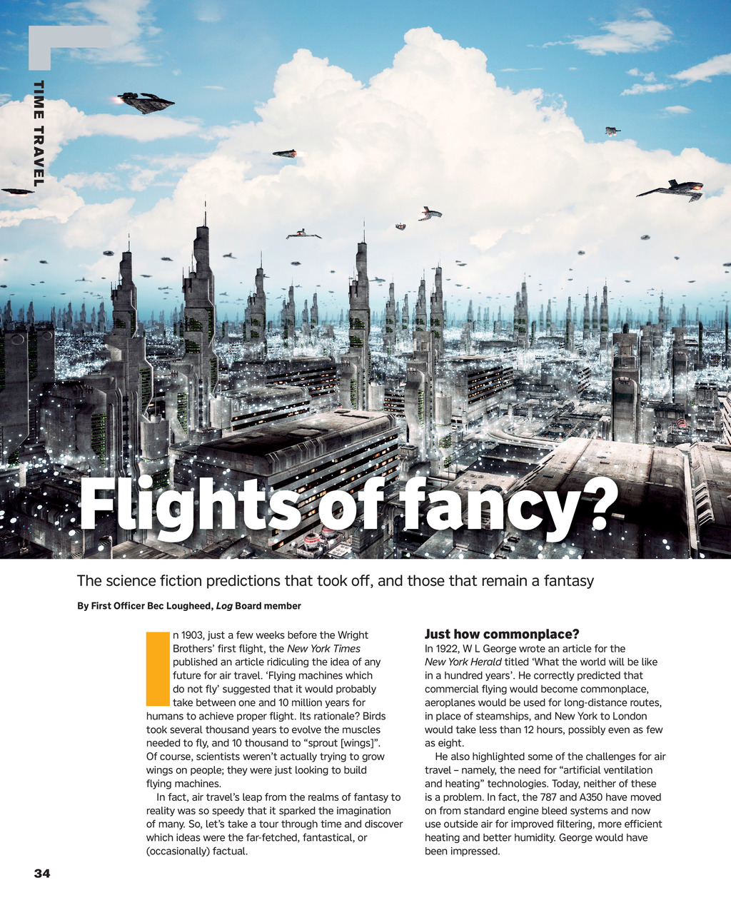 T I M E T R AV E L Flights of fancy? The science fiction predictions that took off, and those that remain a fantasy By First Officer Bec Lougheed, Log Board member I n 1903, just a few weeks before the Wright Brothers first flight, the New York Times published an article ridiculing the idea of any future for air travel. Flying machines which do not fly suggested that it would probably take between one and 10 million years for humans to achieve proper flight. Its rationale? Birds took several thousand years to evolve the muscles needed to fly, and 10 thousand to sprout [wings]. Of course, scientists werent actually trying to grow wings on people; they were just looking to build flying machines. In fact, air travels leap from the realms of fantasy to reality was so speedy that it sparked the imagination of many. So, lets take a tour through time and discover which ideas were the far-fetched, fantastical, or (occasionally) factual. Just how commonplace? In 1922, W L George wrote an article for the New York Herald titled What the world will be like in a hundred years. He correctly predicted that commercial flying would become commonplace, aeroplanes would be used for long-distance routes, in place of steamships, and New York to London would take less than 12 hours, possibly even as few as eight. He also highlighted some of the challenges for air travel namely, the need for artificial ventilation and heating technologies. Today, neither of these is a problem. In fact, the 787 and A350 have moved on from standard engine bleed systems and now use outside air for improved filtering, more efficient heating and better humidity. George would have been impressed. 34 THE LOG Sum 24 pp34-39 Time Travel.indd 34 13/06/2024 12:41