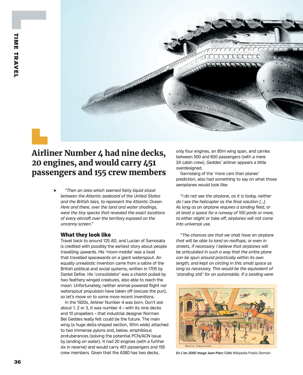 T I M E T R AV E L Airliner Number 4 had nine decks, 20 engines, and would carry 451 passengers and 155 crew members Then an area which seemed fairly liquid stood between the Atlantic seaboard of the United States and the British Isles, to represent the Atlantic Ocean. Here and there, over the land and water shadings, were the tiny specks that revealed the exact locations of every aircraft over the territory exposed on the uncanny screen. What they look like Travel back to around 125 AD, and Lucan of Samosata is credited with possibly the earliest story about people travelling upwards. His moon-mobile was a boat that travelled spacewards on a giant waterspout. An equally unrealistic invention came from a satire of the British political and social systems, written in 1705 by Daniel Defoe. His consolidator was a chariot pulled by two feathery winged creatures, also able to reach the moon. Unfortunately, neither animal-powered flight nor waterspout propulsion have taken off (excuse the pun), so lets move on to some more recent inventions. In the 1920s, Airliner Number 4 was born. Dont ask about 1, 2 or 3, it was number 4 with its nine decks and 10 propellers that industrial designer Norman Bel Geddes really felt could be the future. The main wing (a huge delta-shaped section, 161m wide) attached to two immense pylons and, below, amphibious protuberances (solving the potential PCN/ACN issue by landing on water). It had 20 engines (with a further six in reserve) and would carry 451 passengers and 155 crew members. Given that the A380 has two decks, only four engines, an 80m wing span, and carries between 500 and 600 passengers (with a mere 24 cabin crew), Geddes airliner appears a little overdesigned. Gernsberg of the more cars than planes prediction, also had something to say on what those aeroplanes would look like: I do not see the airplane, as it is today, neither do I see the helicopter as the final solution []. As long as an airplane requires a landing field, or at least a space for a runway of 100 yards or more, to either alight or take off, airplanes will not come into universal use. The chances are that we shall have an airplane that will be able to land on rooftops, or even in streets, if necessary. I believe that airplanes will be articulated in such a way that the entire plane can be spun around practically within its own length, and kept on circling in this small space as long as necessary. This would be the equivalent of standing still for an automobile. If a landing were En Lan 2000 image Jean-Marc Ct Wikipedia Public Domain 36 THE LOG Sum 24 pp34-39 Time Travel.indd 36 13/06/2024 12:41
