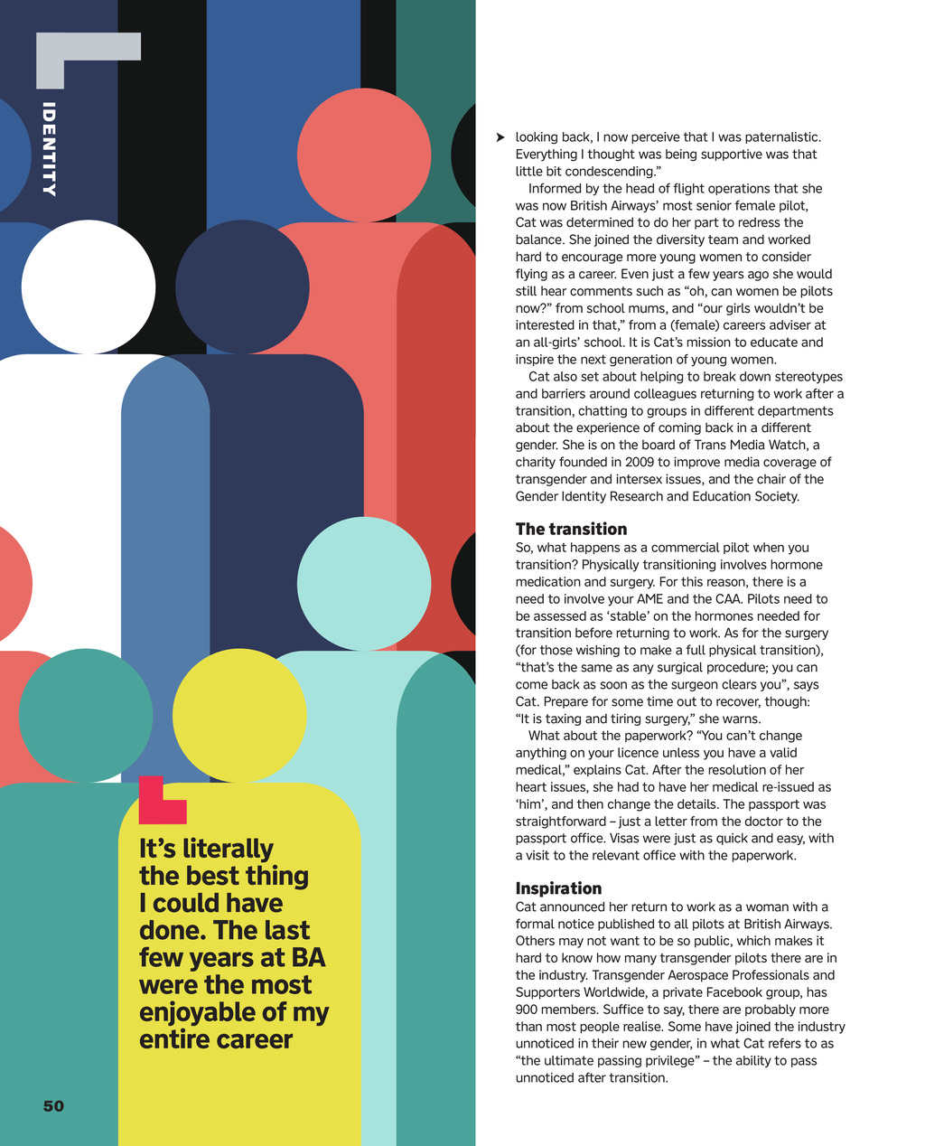 IDENTITY looking back, I now perceive that I was paternalistic. Everything I thought was being supportive was that little bit condescending. Informed by the head of flight operations that she was now British Airways most senior female pilot, Cat was determined to do her part to redress the balance. She joined the diversity team and worked hard to encourage more young women to consider flying as a career. Even just a few years ago she would still hear comments such as oh, can women be pilots now? from school mums, and our girls wouldnt be interested in that, from a (female) careers adviser at an all-girls school. It is Cats mission to educate and inspire the next generation of young women. Cat also set about helping to break down stereotypes and barriers around colleagues returning to work after a transition, chatting to groups in different departments about the experience of coming back in a different gender. She is on the board of Trans Media Watch, a charity founded in 2009 to improve media coverage of transgender and intersex issues, and the chair of the Gender Identity Research and Education Society. The transition Its literally the best thing I could have done. The last few years at BA were the most enjoyable of my entire career So, what happens as a commercial pilot when you transition? Physically transitioning involves hormone medication and surgery. For this reason, there is a need to involve your AME and the CAA. Pilots need to be assessed as stable on the hormones needed for transition before returning to work. As for the surgery (for those wishing to make a full physical transition), thats the same as any surgical procedure; you can come back as soon as the surgeon clears you, says Cat. Prepare for some time out to recover, though: It is taxing and tiring surgery, she warns. What about the paperwork? You cant change anything on your licence unless you have a valid medical, explains Cat. After the resolution of her heart issues, she had to have her medical re-issued as him, and then change the details. The passport was straightforward just a letter from the doctor to the passport office. Visas were just as quick and easy, with a visit to the relevant office with the paperwork. Inspiration Cat announced her return to work as a woman with a formal notice published to all pilots at British Airways. Others may not want to be so public, which makes it hard to know how many transgender pilots there are in the industry. Transgender Aerospace Professionals and Supporters Worldwide, a private Facebook group, has 900 members. Suffice to say, there are probably more than most people realise. Some have joined the industry unnoticed in their new gender, in what Cat refers to as the ultimate passing privilege the ability to pass unnoticed after transition. 50 THE LOG Sum 24 pp48-51 Transgender Pilots.indd 50 13/06/2024 12:32