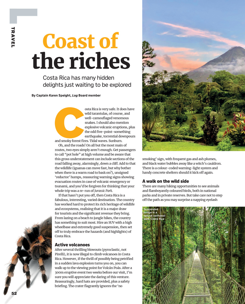 T R AV E L Coast of the riches Costa Rica has many hidden delights just waiting to be explored By Captain Karen Speight, Log Board member C osta Rica is very safe. It does have wild tarantulas, of course, and well-camouflaged venomous snakes. I should also mention explosive volcanic eruptions, plus the odd five-point-something earthquake, torrential downpours and smoky forest fires. Tidal waves. Sunburn. Oh, and the roads! On all but the most main of routes, two eyes simply arent enough. Get passengers to call pot hole at high volume and be aware that this gross understatement can include sections of the road falling away, alarmingly, down a cliff. Add to that the wildlife (iguanas can move fast, but why bother when there is a warm road to bask on?), unsigned reductor humps, reassuring warning signs showing evacuation routes in case of volcanic emergency or tsunami, and youd be forgiven for thinking that your whole trip was a re-run of Jurassic Park. If that hasnt put you off, then Costa Rica is a fabulous, interesting, varied destination. The country has worked hard to protect its rich heritage of wildlife and ecosystems, realising that it is a major draw for tourists and the significant revenue they bring. From lazing on a beach to jungle hikes, the country has something to suit most. Hire an SUV with a high wheelbase and extremely good suspension, then set off to truly embrace the hazards (and highlights) of Costa Rica. smoking sign, with frequent gas and ash plumes, and black water bubbles away like a witchs cauldron. There is a colour-coded warning-light system and handy concrete shelters should it kick off again. A walk on the wild side There are many hiking opportunities to see animals and flamboyantly coloured birds, both in national parks and in private reserves. But take care not to step off the path as you may surprise a napping eyelash Suspended bridge in a natural rainforest park, Costa Rica Active volcanoes After several thrilling blowouts (pyroclastic, not Pirelli), it is now illegal to climb volcanoes in Costa Rica. However, if the thrill of possibly being petrified in a sudden lava explosion turns you on, you can walk up to the viewing point for Volcn Pos. After a 300m eruptive event two weeks before our visit, Im sure you will appreciate the daring of this venture. Reassuringly, hard hats are provided, plus a safety briefing. The crater flagrantly ignores the no 52 THE LOG Sum 24 pp52-54 Costa Rica.indd 52 13/06/2024 12:28