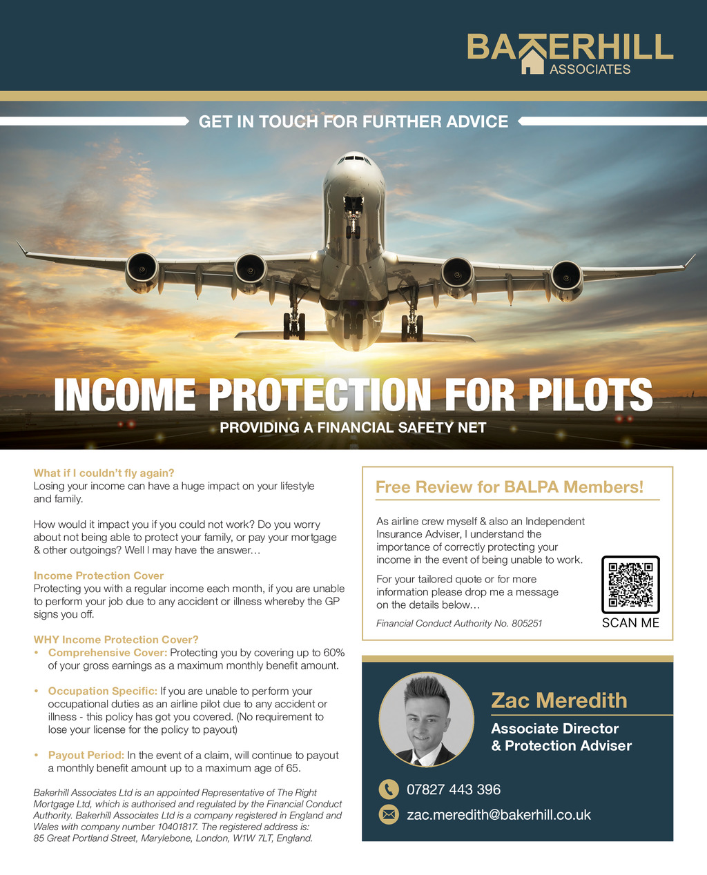 GET IN TOUCH FOR FURTHER ADVICE INCOME PROTECTION FOR PILOTS PROVIDING A FINANCIAL SAFETY NET What if I couldnt fly again? Losing your income can have a huge impact on your lifestyle and family. Free Review for BALPA Members! How would it impact you if you could not work? Do you worry about not being able to protect your family, or pay your mortgage & other outgoings? Well I may have the answer As airline crew myself & also an Independent Insurance Adviser, I understand the importance of correctly protecting your income in the event of being unable to work. Income Protection Cover Protecting you with a regular income each month, if you are unable to perform your job due to any accident or illness whereby the GP signs you off. For your tailored quote or for more information please drop me a message on the details below Financial Conduct Authority No. 805251 WHY Income Protection Cover? y Comprehensive Cover: Protecting you by covering up to 60% of your gross earnings as a maximum monthly benefit amount. y Occupation Specific: If you are unable to perform your occupational duties as an airline pilot due to any accident or illness - this policy has got you covered. (No requirement to lose your license for the policy to payout) y Payout Period: In the event of a claim, will continue to payout a monthly benefit amount up to a maximum age of 65. Zac Meredith Associate Director & Protection Adviser Bakerhill Associates Ltd is an appointed Representative of The Right Mortgage Ltd, which is authorised and regulated by the Financial Conduct Authority. Bakerhill Associates Ltd is a company registered in England and Wales with company number 10401817. The registered address is: 85 Great Portland Street, Marylebone, London, W1W 7LT, England. THE LOG Sum 24 pp06-07 News.indd 6 13/06/2024 12:59