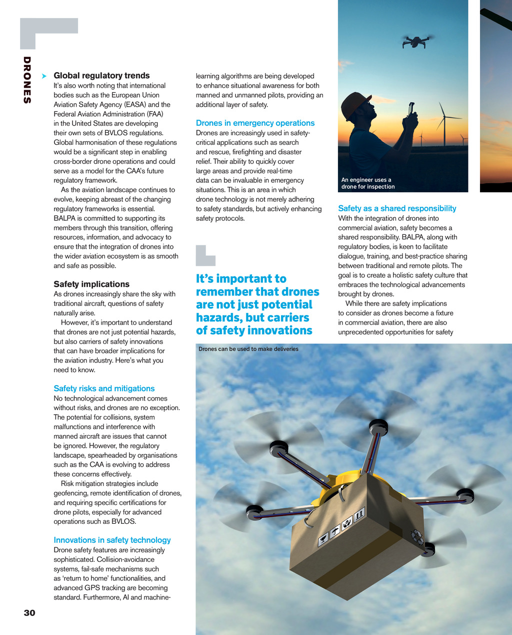 DRONES Global regulatory trends Its also worth noting that international bodies such as the European Union Aviation Safety Agency (EASA) and the Federal Aviation Administration (FAA) in the United States are developing their own sets of BVLOS regulations. Global harmonisation of these regulations would be a significant step in enabling cross-border drone operations and could serve as a model for the CAAs future regulatory framework. As the aviation landscape continues to evolve, keeping abreast of the changing regulatory frameworks is essential. BALPA is committed to supporting its members through this transition, offering resources, information, and advocacy to ensure that the integration of drones into the wider aviation ecosystem is as smooth and safe as possible. Safety implications As drones increasingly share the sky with traditional aircraft, questions of safety naturally arise. However, its important to understand that drones are not just potential hazards, but also carriers of safety innovations that can have broader implications for the aviation industry. Heres what you need to know. learning algorithms are being developed to enhance situational awareness for both manned and unmanned pilots, providing an additional layer of safety. Drones in emergency operations Drones are increasingly used in safetycritical applications such as search and rescue, firefighting and disaster relief. Their ability to quickly cover large areas and provide real-time data can be invaluable in emergency situations. This is an area in which drone technology is not merely adhering to safety standards, but actively enhancing safety protocols. Its important to remember that drones are not just potential hazards, but carriers of safety innovations An engineer uses a drone for inspection Safety as a shared responsibility With the integration of drones into commercial aviation, safety becomes a shared responsibility. BALPA, along with regulatory bodies, is keen to facilitate dialogue, training, and best-practice sharing between traditional and remote pilots. The goal is to create a holistic safety culture that embraces the technological advancements brought by drones. While there are safety implications to consider as drones become a fixture in commercial aviation, there are also unprecedented opportunities for safety Drones can be used to make deliveries Safety risks and mitigations No technological advancement comes without risks, and drones are no exception. The potential for collisions, system malfunctions and interference with manned aircraft are issues that cannot be ignored. However, the regulatory landscape, spearheaded by organisations such as the CAA is evolving to address these concerns effectively. Risk mitigation strategies include geofencing, remote identification of drones, and requiring specific certifications for drone pilots, especially for advanced operations such as BVLOS. Innovations in safety technology Drone safety features are increasingly sophisticated. Collision-avoidance systems, fail-safe mechanisms such as return to home functionalities, and advanced GPS tracking are becoming standard. Furthermore, AI and machine- 30 THE LOG Win 24 pp26-32 Drones.indd 30 01/12/2023 14:49