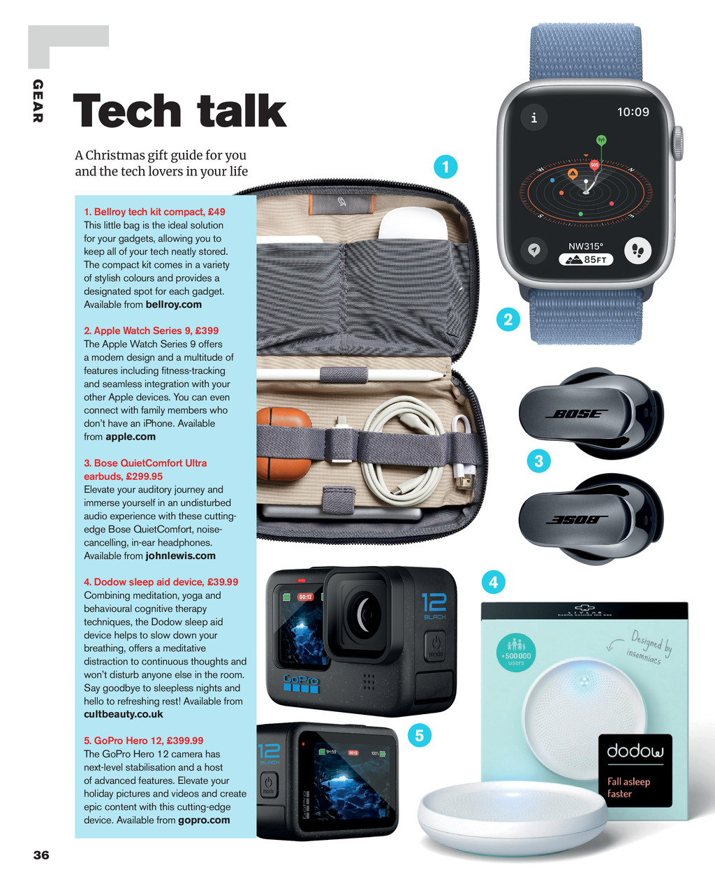 GEAR Tech talk A Christmas gift guide for you and the tech lovers in your life 1 1. Bellroy tech kit compact, 49 This little bag is the ideal solution for your gadgets, allowing you to keep all of your tech neatly stored. The compact kit comes in a variety of stylish colours and provides a designated spot for each gadget. Available from bellroy.com 2 2. Apple Watch Series 9, 399 The Apple Watch Series 9 offers a modern design and a multitude of features including fitness-tracking and seamless integration with your other Apple devices. You can even connect with family members who dont have an iPhone. Available from apple.com 3 3. Bose QuietComfort Ultra earbuds, 299.95 Elevate your auditory journey and immerse yourself in an undisturbed audio experience with these cuttingedge Bose QuietComfort, noisecancelling, in-ear headphones. Available from johnlewis.com 4 4. Dodow sleep aid device, 39.99 Combining meditation, yoga and behavioural cognitive therapy techniques, the Dodow sleep aid device helps to slow down your breathing, offers a meditative distraction to continuous thoughts and wont disturb anyone else in the room. Say goodbye to sleepless nights and hello to refreshing rest! Available from cultbeauty.co.uk 5. GoPro Hero 12, 399.99 The GoPro Hero 12 camera has next-level stabilisation and a host of advanced features. Elevate your holiday pictures and videos and create epic content with this cutting-edge device. Available from gopro.com 5 36 THE LOG Win 24 pp36-37 Gear.indd 36 01/12/2023 14:52