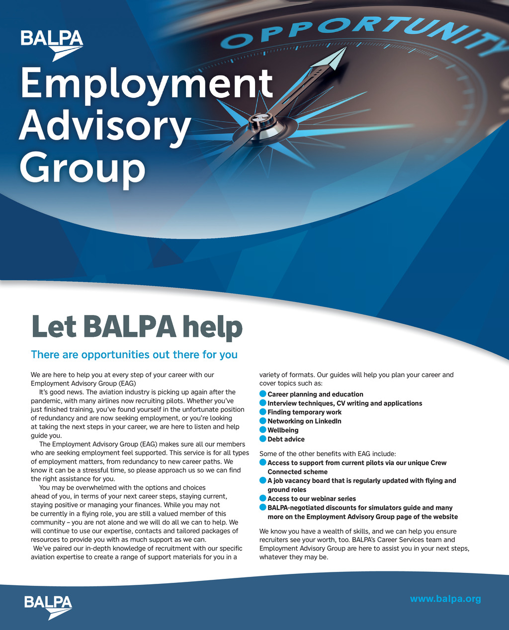 Let BALPA help There are opportunities out there for you We are here to help you at every step of your career with our Employment Advisory Group (EAG) Its good news. The aviation industry is picking up again after the pandemic, with many airlines now recruiting pilots. Whether youve just finished training, youve found yourself in the unfortunate position of redundancy and are now seeking employment, or youre looking at taking the next steps in your career, we are here to listen and help guide you. The Employment Advisory Group (EAG) makes sure all our members who are seeking employment feel supported. This service is for all types of employment matters, from redundancy to new career paths. We know it can be a stressful time, so please approach us so we can find the right assistance for you. You may be overwhelmed with the options and choices ahead of you, in terms of your next career steps, staying current, staying positive or managing your finances. While you may not be currently in a flying role, you are still a valued member of this community you are not alone and we will do all we can to help. We will continue to use our expertise, contacts and tailored packages of resources to provide you with as much support as we can. Weve paired our in-depth knowledge of recruitment with our specific aviation expertise to create a range of support materials for you in a variety of formats. Our guides will help you plan your career and cover topics such as: Career planning and education Interview techniques, CV writing and applications Finding temporary work Networking on LinkedIn Wellbeing Debt advice Some of the other benefits with EAG include: Access to support from current pilots via our unique Crew Connected scheme A job vacancy board that is regularly updated with flying and ground roles Access to our webinar series BALPA-negotiated discounts for simulators guide and many more on the Employment Advisory Group page of the website We know you have a wealth of skills, and we can help you ensure recruiters see your worth, too. BALPAs Career Services team and Employment Advisory Group are here to assist you in your next steps, whatever they may be. www.balpa.org THE LOG Win 24 pp38 EAG AD.indd 38 01/12/2023 14:53
